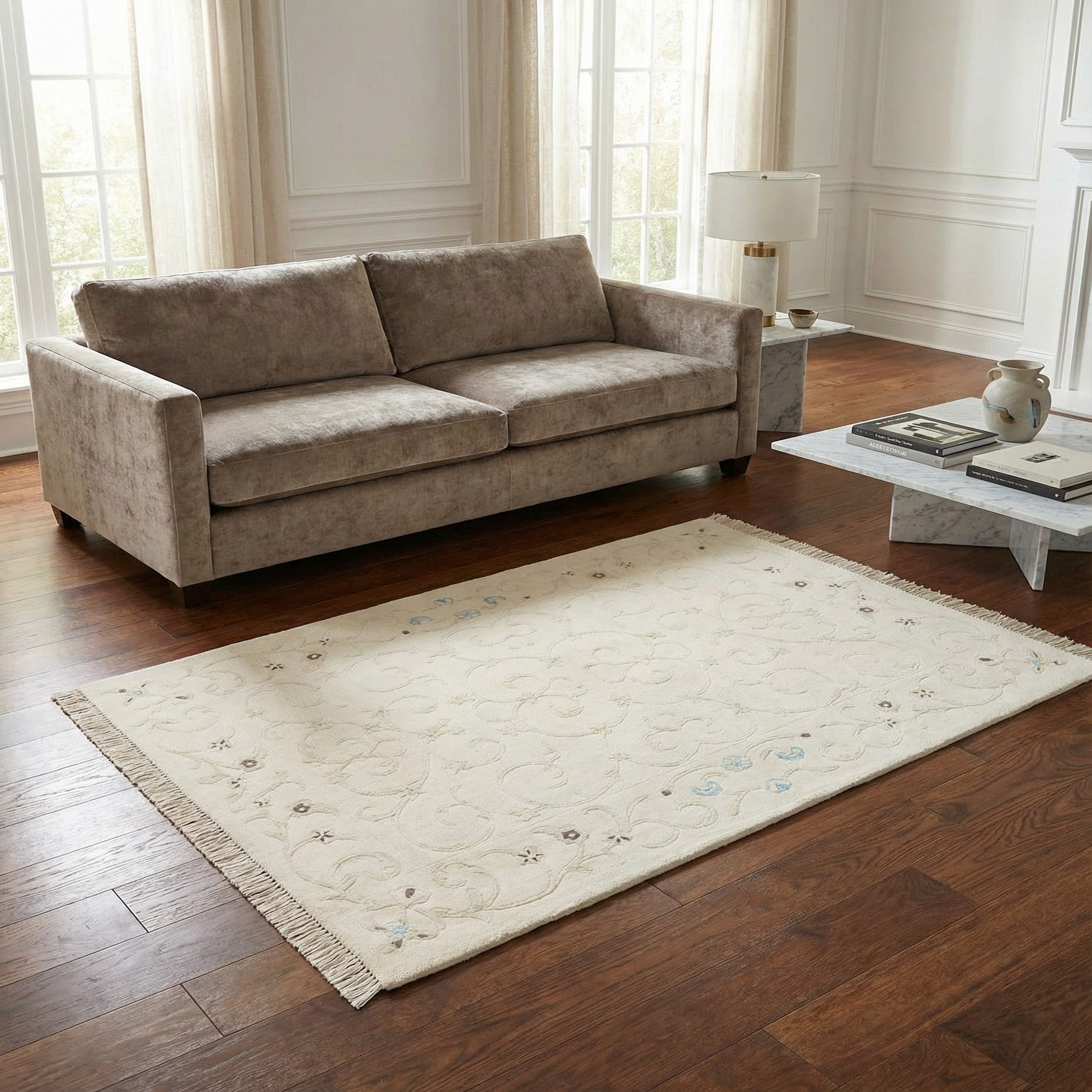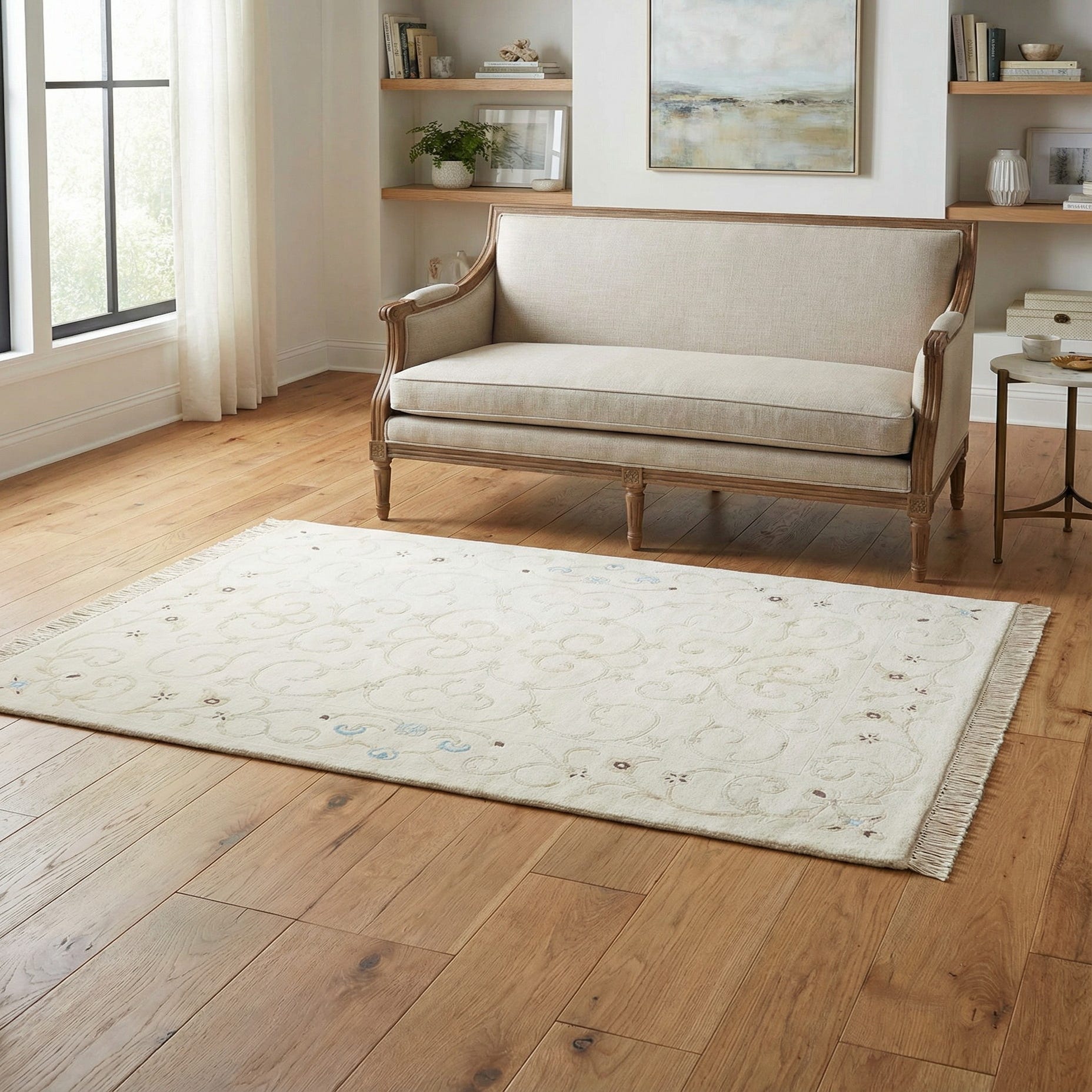 This Darya collection rug showcases a graceful pattern with subtle floral elements, accented with hints of brown and light blue on a cream background, offering a serene addition to any space it adorns. The hand-made construction of wool and cotton creates a texturally inviting surface, while the rug's fringe edges add a touch of traditional charm. The size of 3x5 renders it versatile for a range of spaces, such as under a coffee table, in a small seating area, or beside a bed in a guest room. This piece's understated color scheme and elegant design make it a suitable complement to both contemporary and classic interiors, effortlessly enhancing minimalist, Scandinavian, or shabby chic decor.