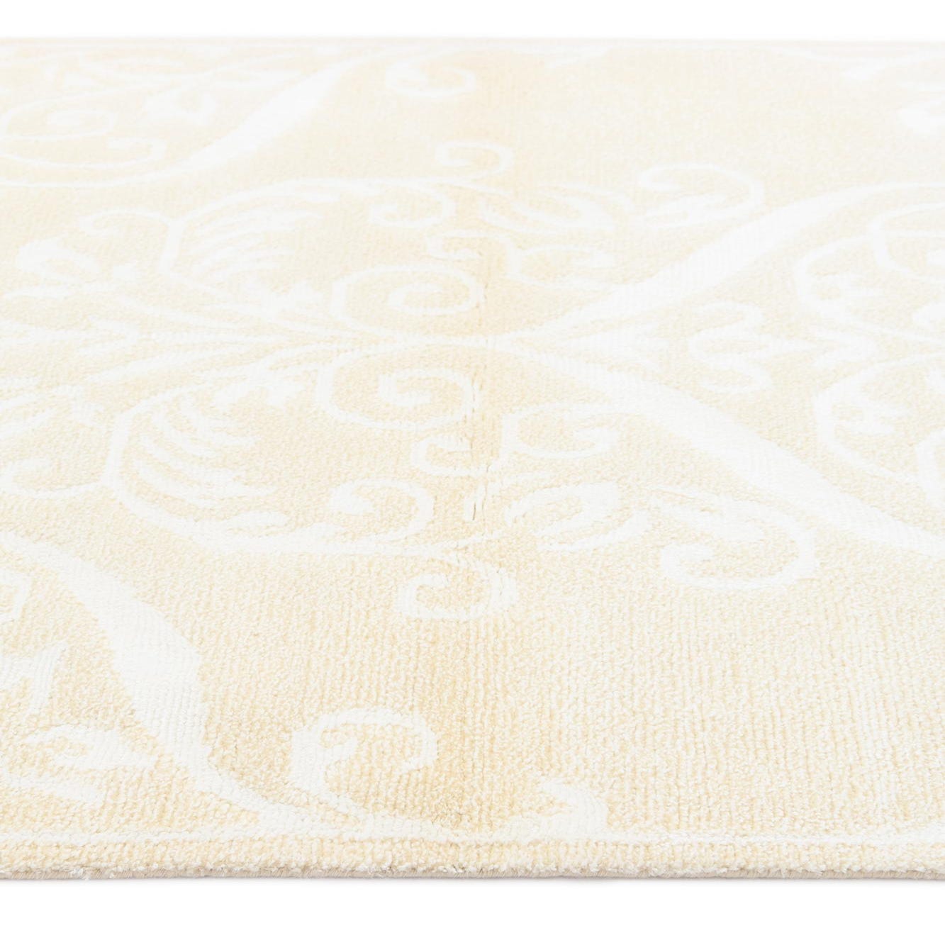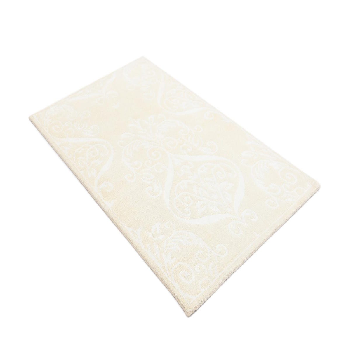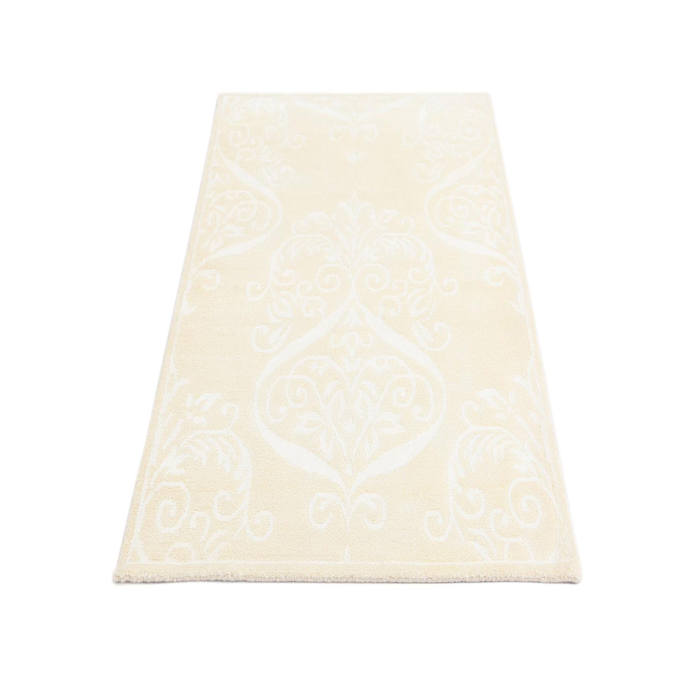 A rectangular 3x5 ivory and cream modern rug with an elegant damask pattern, suitable for an indoor living space.