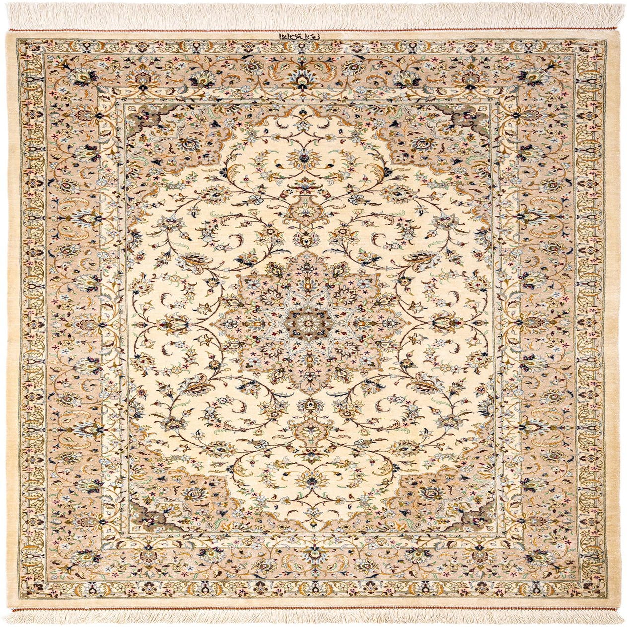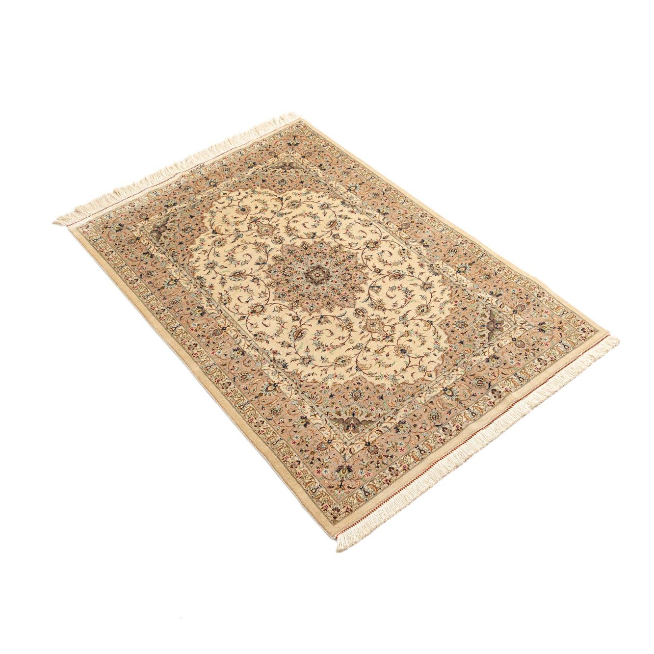 A 3x5 rectangular ivory Persian silk rug with an intricate floral medallion pattern and fringed ends.