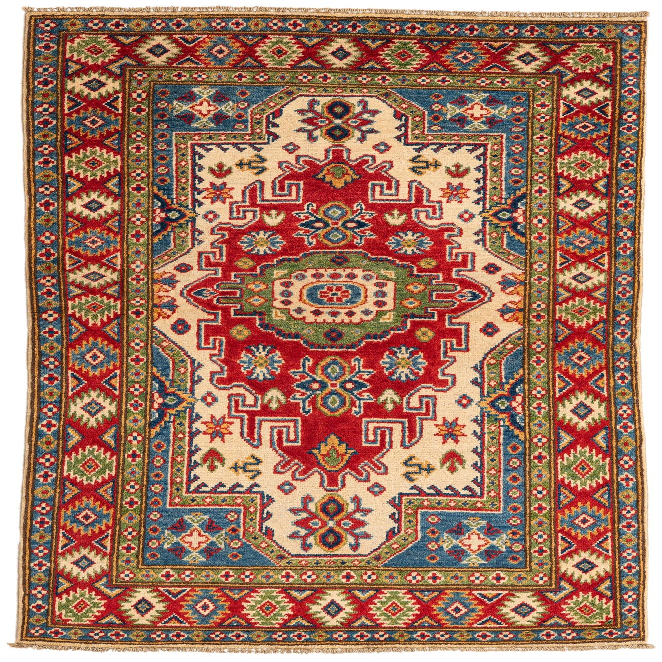 This Kazak collection rug is a 3x5 hand-knotted piece crafted from 100% hand-spun wool, offering a sturdy texture underfoot. The color palette includes a cream background with patterns in blue, brown, gold, green, navy blue, and red, providing a vibrant yet balanced visual presence. The rug features traditional geometric patterns and motifs that exude an ornamental aesthetic, complete with a classic fringe edge that adds to its authentic character.