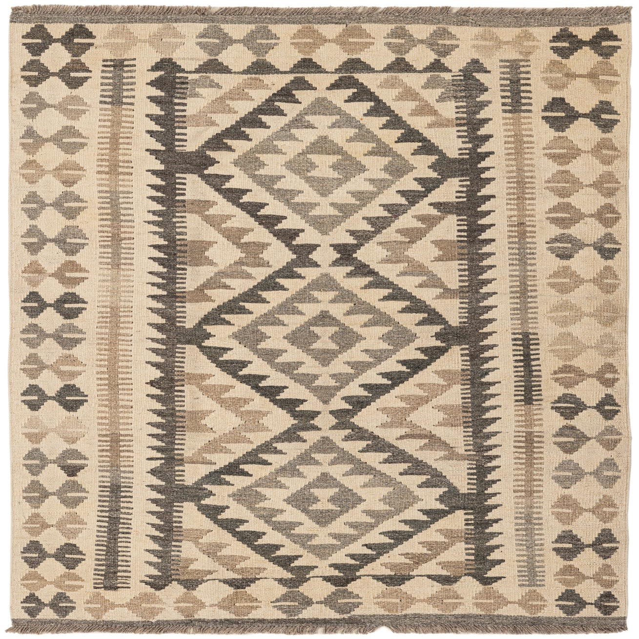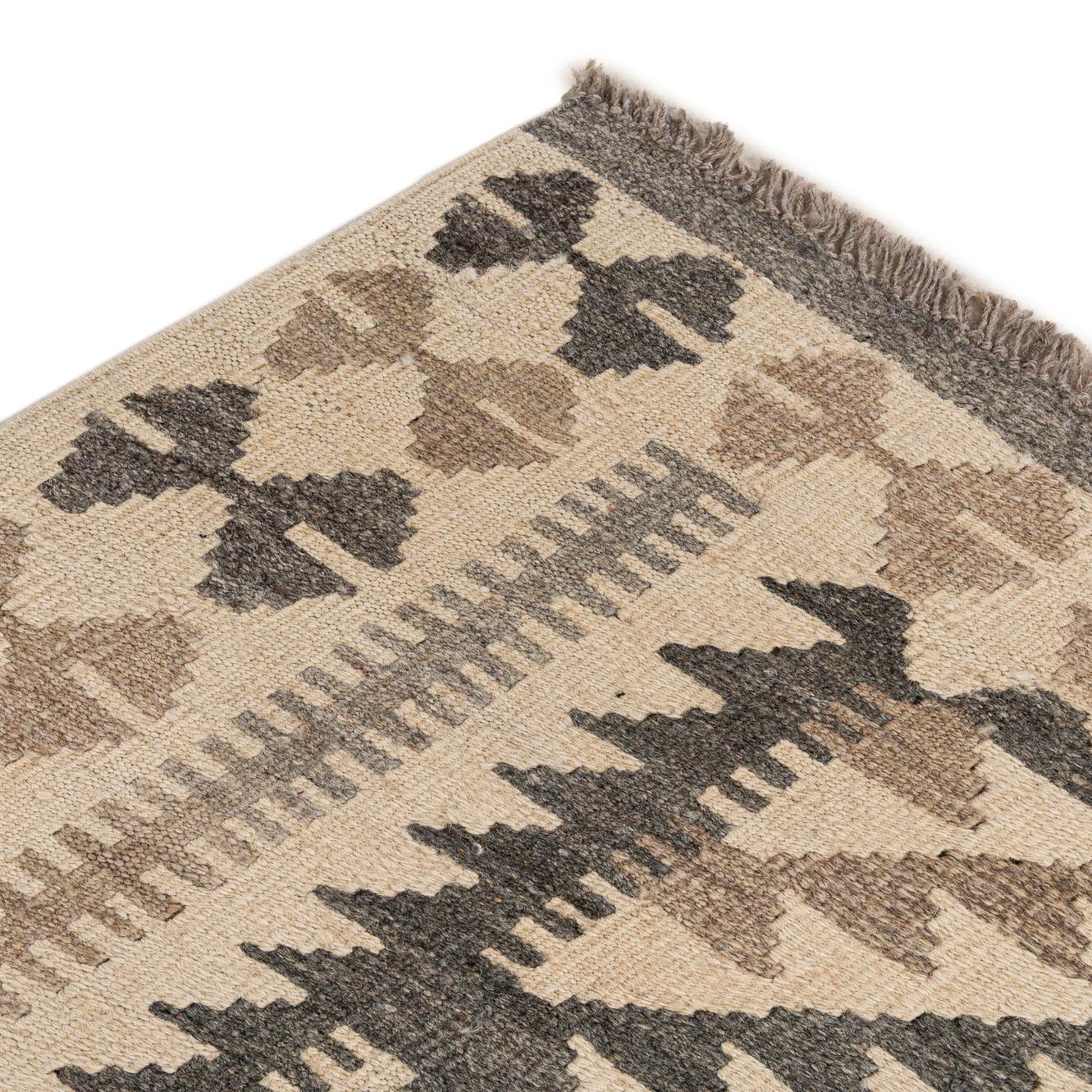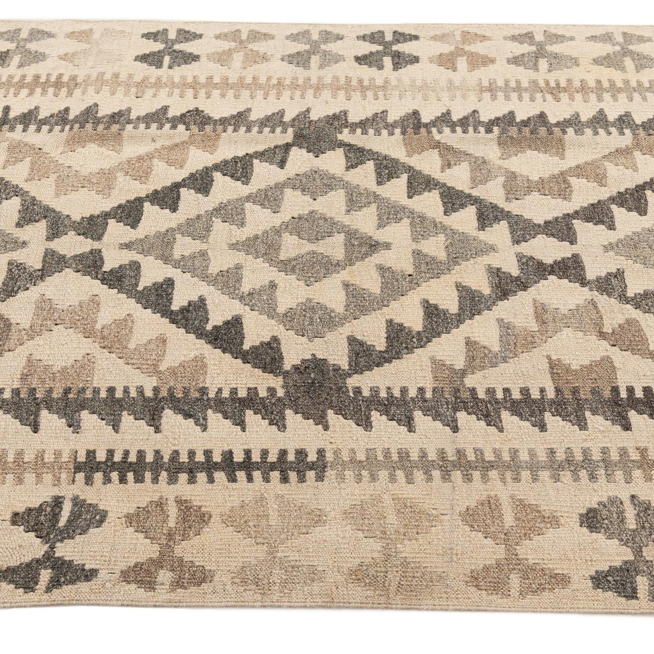 A 3x5 rectangular Kilim Maymana rug with a tribal geometric pattern in ivory, cream, and shades of gray and brown.