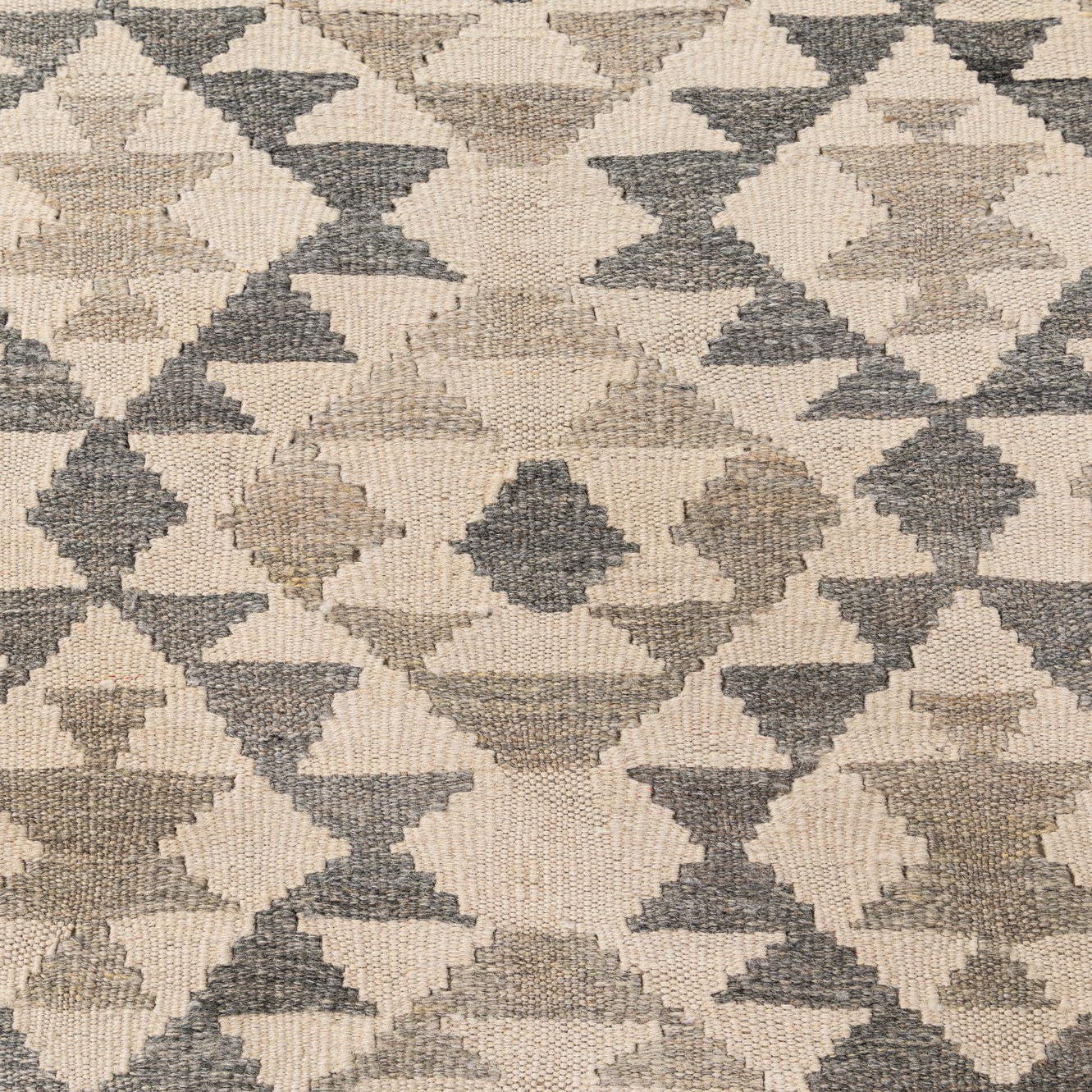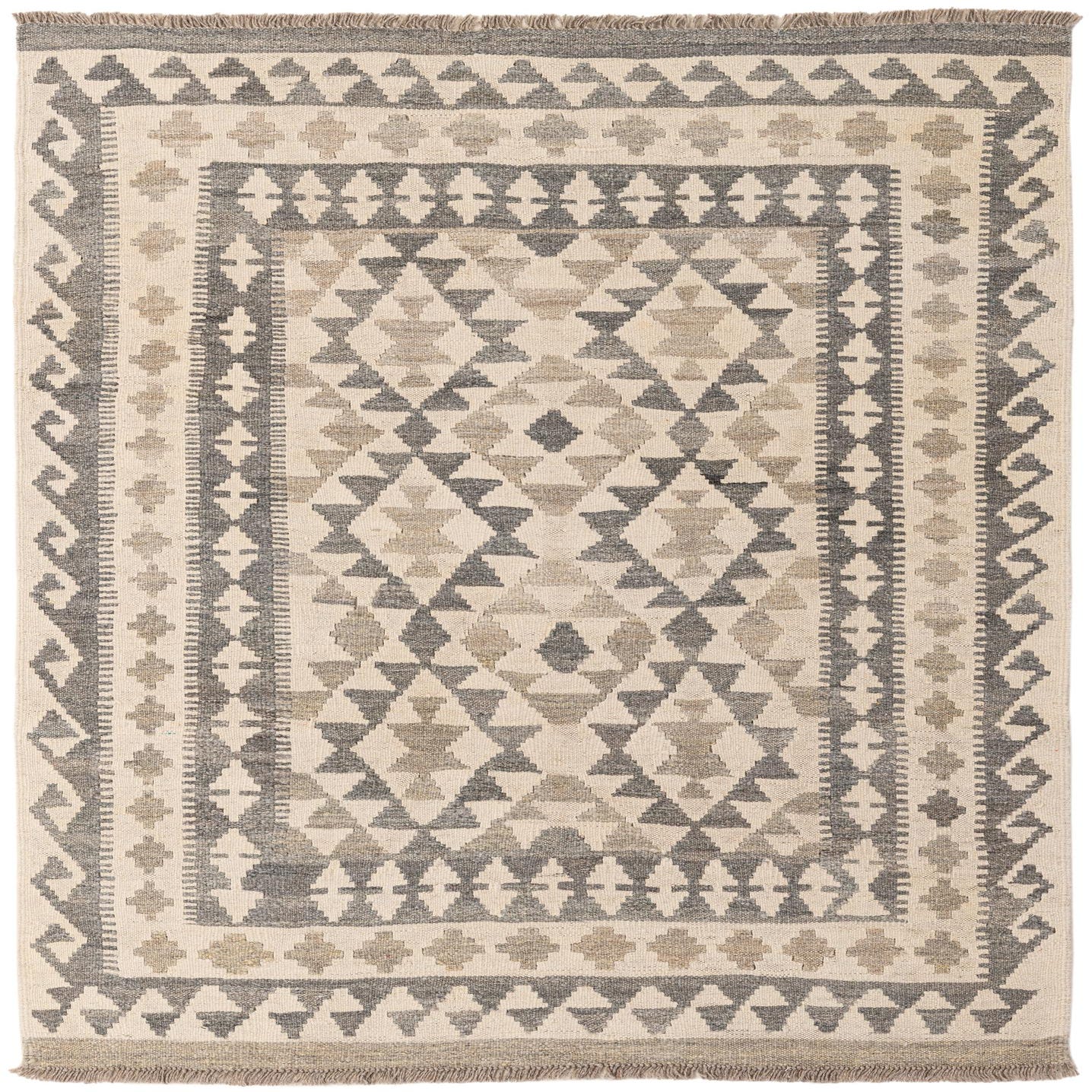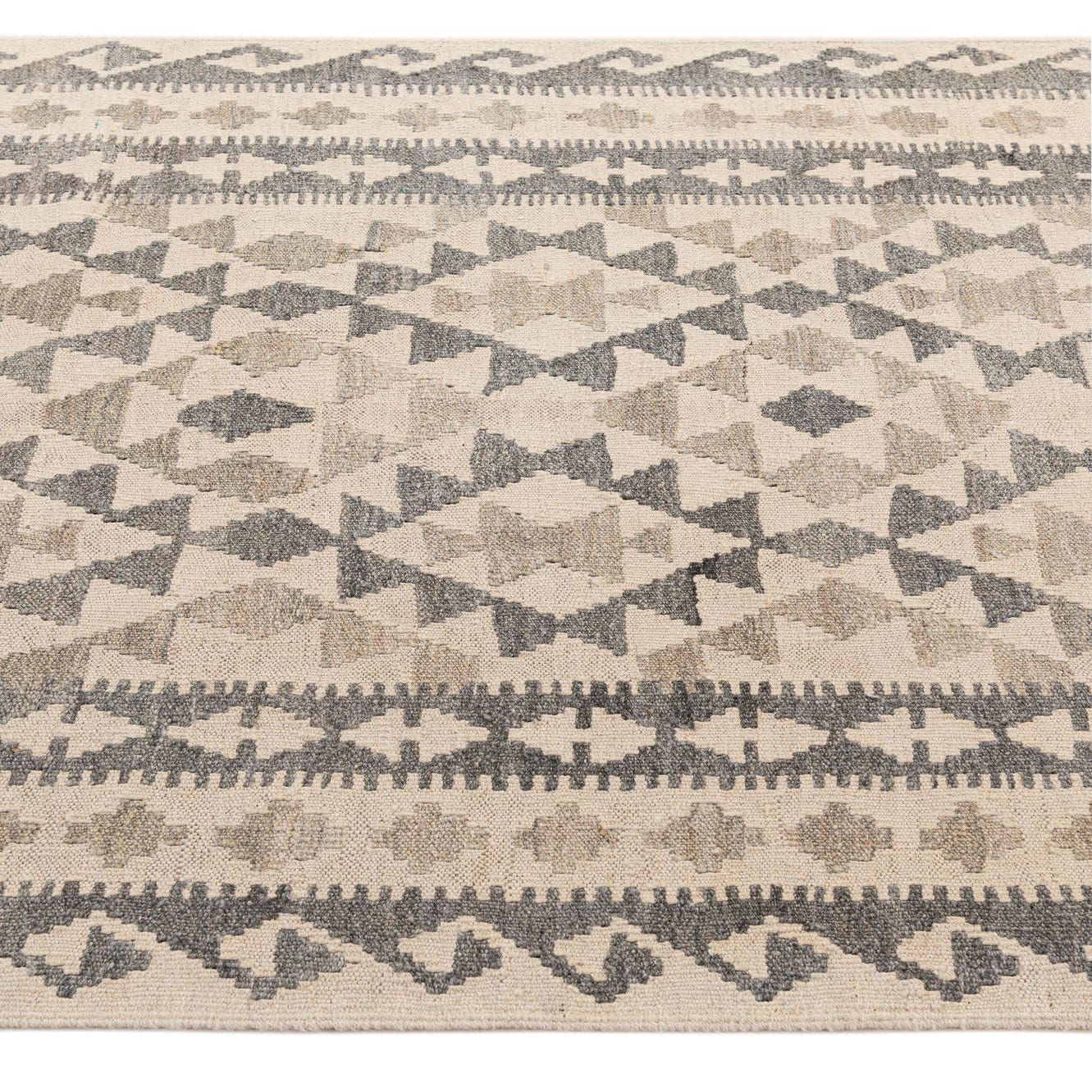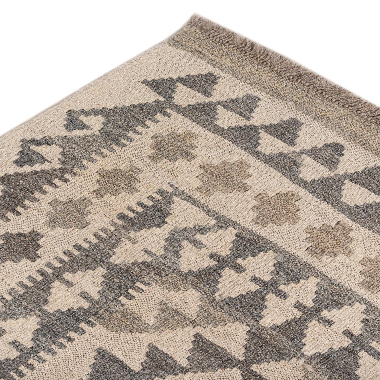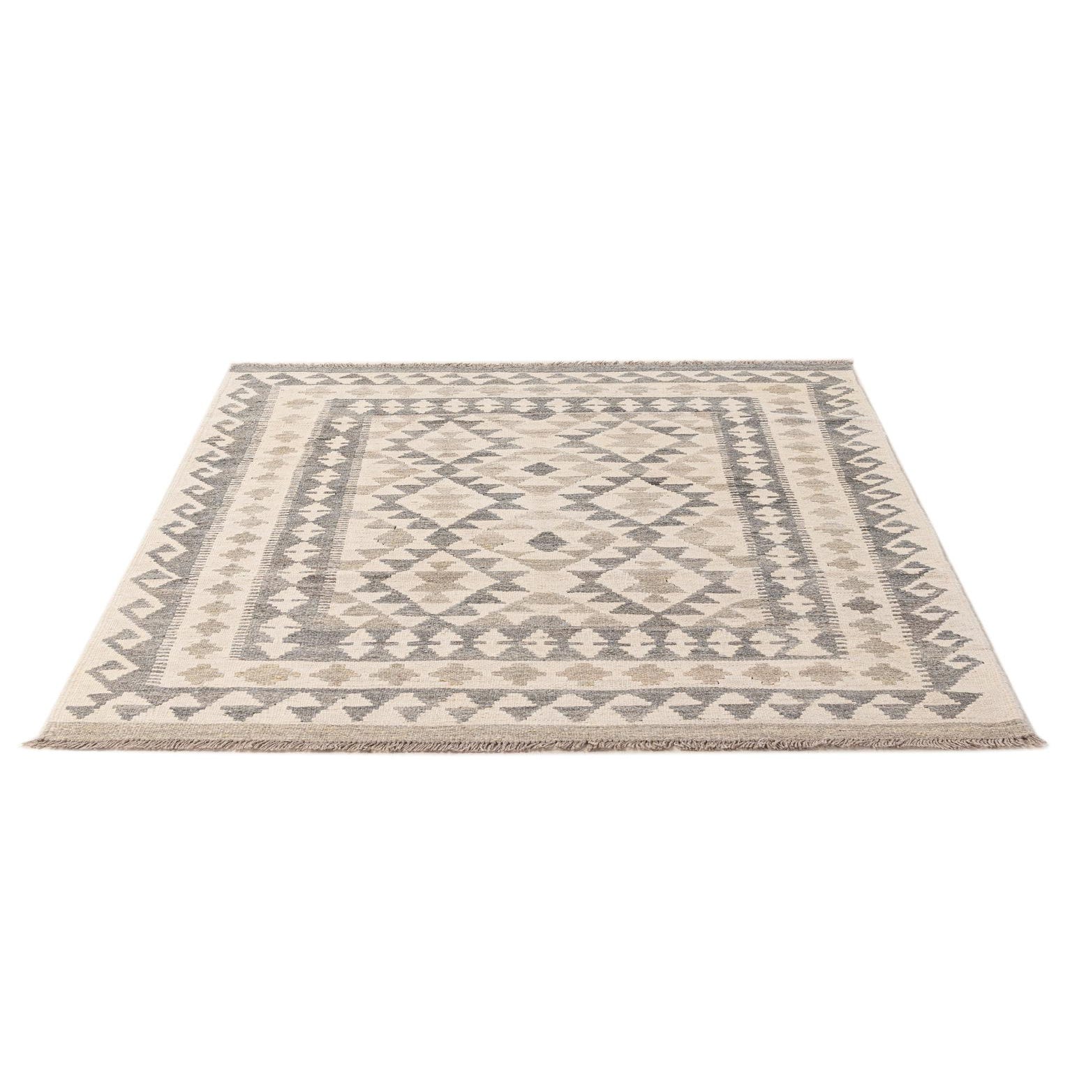 A 3x5 rectangular Kilim Maymana rug featuring tribal geometric patterns in shades of ivory, cream, and gray.