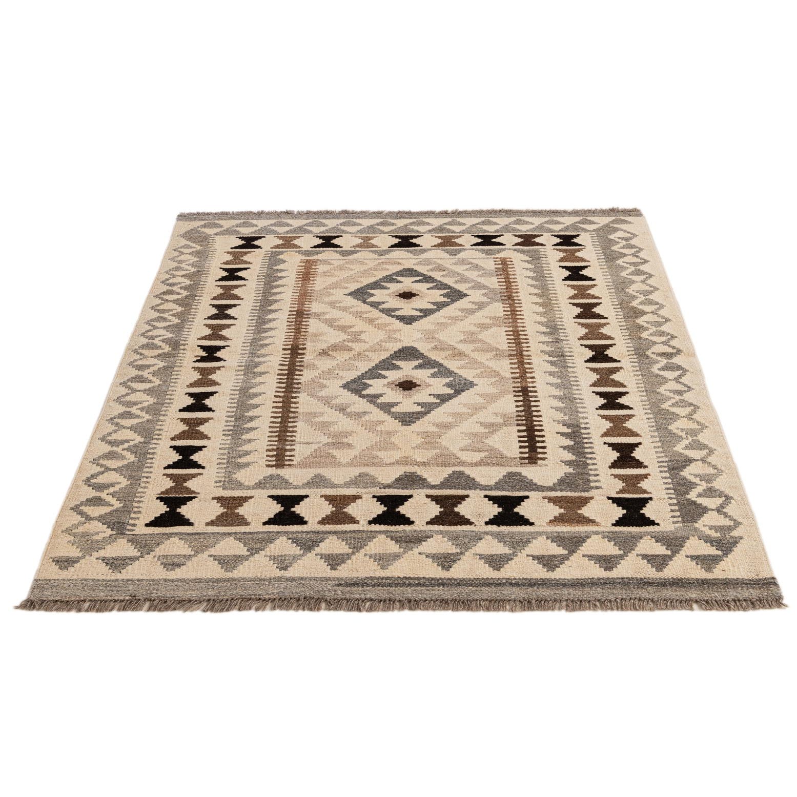 A 3x5 rectangular Kilim Maymana rug with tribal patterns in ivory, cream, brown, and gray, featuring geometric diamonds and border motifs.