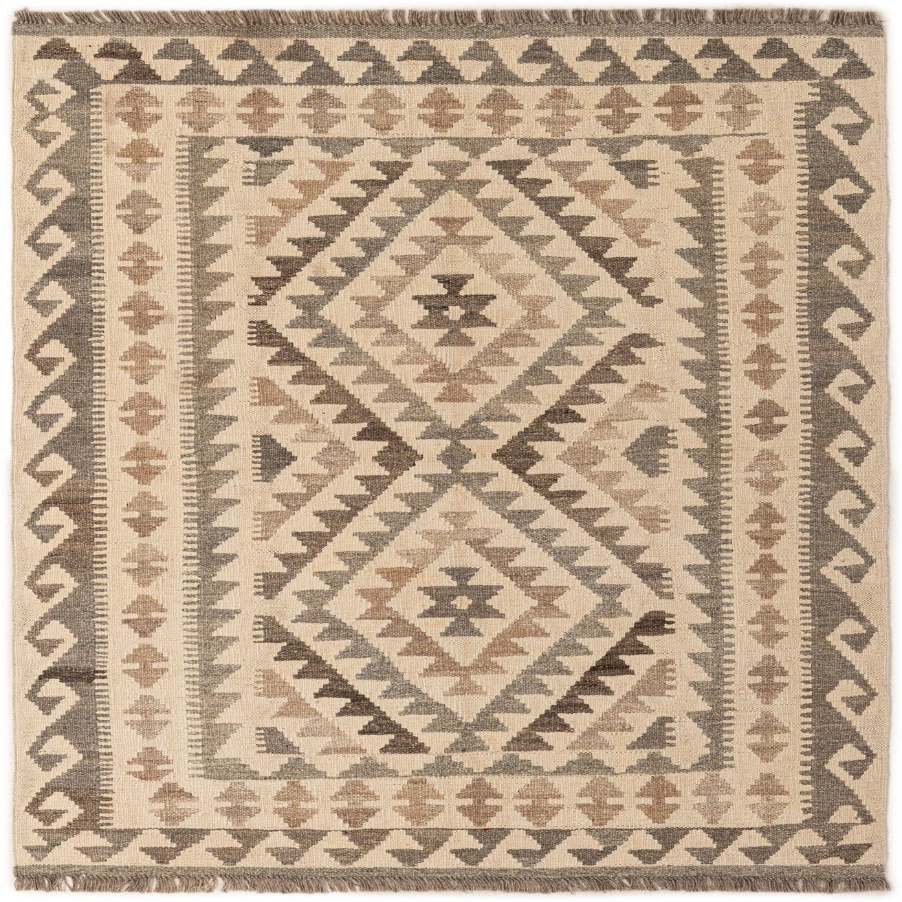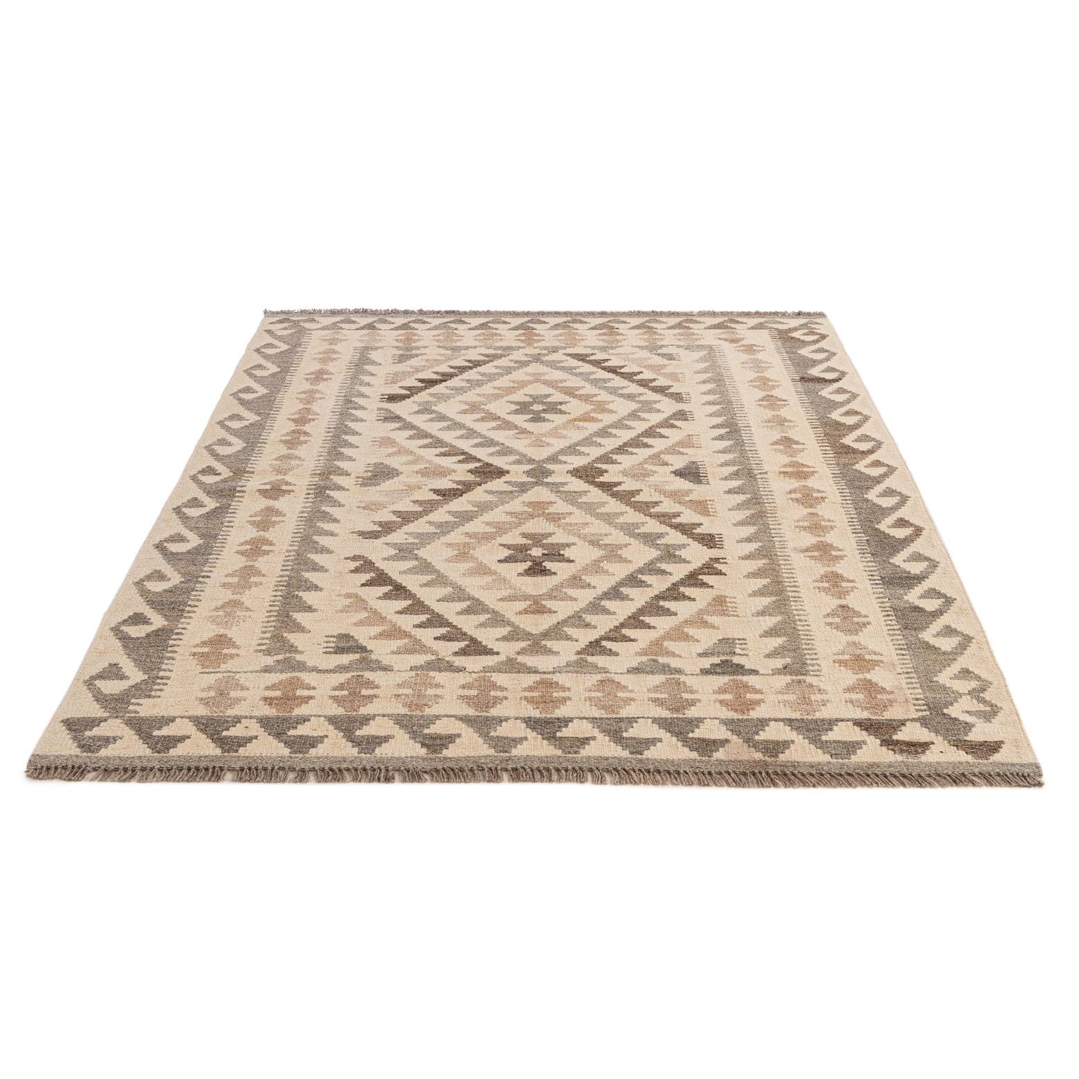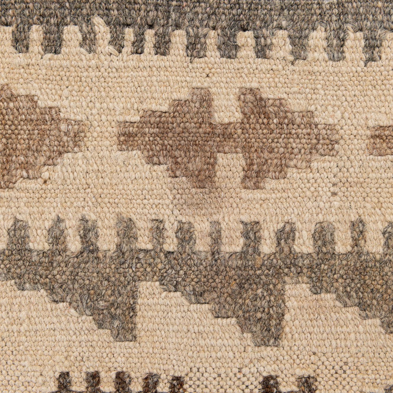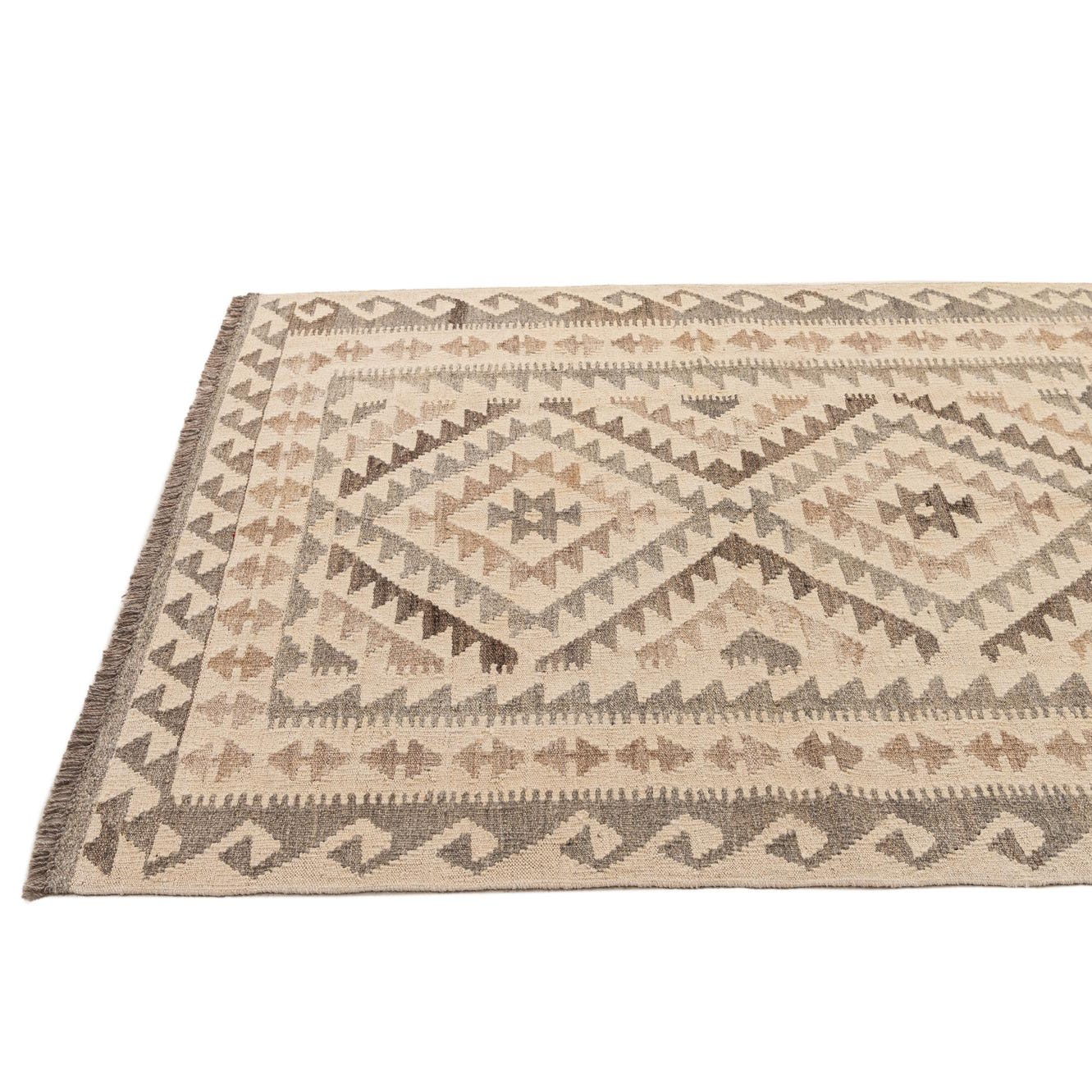 A 3x5 rectangular Kilim Maymana rug with a tribal geometric pattern in ivory, cream, and various shades of brown and gray.