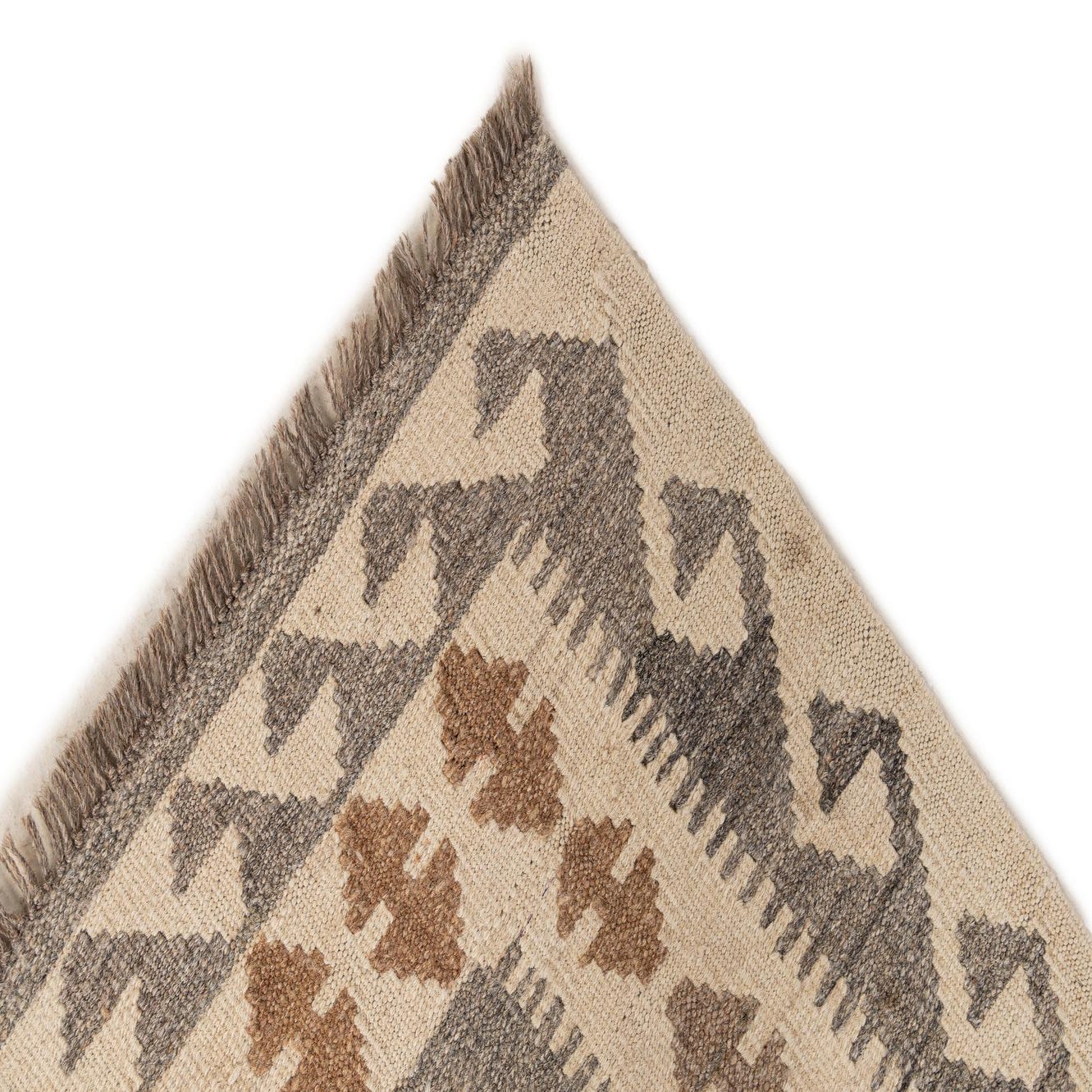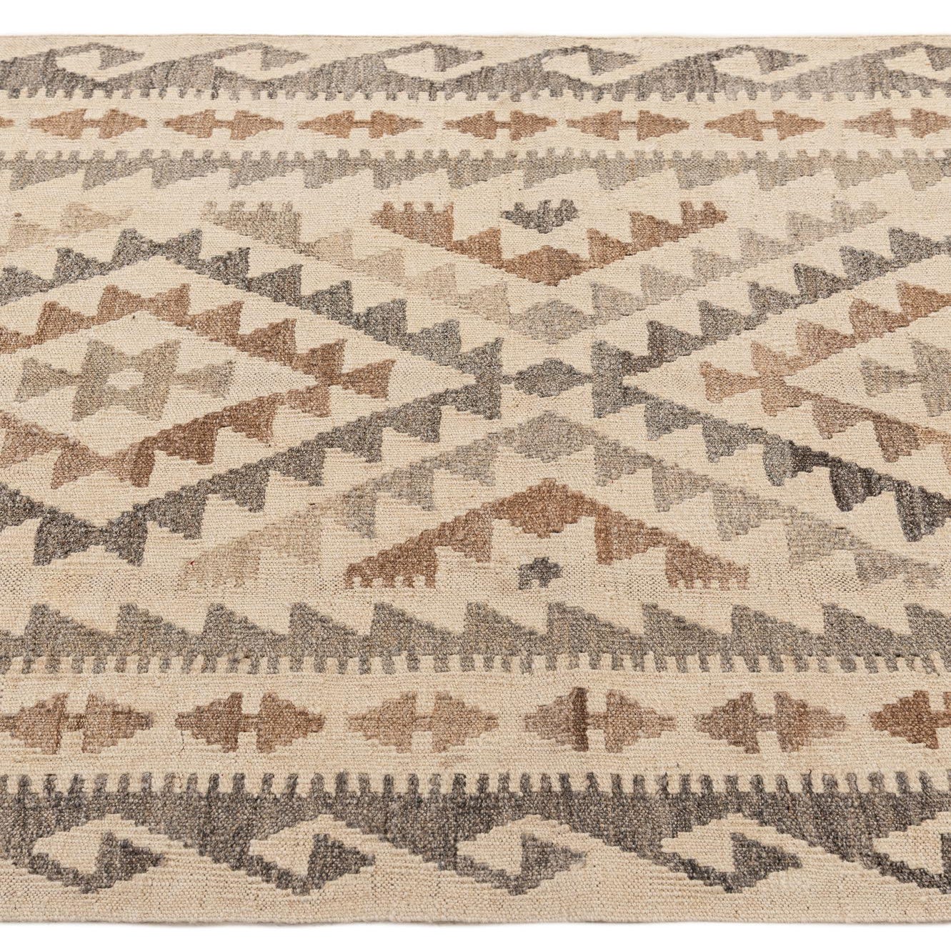 A 3x5 rectangular Kilim Maymana rug with an ivory background and a tribal geometric pattern in shades of brown and gray.