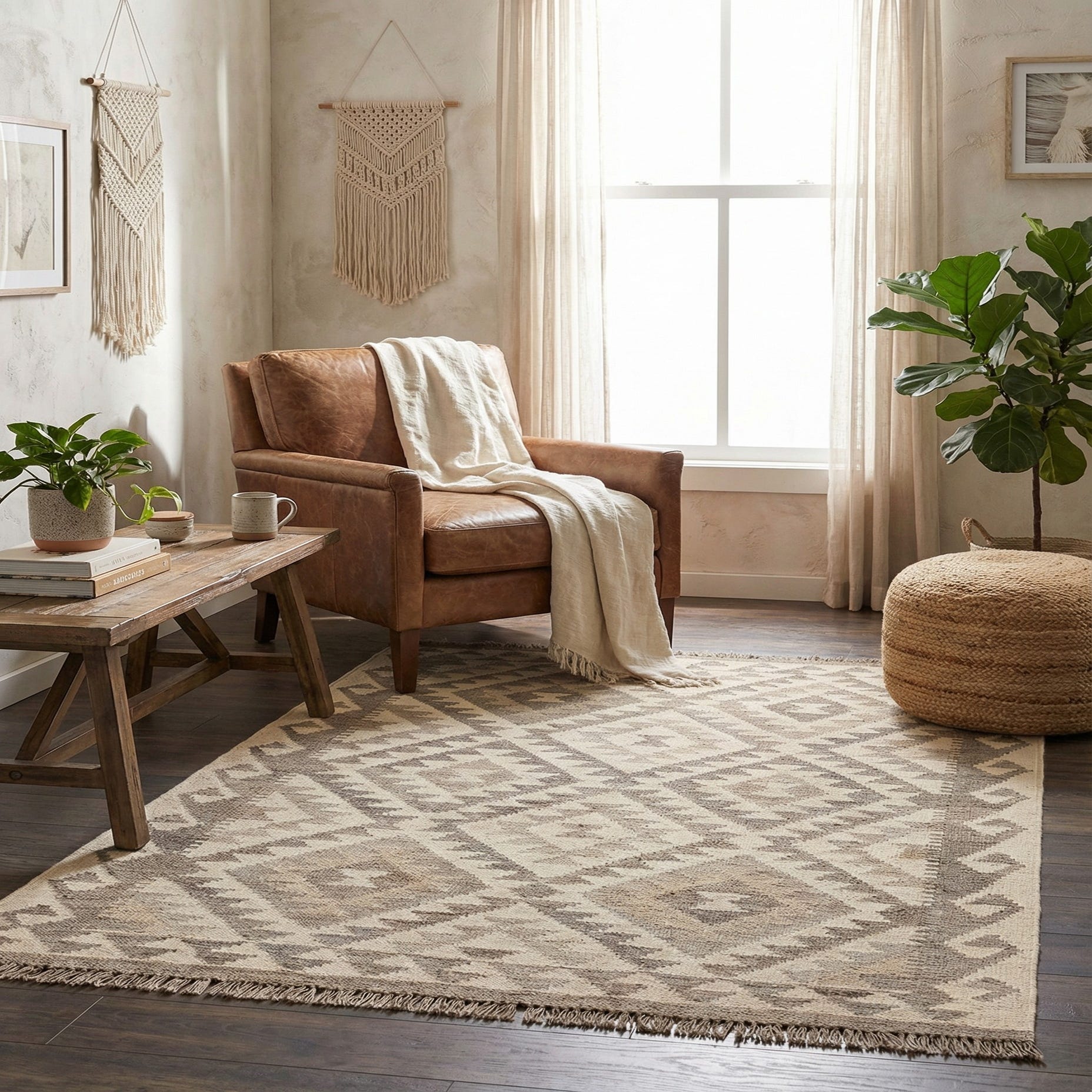 The neutral palette and graphic pattern work well in modern farmhouse, Scandinavian, or transitional interiors, as well as global-inspired rooms that favor handcrafted details. Use it to anchor a small seating area, bring warmth to an entryway or hallway, or layer it under a bench or at the foot of a bed. Pair with natural woods, linen upholstery, leather accents, and matte metal fixtures to reinforce the rug’s earthy tones and geometric rhythm.