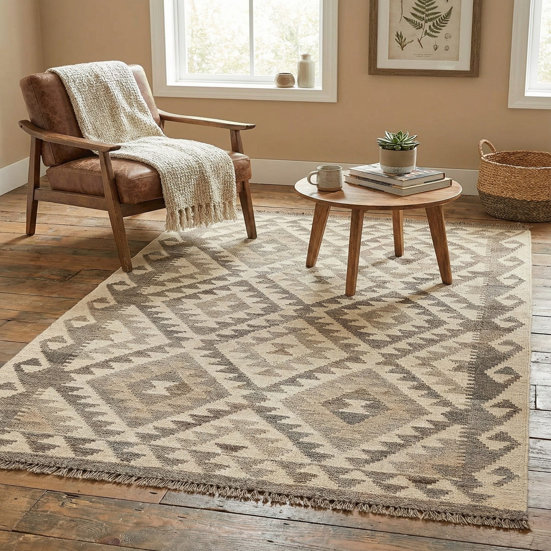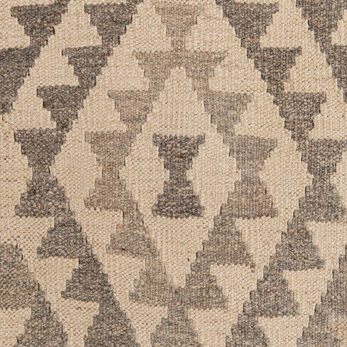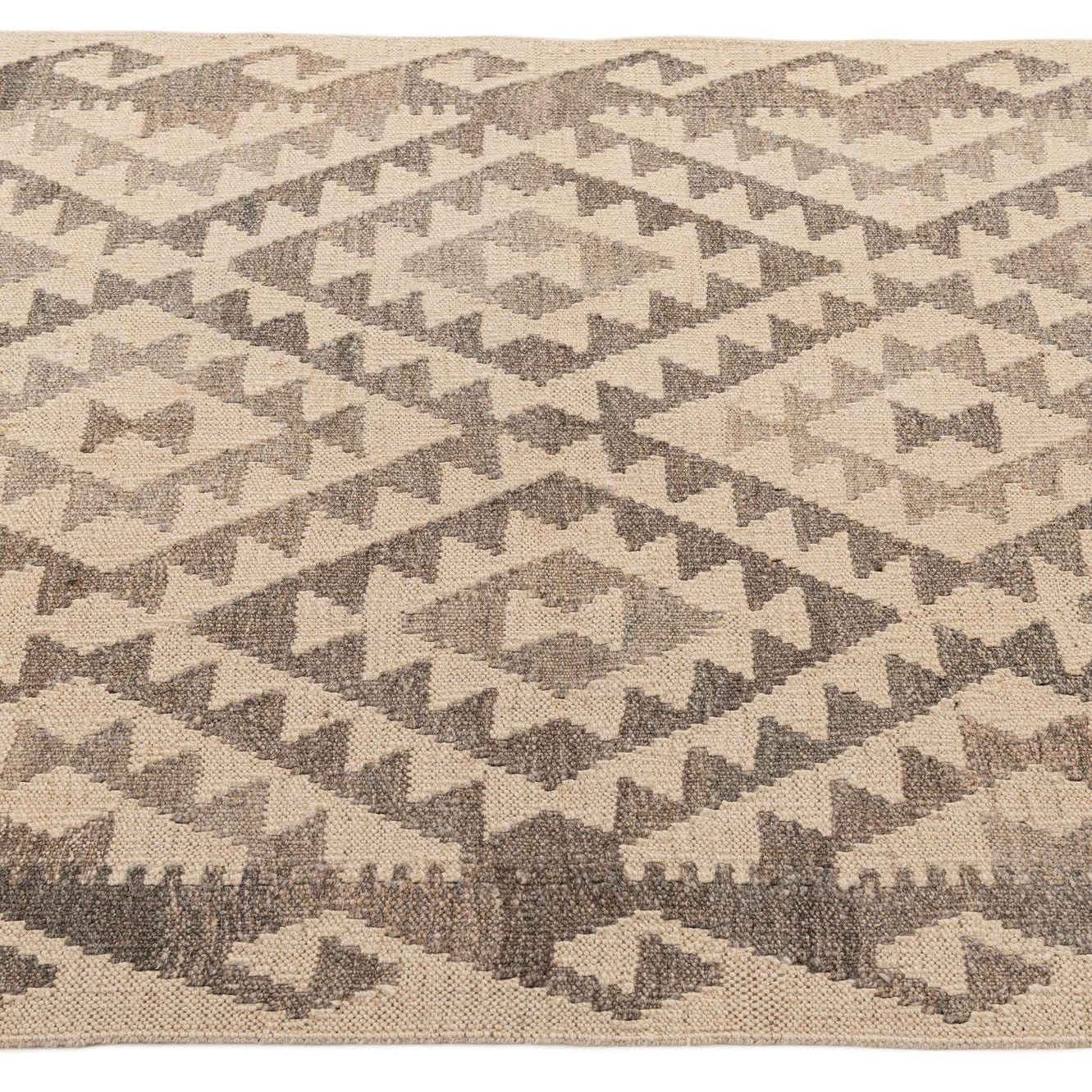 Hand-woven from 100% wool, this kilim-style rug presents a repeated geometric diamond motif on a cream ground. Muted beige and soft gray shape the stepped diamonds and serrated borders, offering a calm, low-contrast pattern that reads refined without being busy. The flatweave construction produces a low, tactile surface with visible weave structure and subtle tonal shifts where the natural fibers catch the light; short fringed ends and neat selvage complete the look.