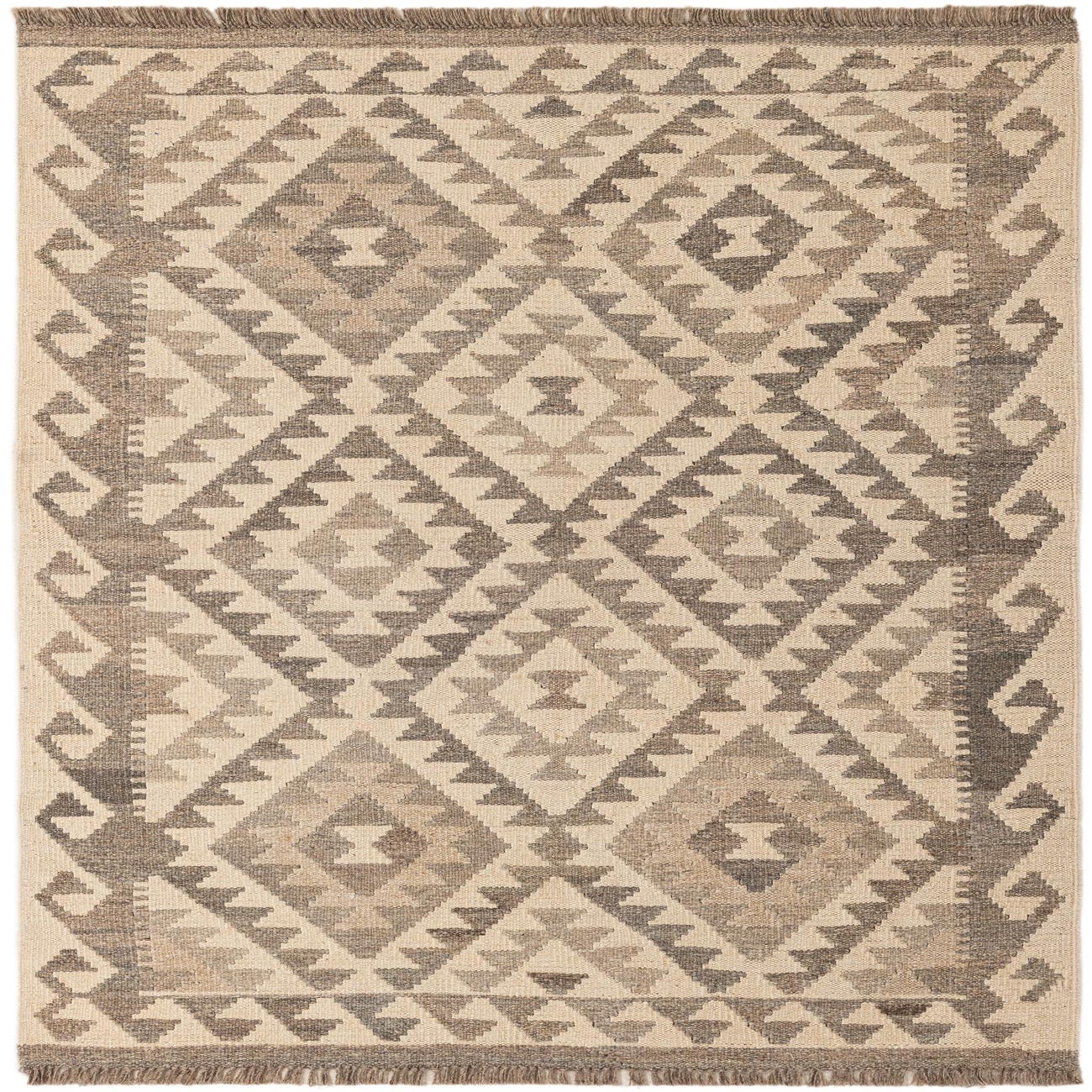 A 3x5 rectangular Kilim Maymana rug featuring a tribal geometric pattern in ivories, creams, and various shades of brown.