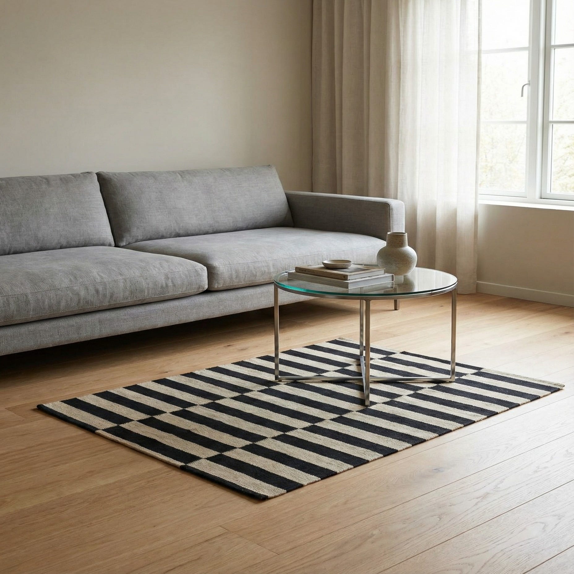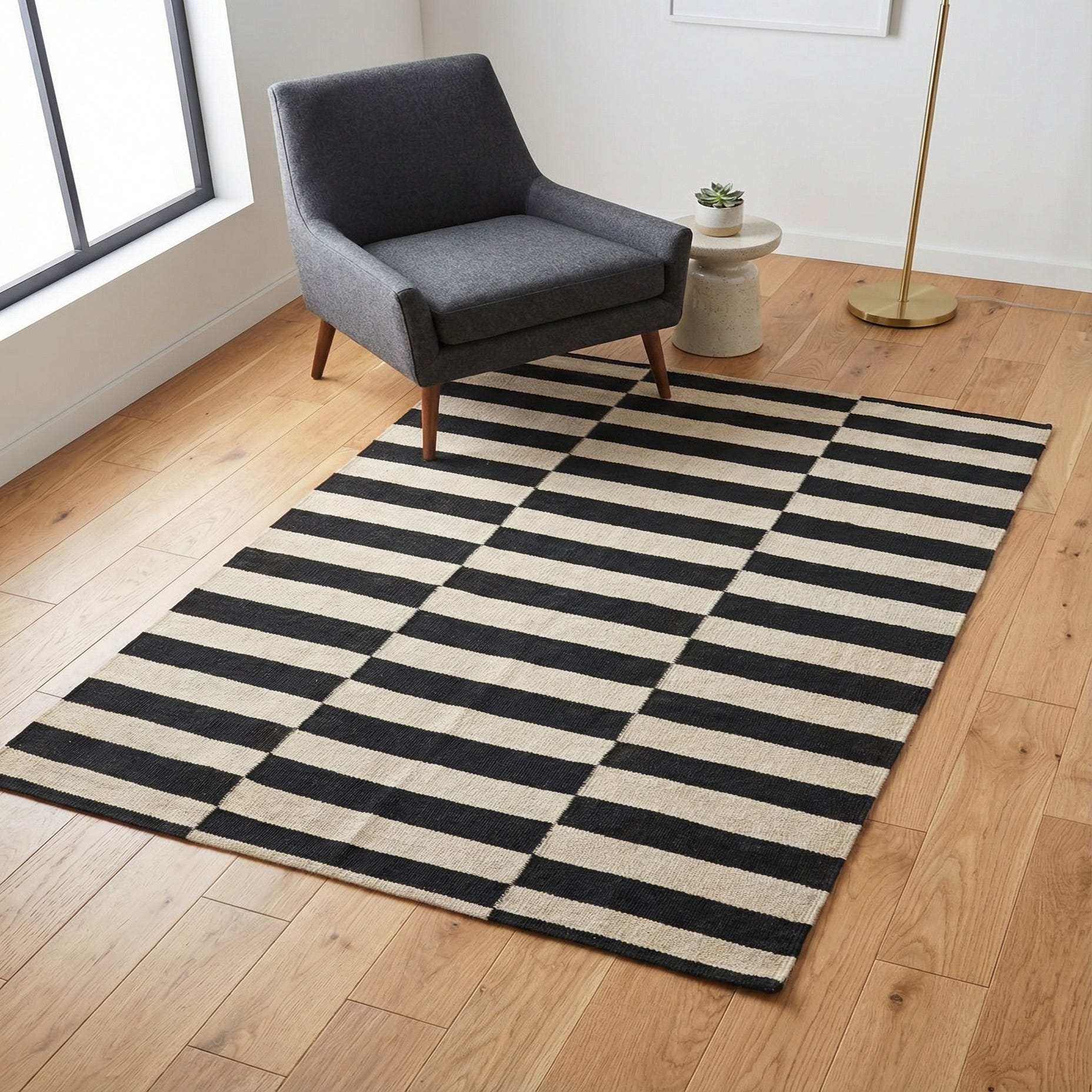 The flatweave construction produces a low-profile surface that feels firm and textured underhand, with the natural give and warmth of wool. Subtle irregularities in the weave add handcrafted character without distracting from the overall clarity of the design. Use this piece to define an entryway or kitchen landing, anchor a small seating area or reading nook, or layer it in front of a sofa for added pattern and contrast. Its two-tone palette works well with light woods, matte metals, and neutral linens in minimalist, Scandinavian, or industrial-inspired interiors.