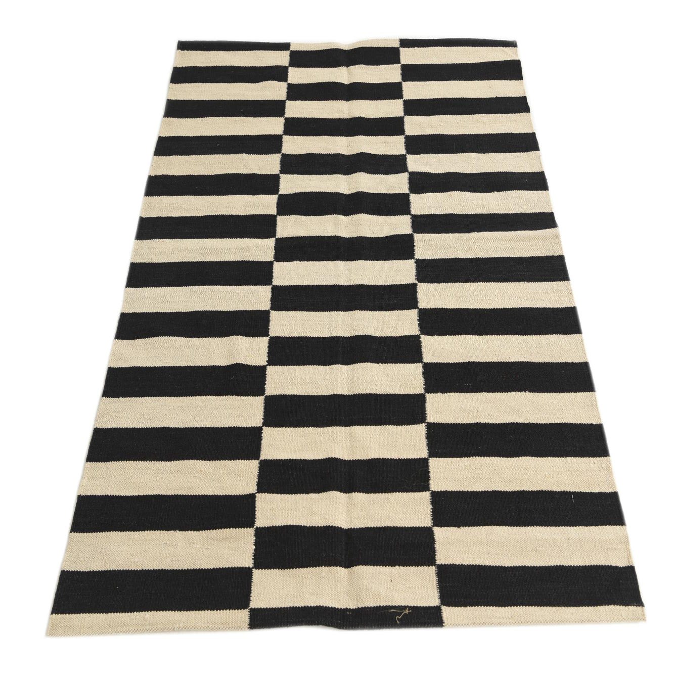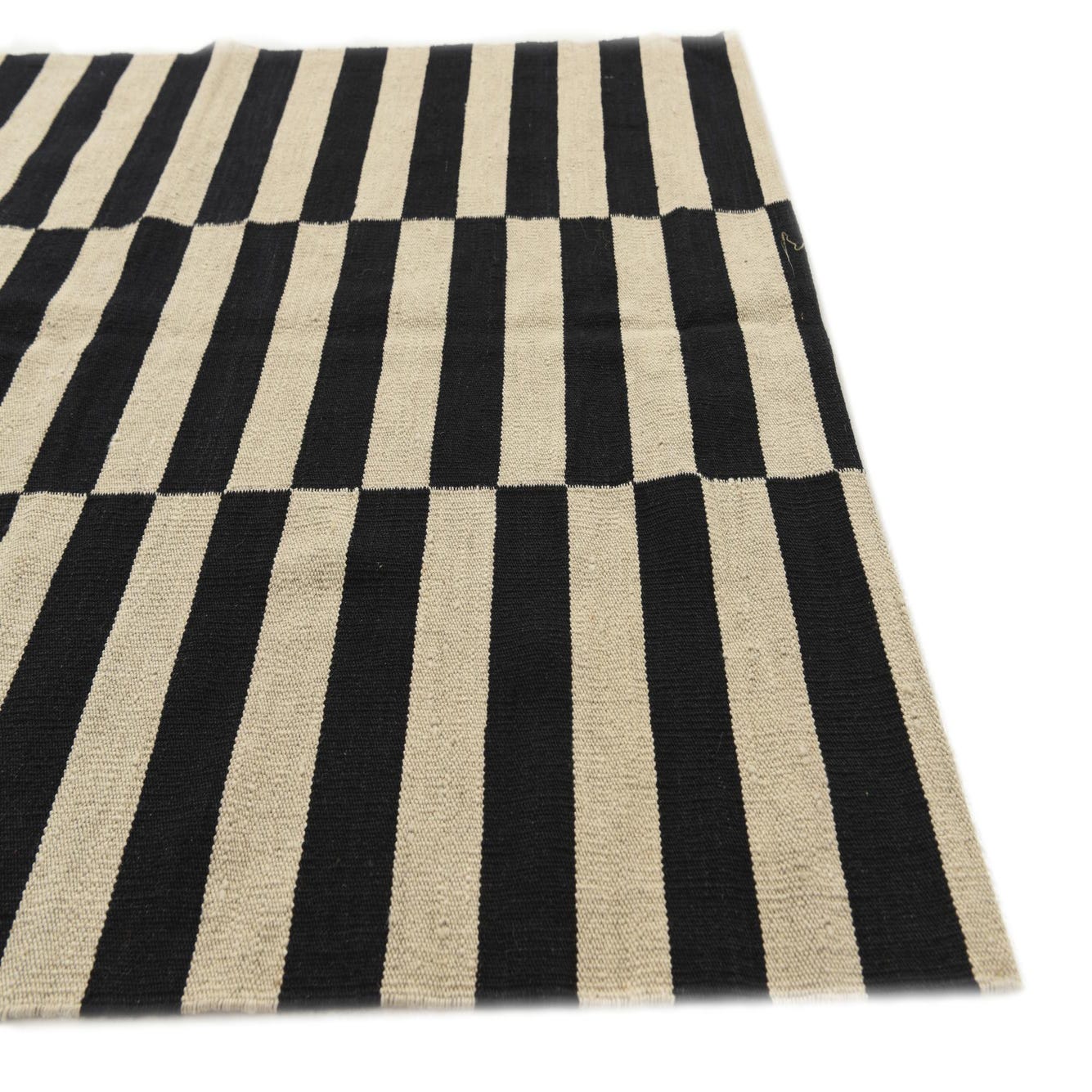 A 3x5 rectangular Kilim Modern rug with a bold black and ivory striped pattern, perfect for a kitchen or entryway.