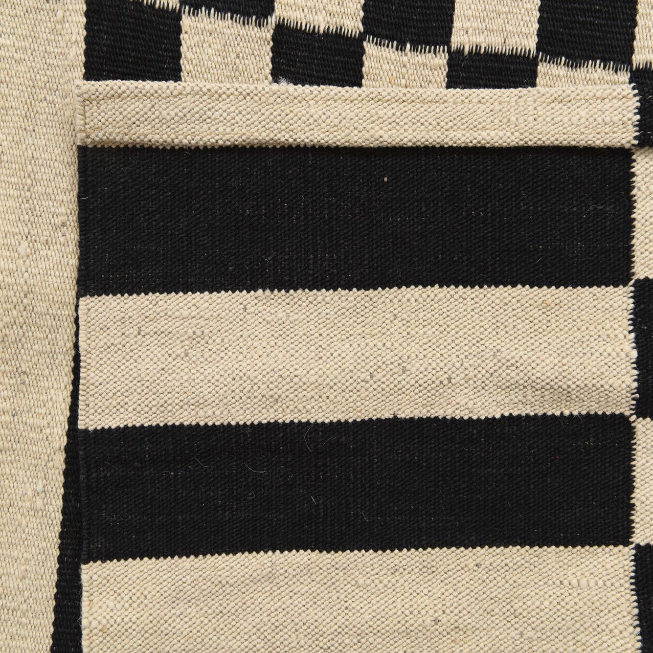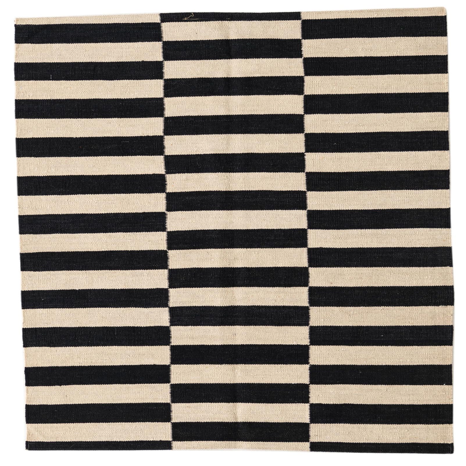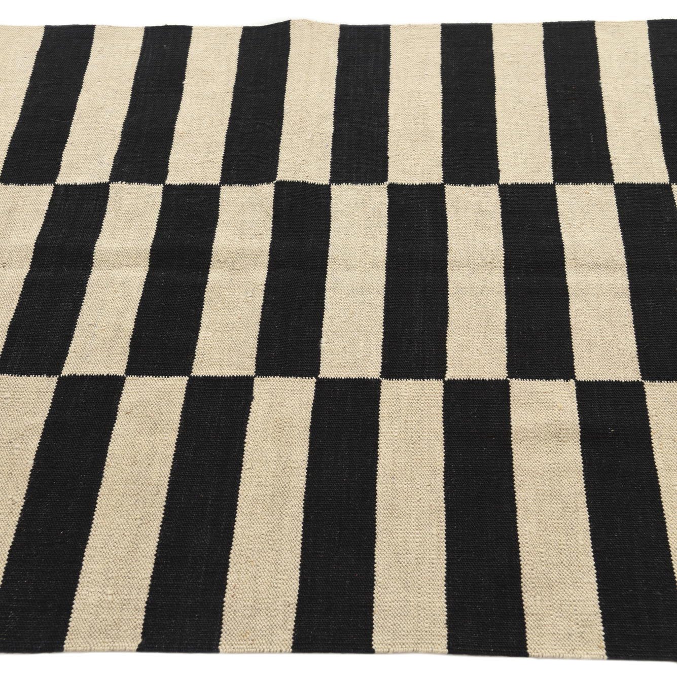 The Kilim Modern collection presents a hand-woven rug crafted from 100% wool, featuring a striking contrast of black and cream. The bold, linear pattern is a classic representation of simplicity in design, offering a versatile aesthetic suitable for a variety of interior styles. At 3x5, this rug can serve as a focal point in smaller spaces or as an accent piece in larger areas.