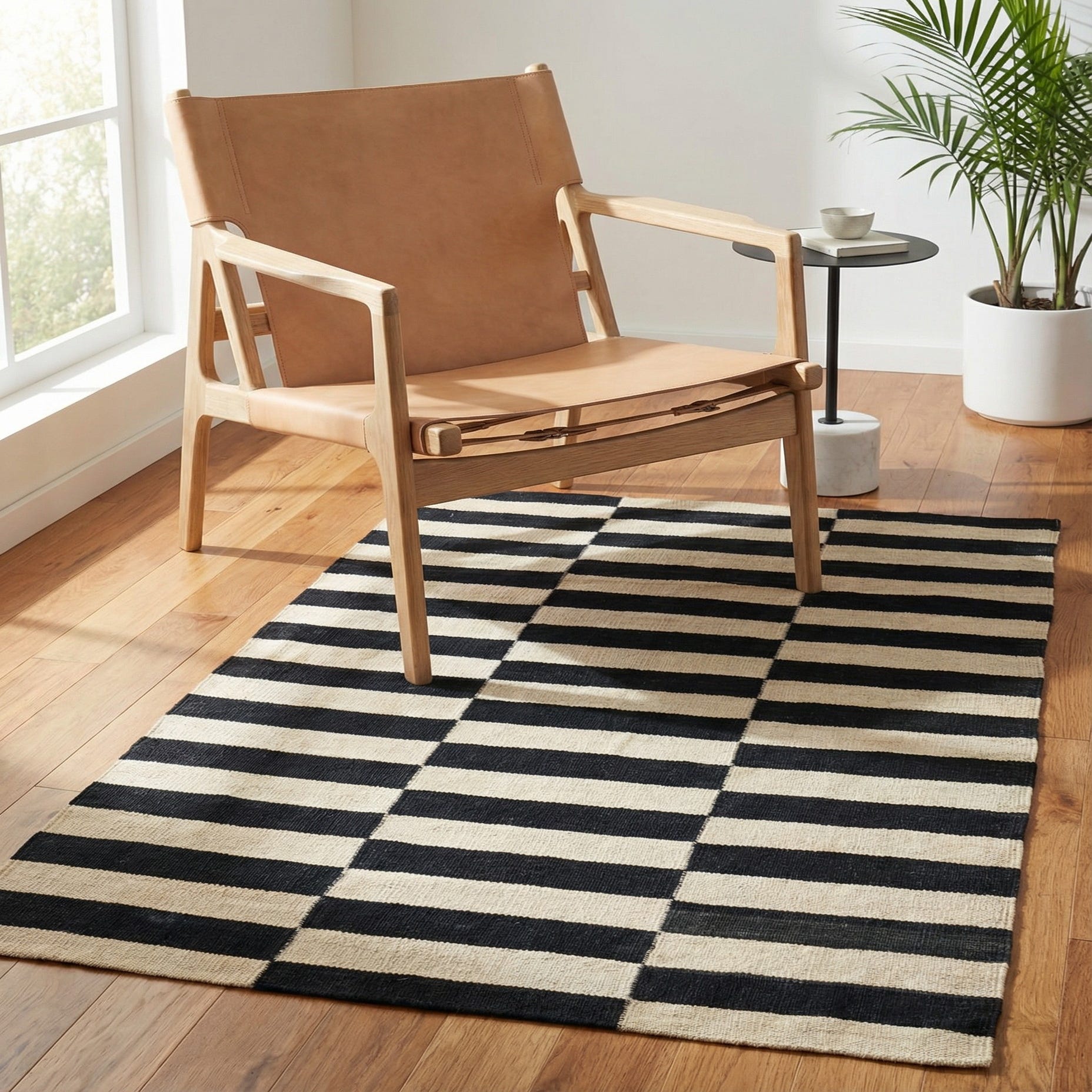 The flatweave construction results in a low pile, making it a practical choice for areas with high foot traffic or under furniture. Given its versatile color palette, this rug is well-suited for an array of interior design scenarios, including minimalist, modern, Scandinavian, and even industrial settings. The crisp linear pattern can serve as a grounding element in a room, adding structure and balance to spaces that favor clean lines and simplicity. This piece can also provide a striking counterpoint in interiors that feature curvilinear forms or organic textures, allowing for a harmonious blend of design elements.