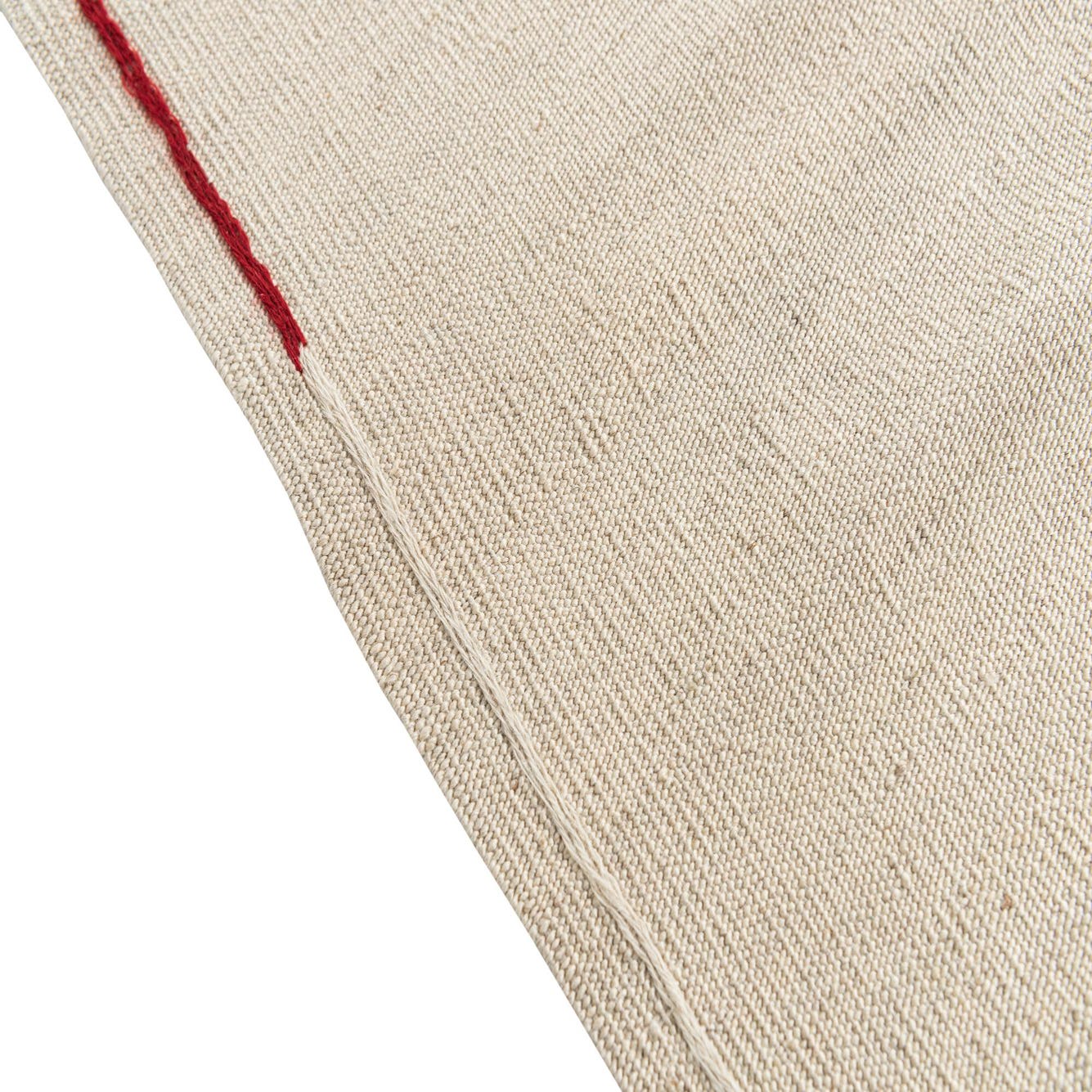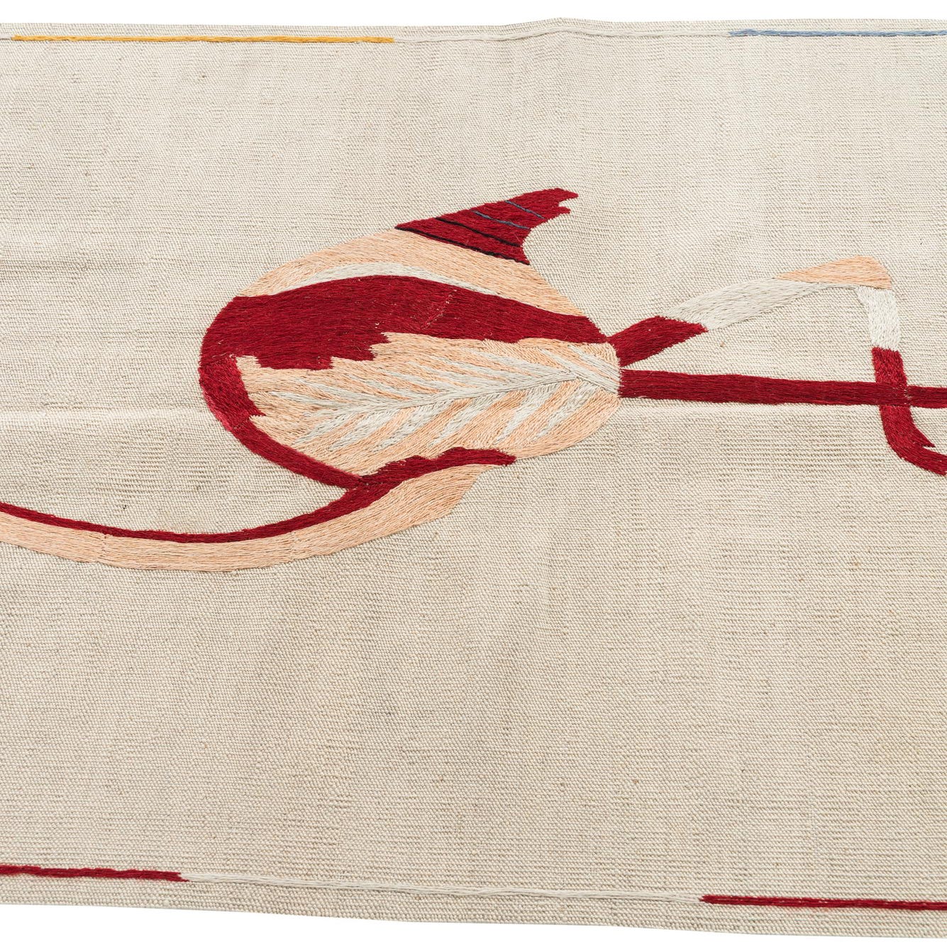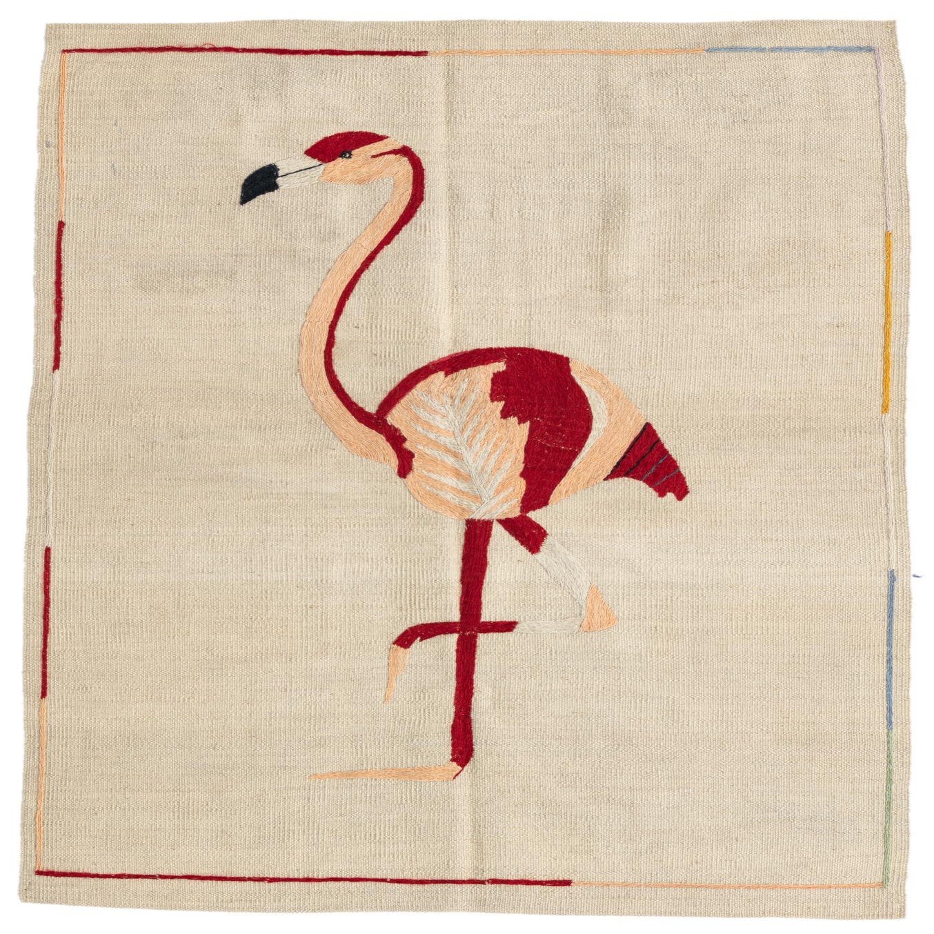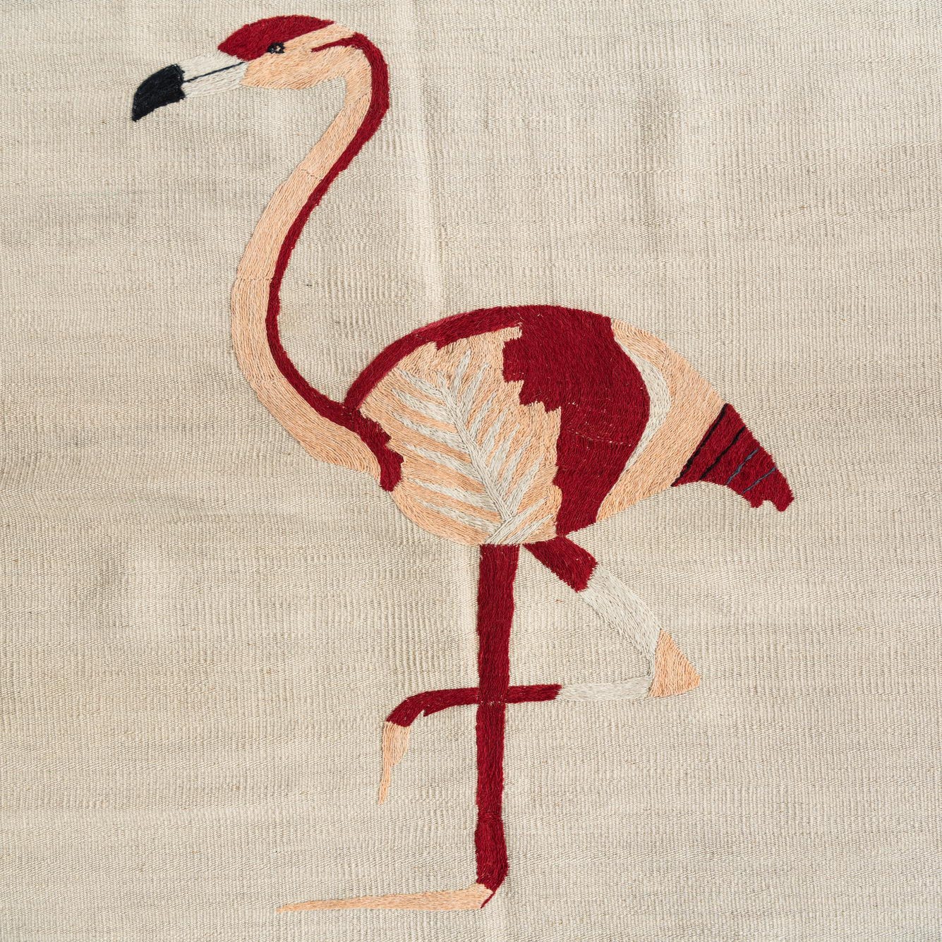 A hand-woven, 100% wool flatweave in a soft cream ground sets the scene for a single, stylized flamingo rendered in warm peach and rich red with a black beak and subtle gray accents. The central motif is stitched with a slightly raised, tactile texture against the low-pile background, while narrow, interrupted color lines at the perimeter introduce small pops of red, peach and gray that frame the composition without crowding it. The wool weave feels sturdy yet soft underfoot, with the embroidered areas adding a gentle, hand-crafted relief you can both see and feel.