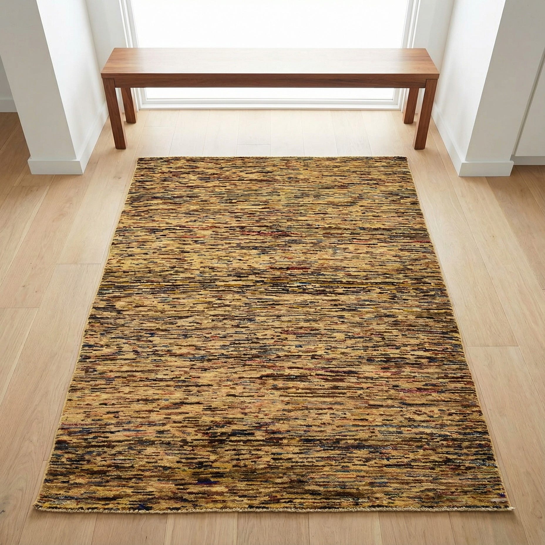 This rug's array of colors and textured appearance make it a versatile addition to an interior design scheme. It would complement a minimalist setting by adding a splash of color or serve as a harmonious element in a more eclectic space. Traditional homes would benefit from this rug's updated interpretation of classic styles, while it could also serve as a sophisticated touch to a contemporary apartment. It is well-suited for placement in living rooms, home offices, or small dining areas where its artful design can be appreciated up close.