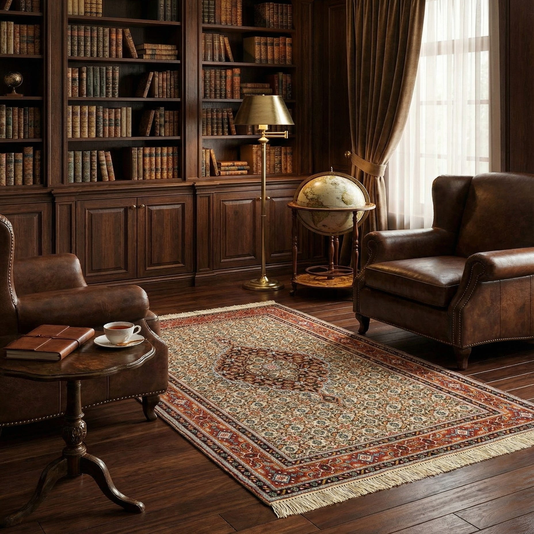 A 3x5 rectangular Mood Collection Persian rug in ivory and cream with intricate traditional patterns and a central medallion.