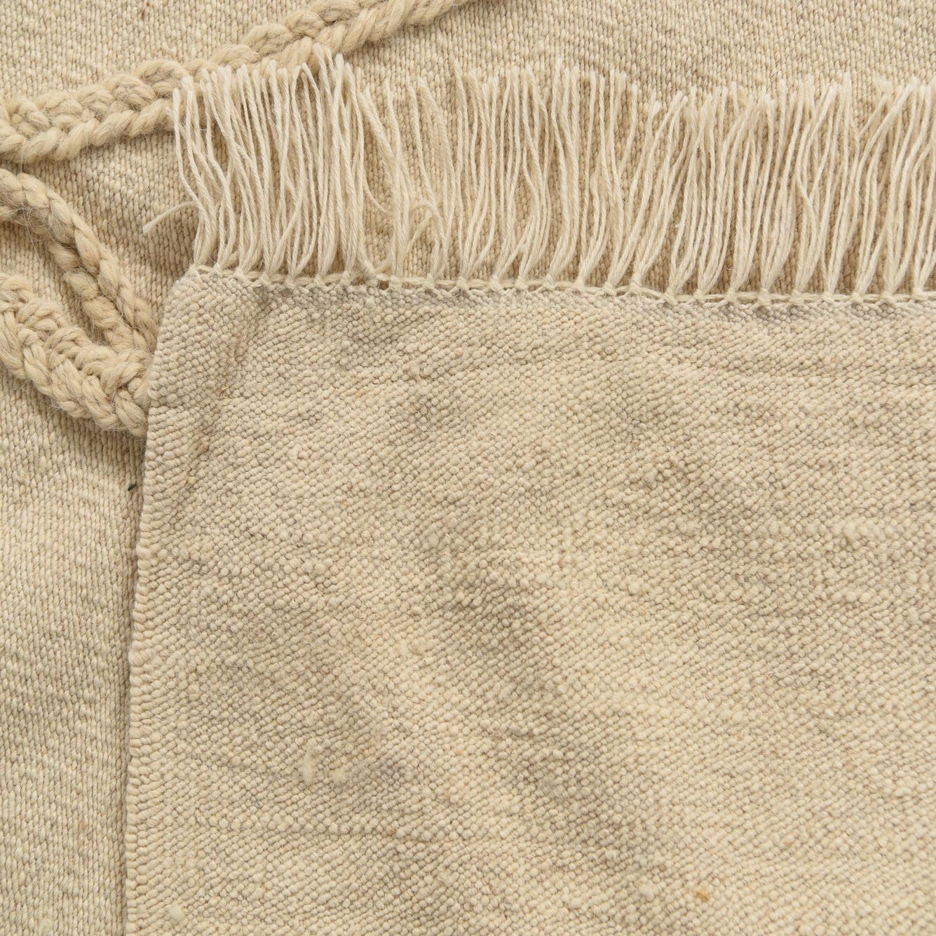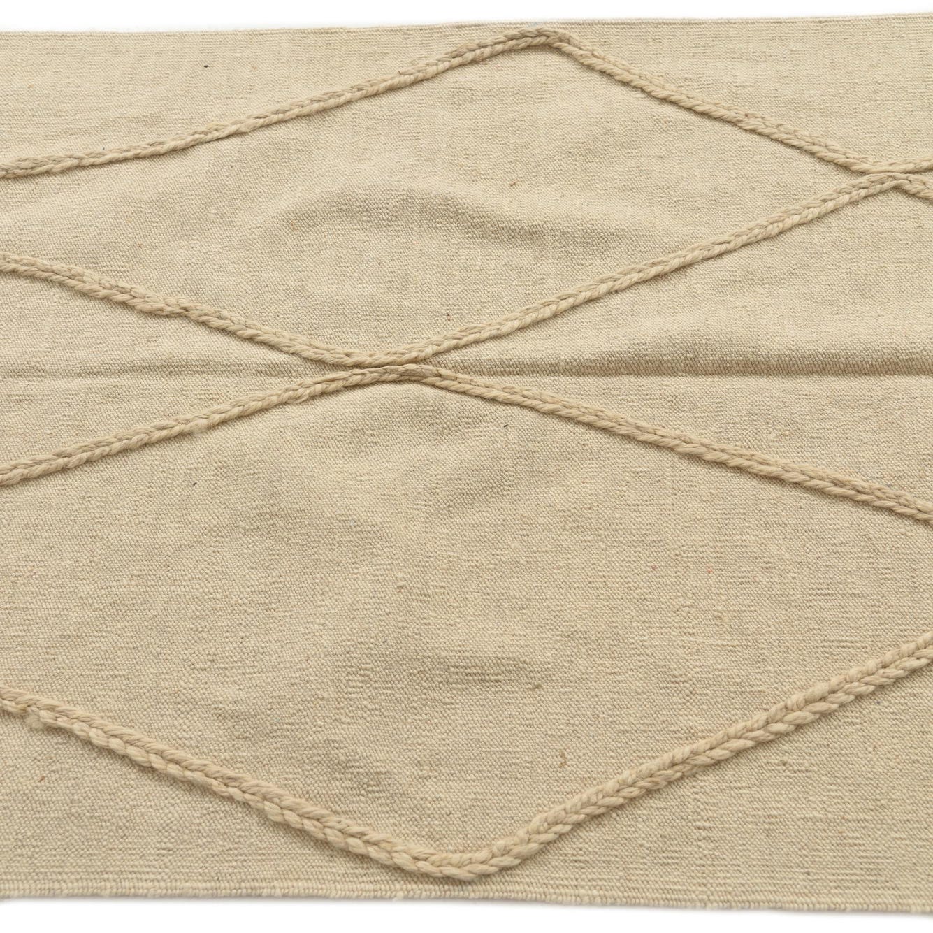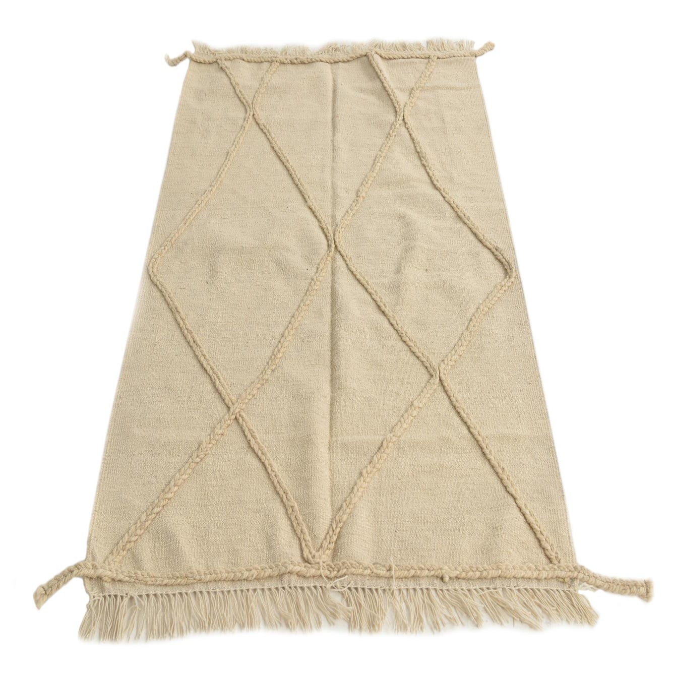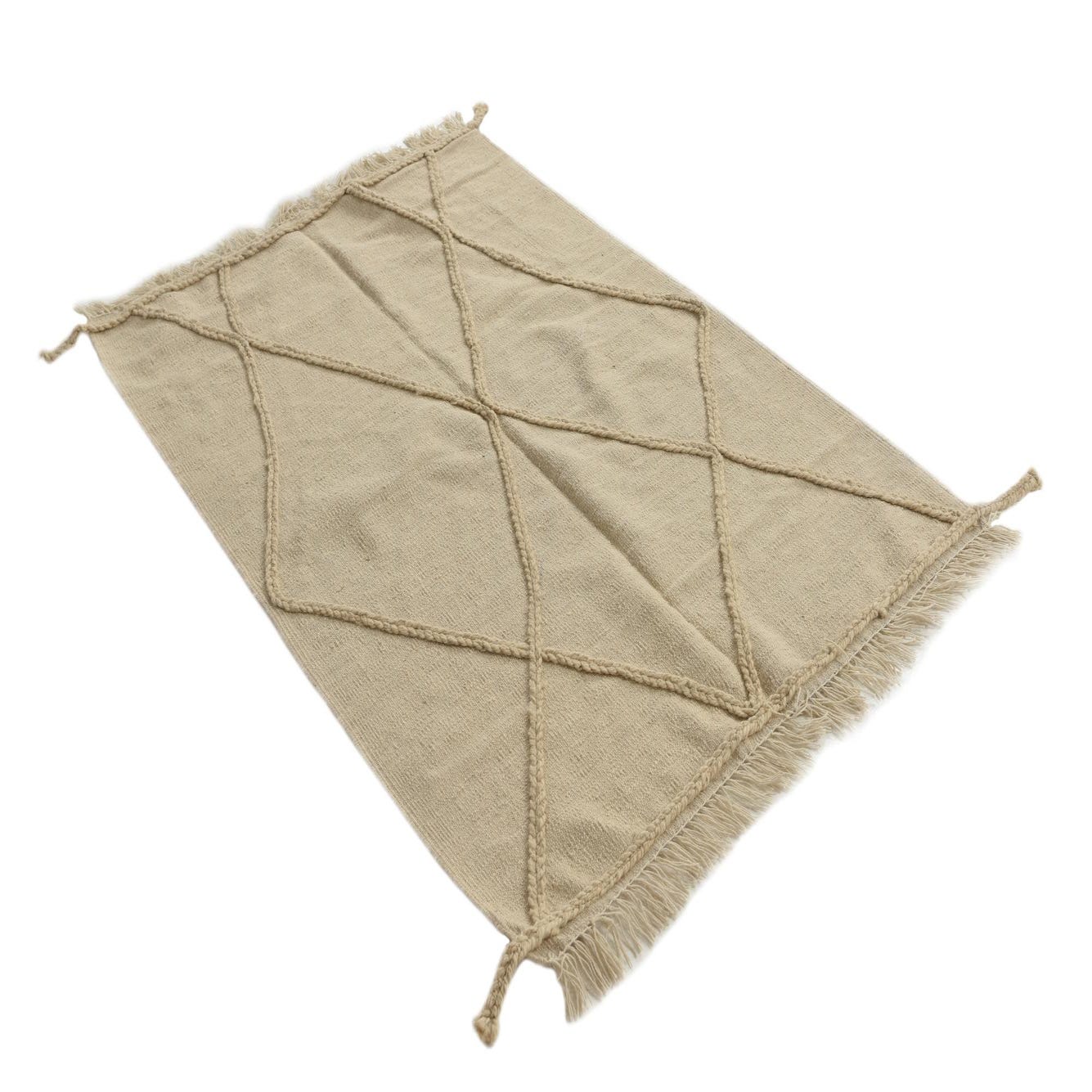 The rug's cream background provides a neutral base that is adaptable to many decor themes. Accentuating the cream are the rug's textural patterns, consisting of clean, geometric lines that give the impression of diamonds and lattice work, which bring a sense of structure and sophistication to the piece. The rug's fringe detailing adds an artisanal touch, reinforcing its handcrafted quality.