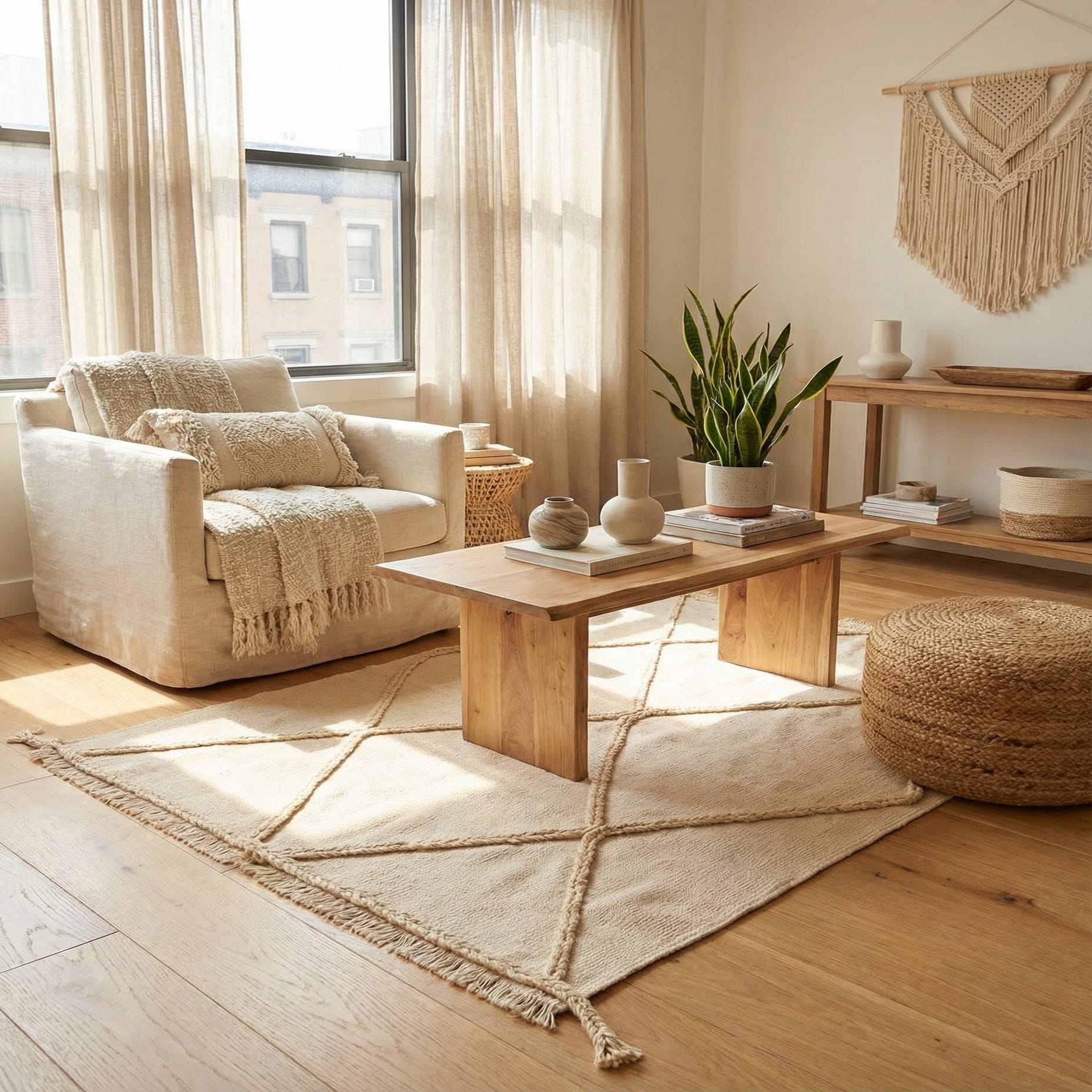 This neutral palette and simple pattern make the rug easy to place: try it in a small seating area or layered beneath a coffee table to add texture without competing with bold furniture. It also pairs well with Scandinavian or modern-boho schemes—think light wood floors, linen upholstery, and woven accents—or as a soft anchor in a bedroom or entryway where a calm, understated foundation is needed.