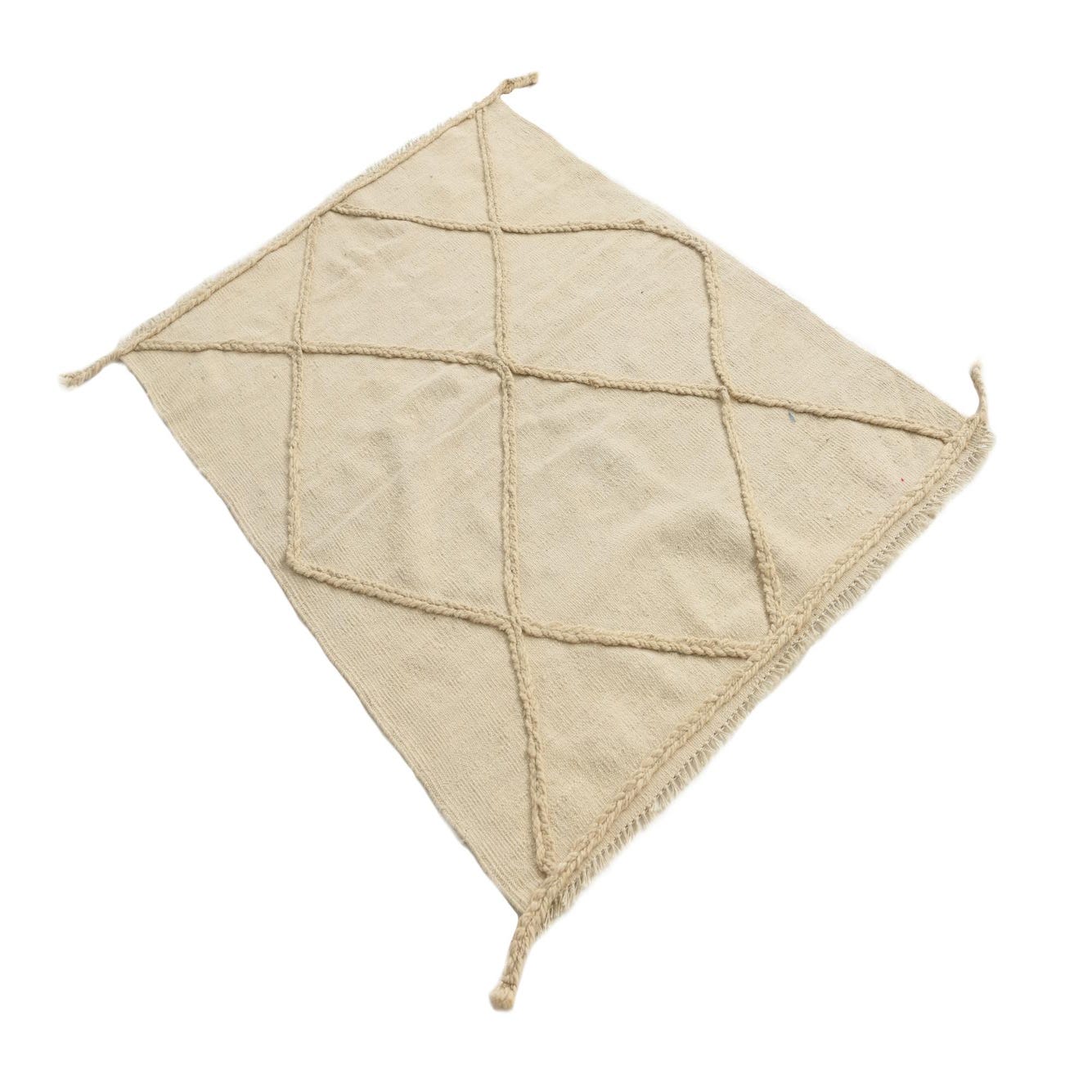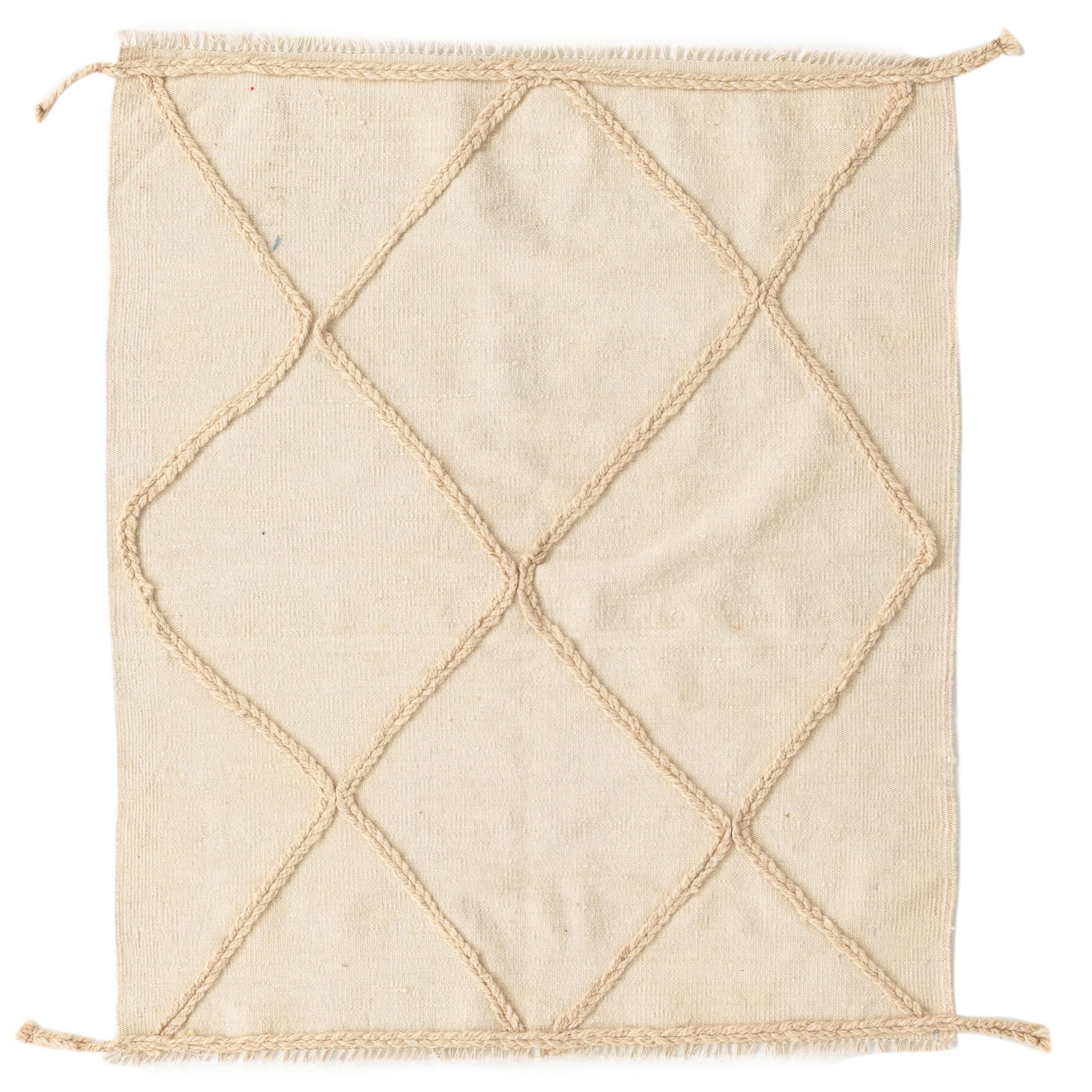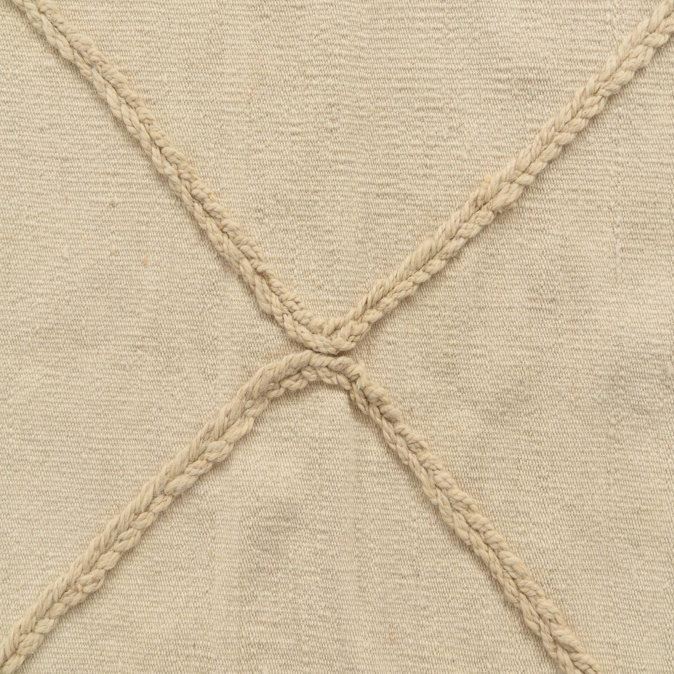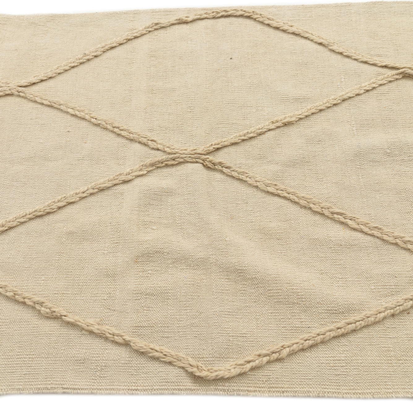 A low-key diamond lattice runs across a cream field in soft beige braids, creating a calm, geometric look that reads both modern and quietly traditional. Hand-knotted from 100% wool, the rug pairs a flat, tightly woven background with slightly raised, rope-like cords that you can feel under your hand. The wool pile has a gentle, matte finish and subtle tonal shifts that give the surface depth without overpowering a room.