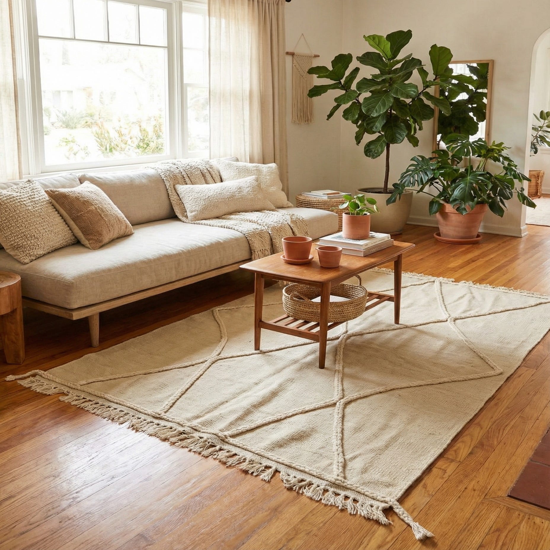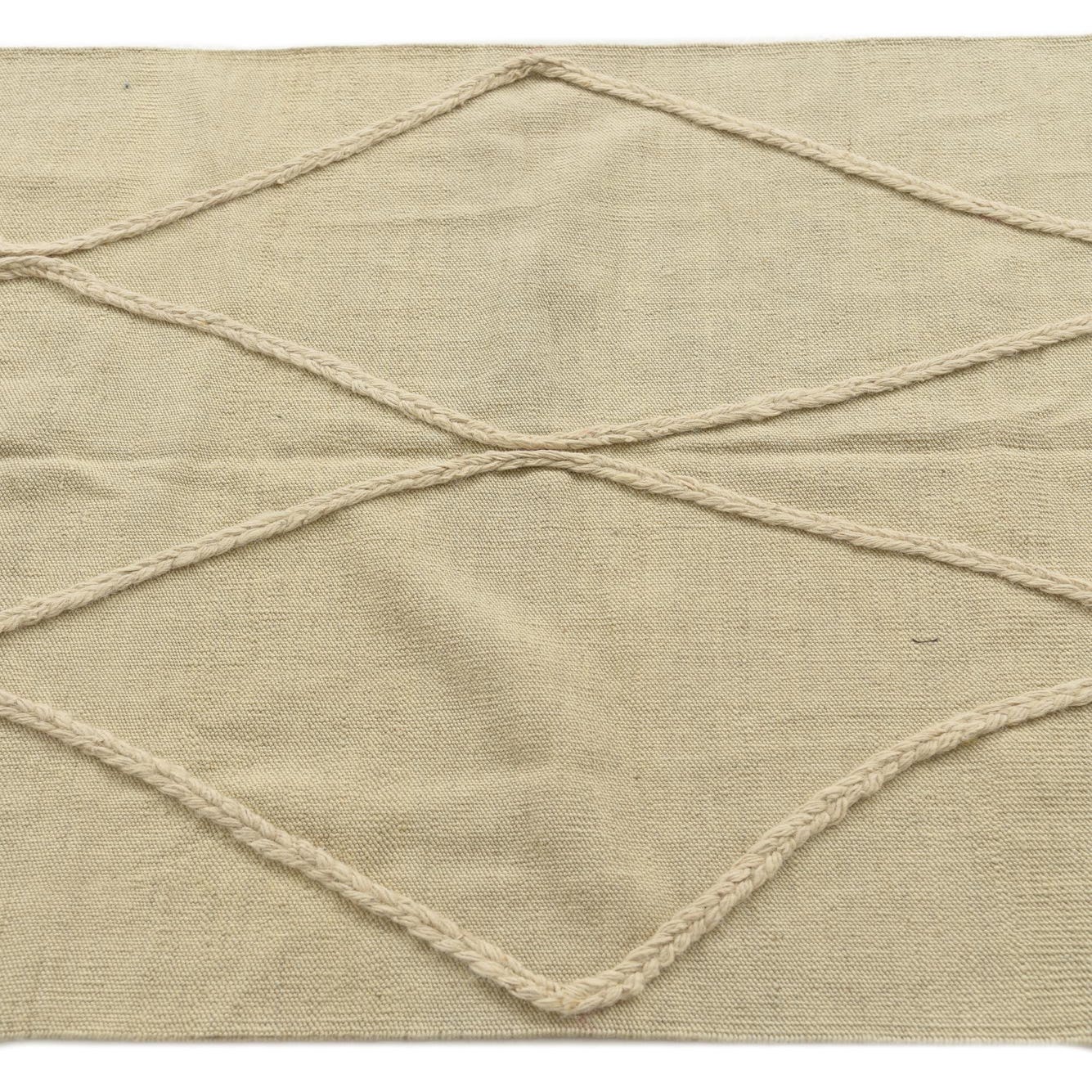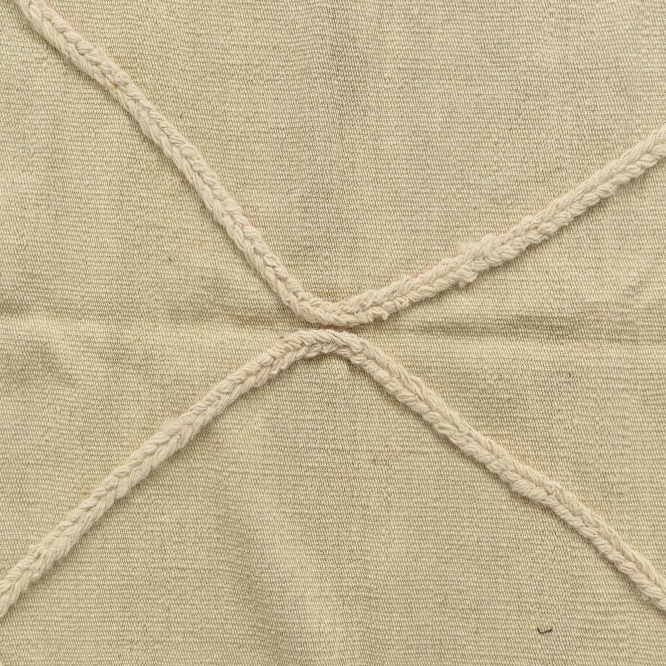The cream palette, serving as both the background and the primary color of the rug's design, ensures versatility within a variety of interior design scenarios. This rug would be particularly well-suited for spaces that aim for a clean, organic look, such as Scandinavian or modern minimalist living rooms, bedrooms, and studies. Its neutral tone and subtle textural play allow it to complement a range of color schemes, from monochromatic to more vibrant interiors.