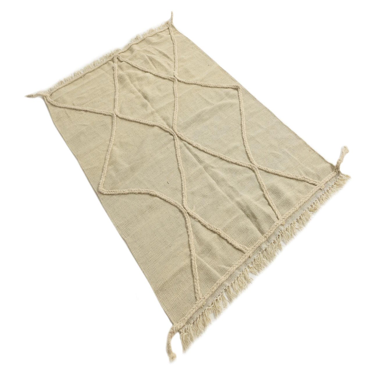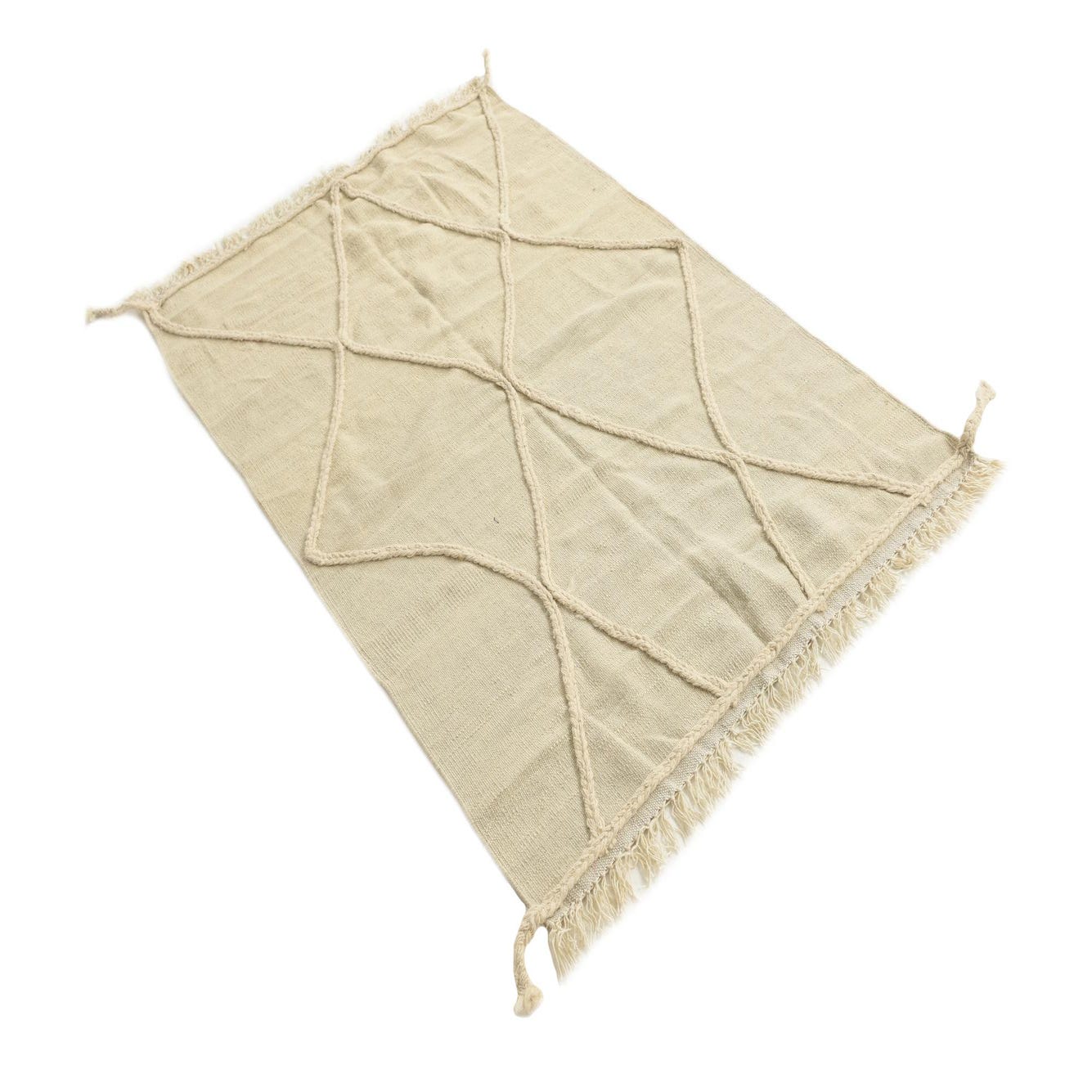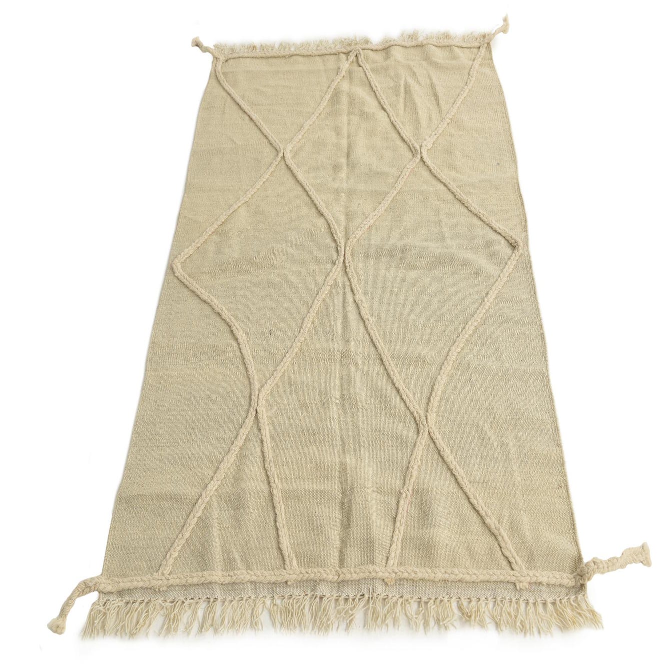 A 3x5 rectangular ivory wool shag rug with a raised tribal diamond pattern and fringed edges.