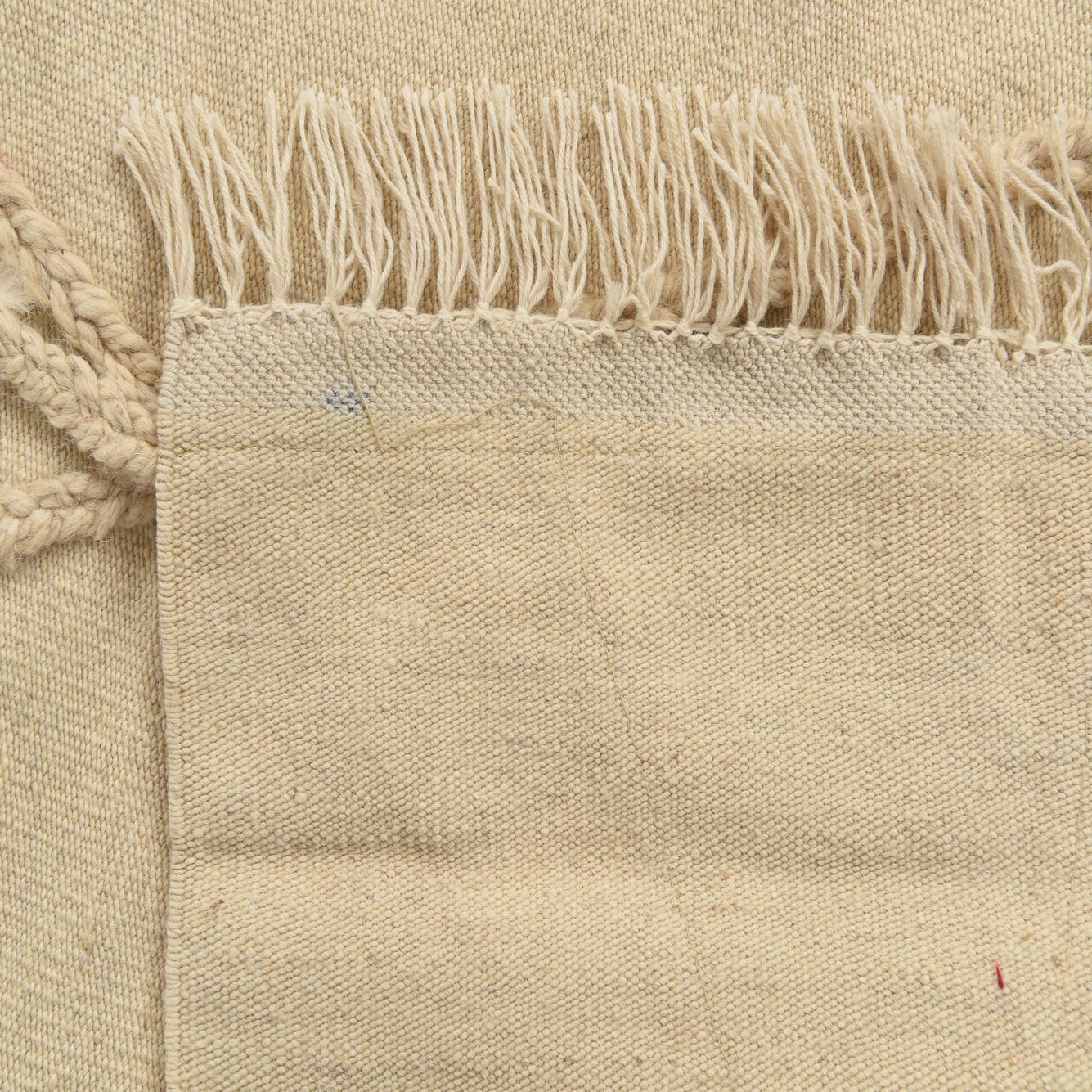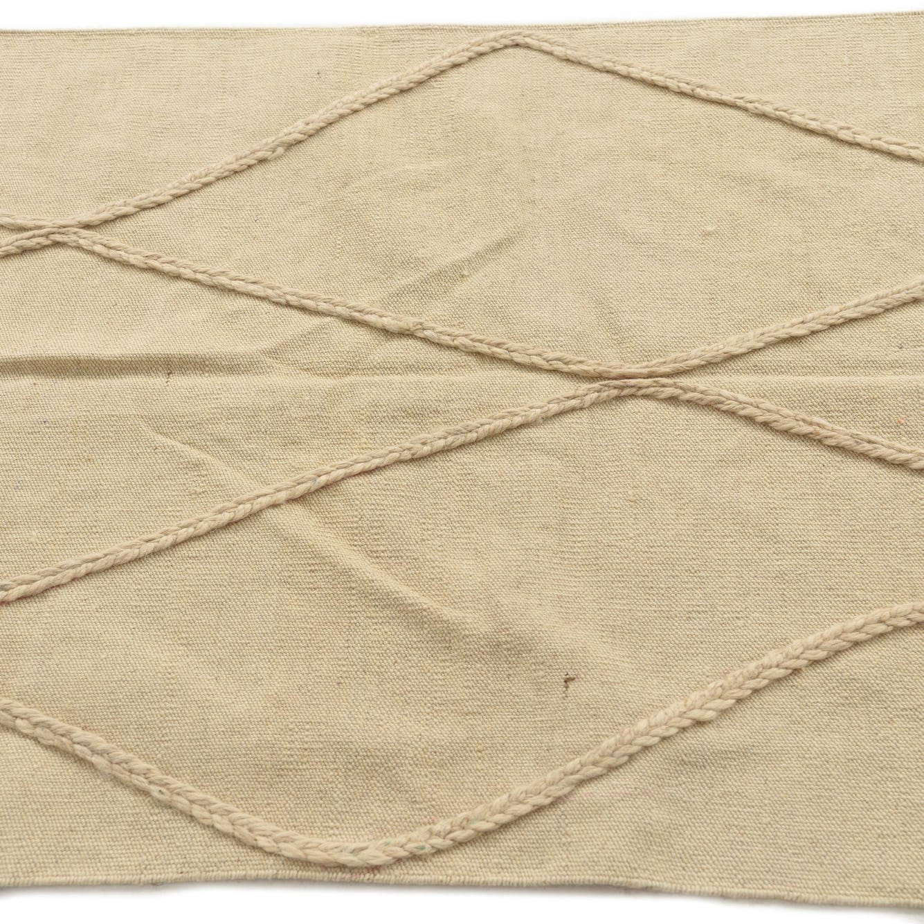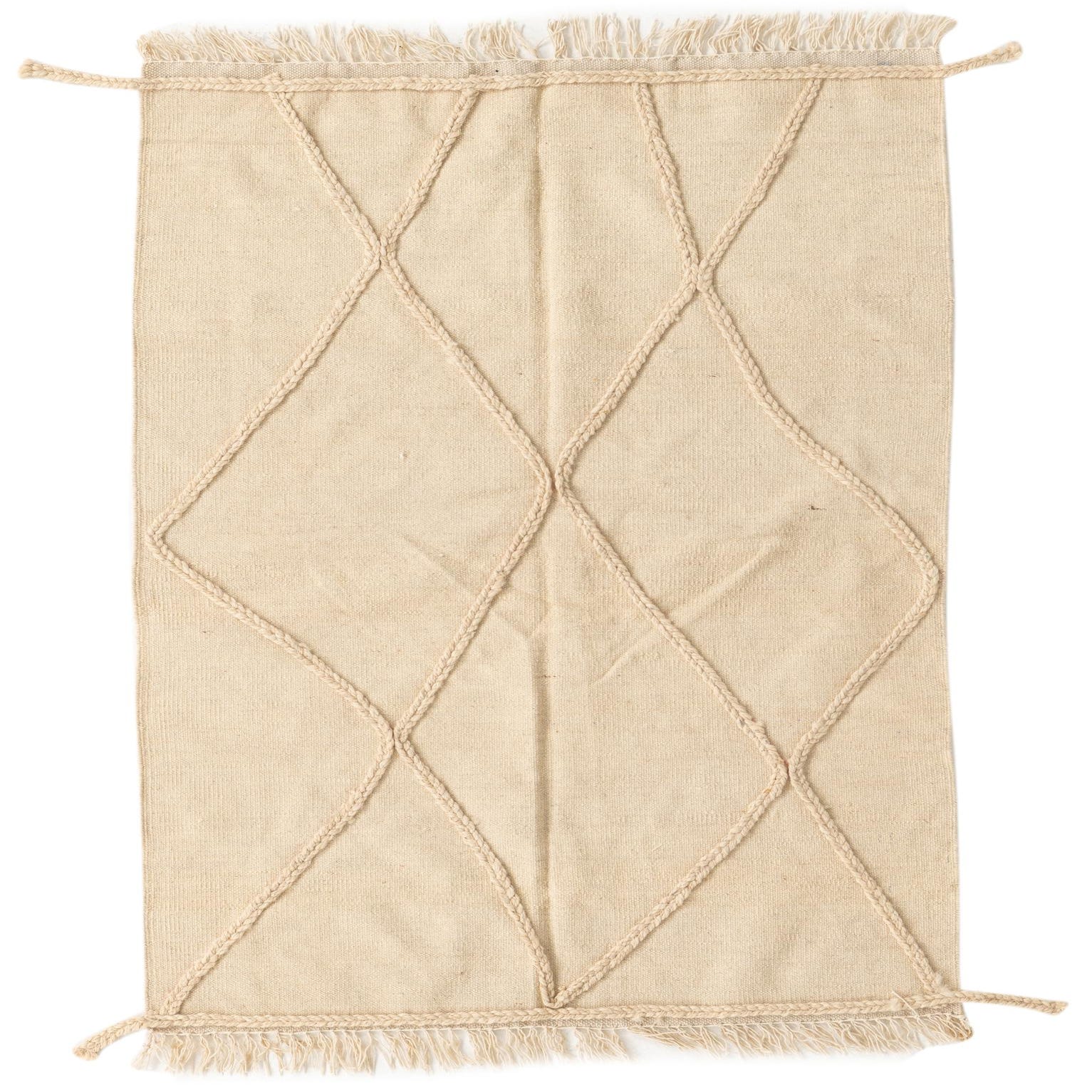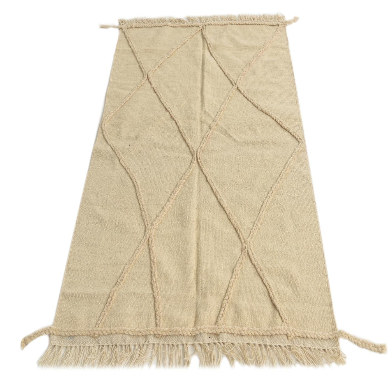 A 3x5 rectangular ivory wool shag rug with a tribal diamond pattern made from braided cords and fringed ends.