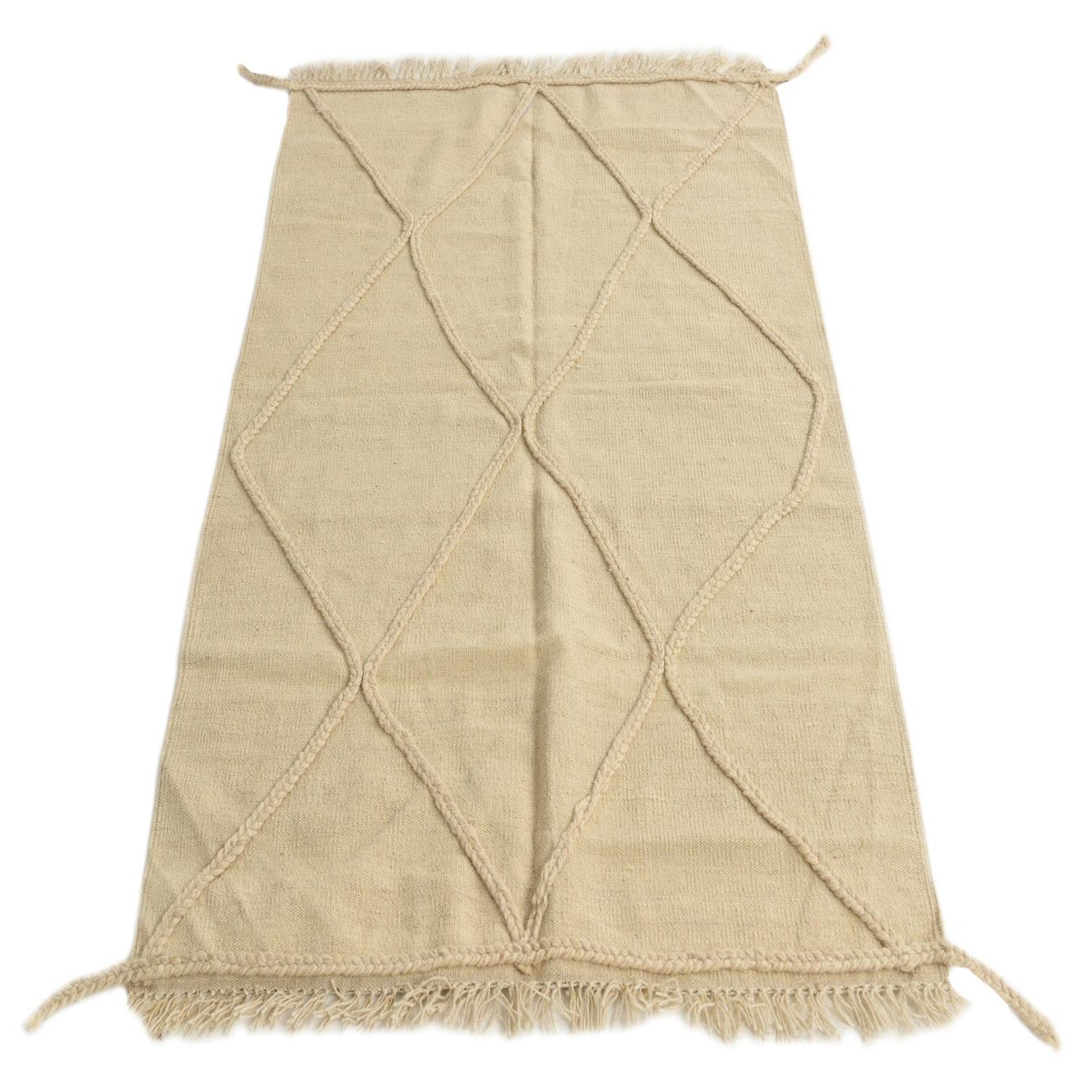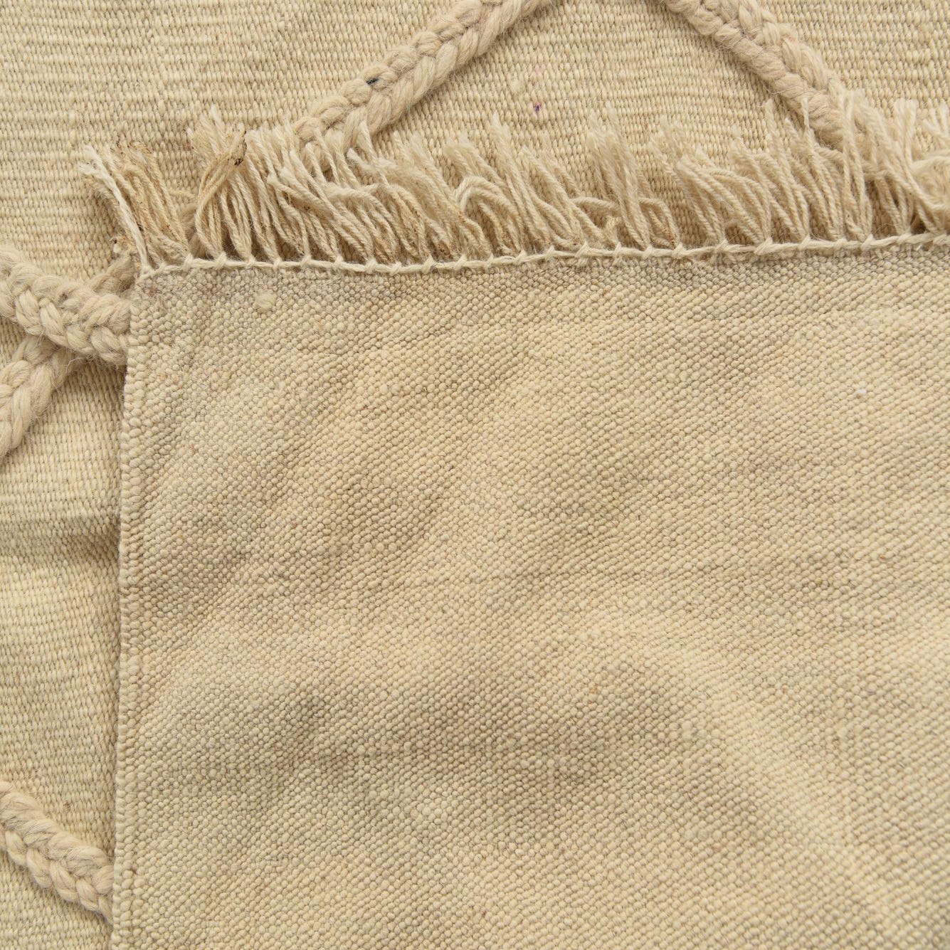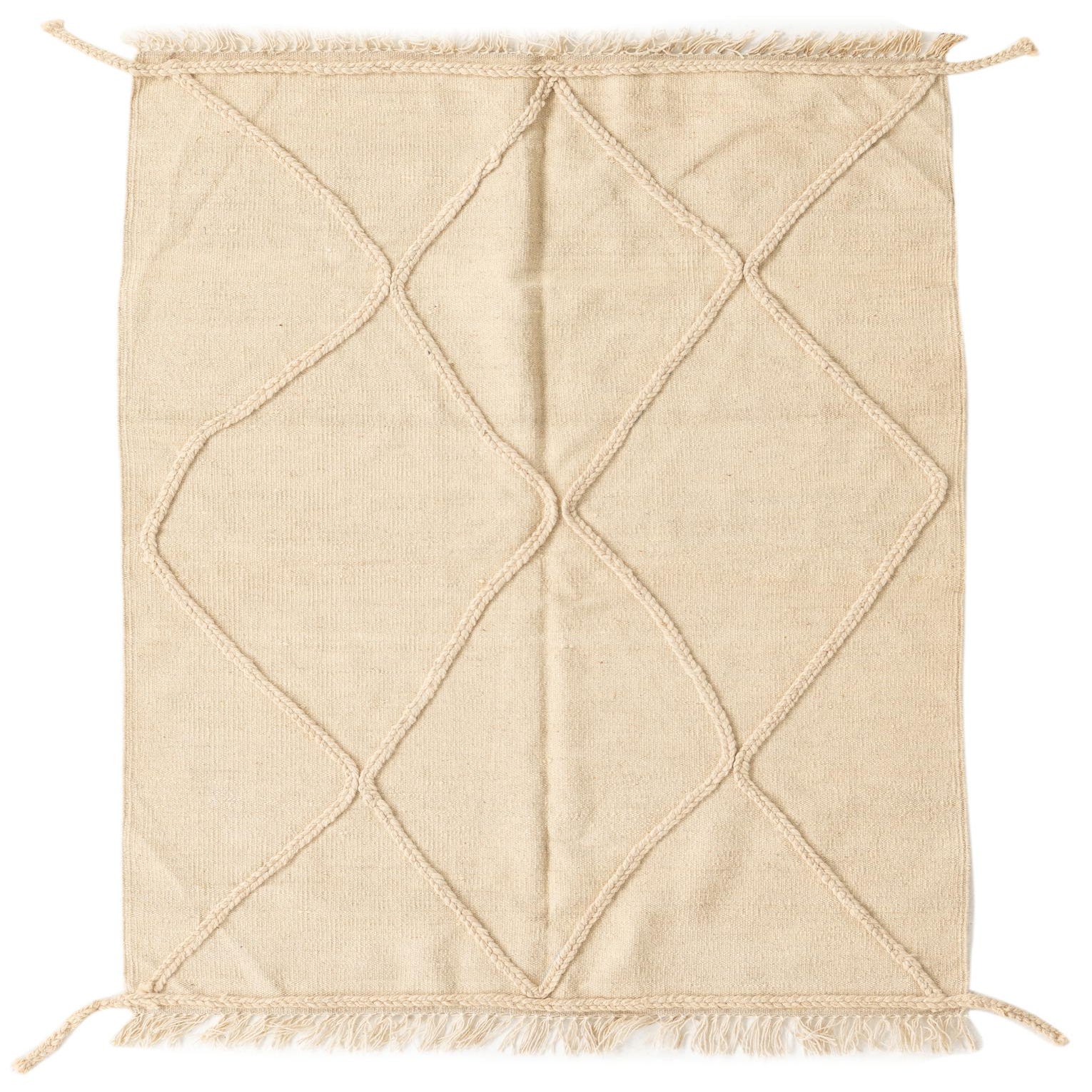A 3x5 rectangular ivory wool shag rug with a braided diamond tribal pattern and fringed edges.