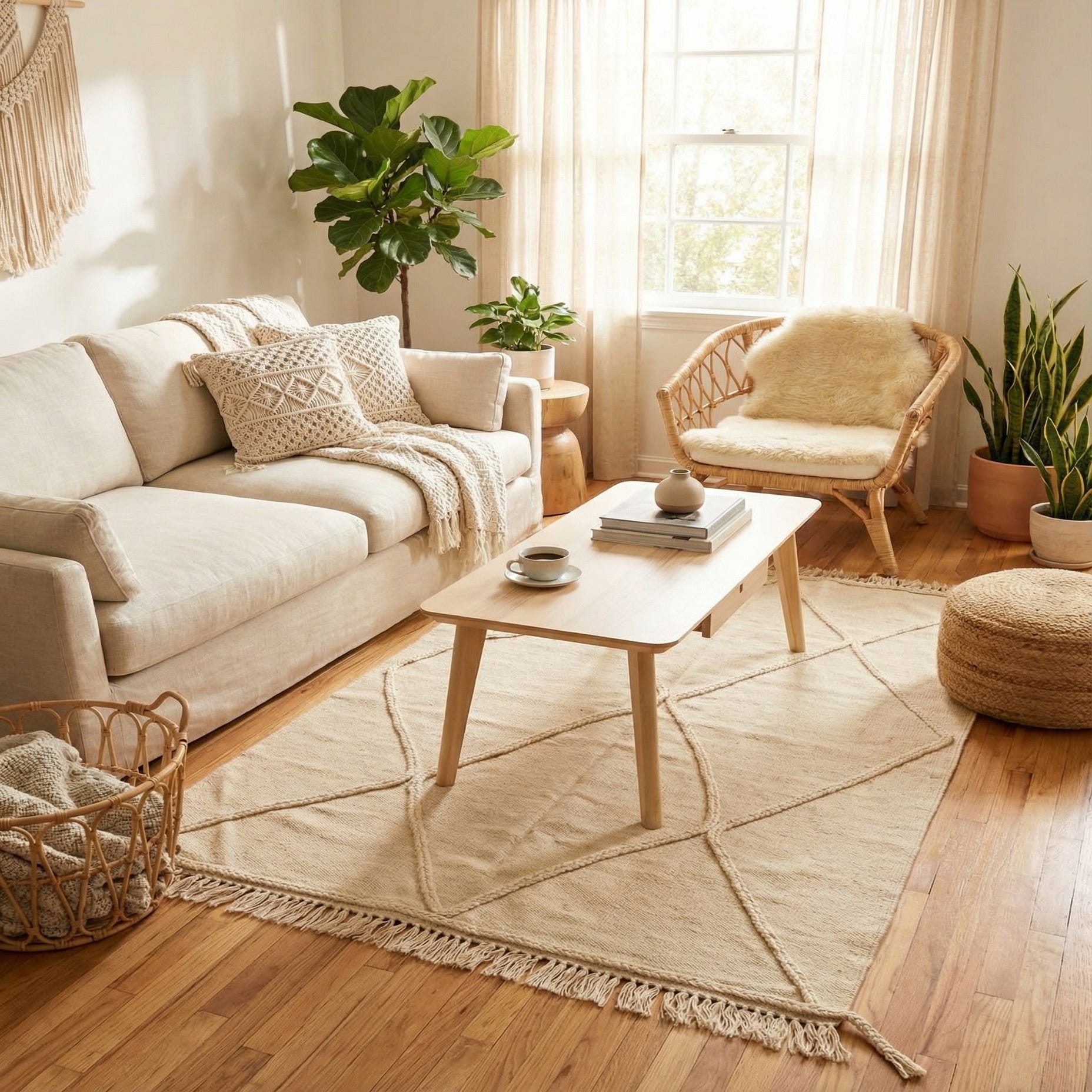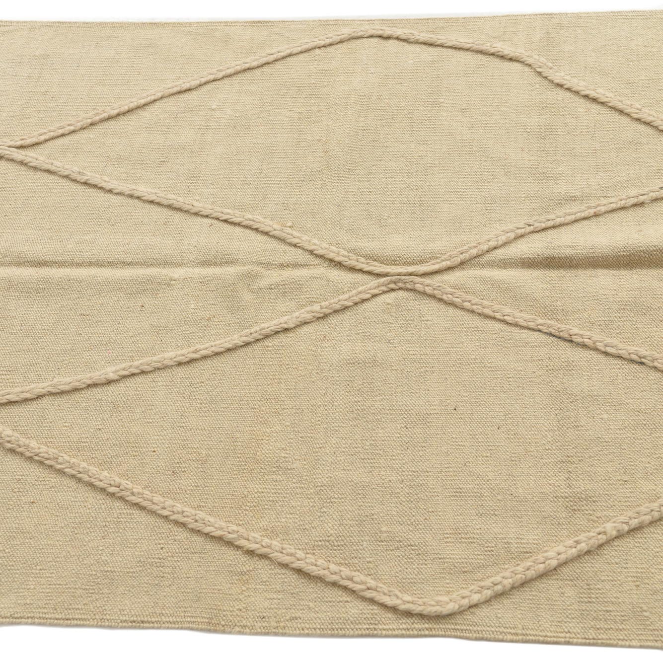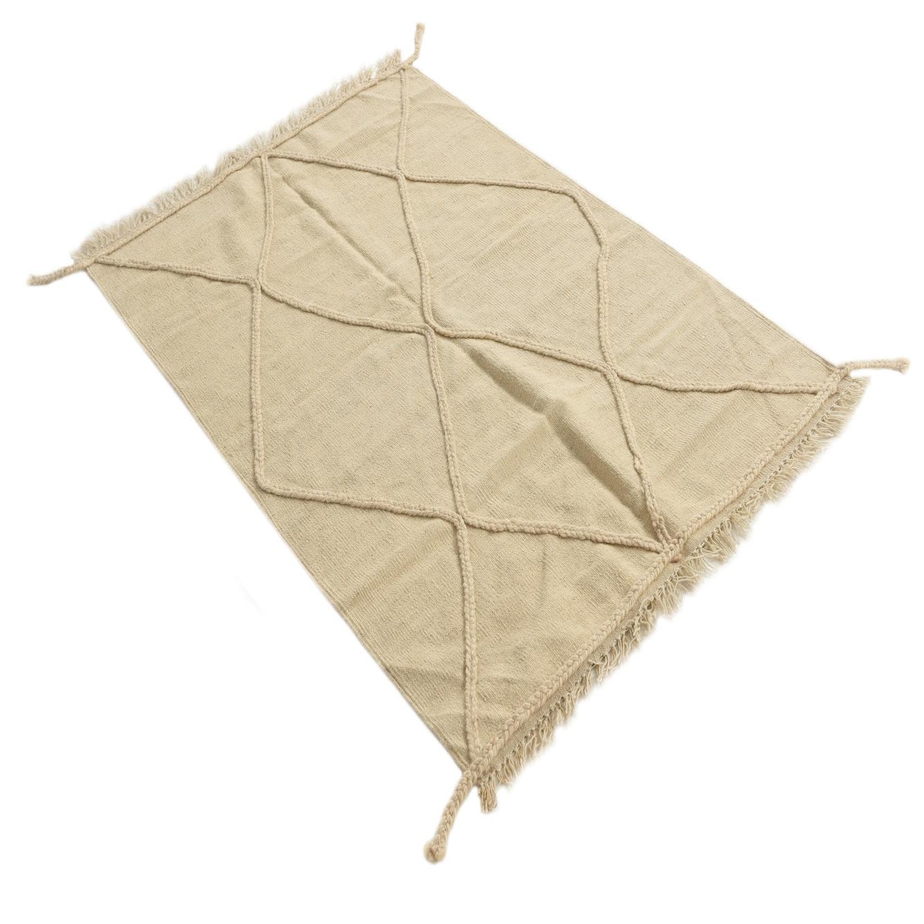 A 3x5 rectangular ivory wool shag rug with a braided diamond tribal pattern and fringed edges.