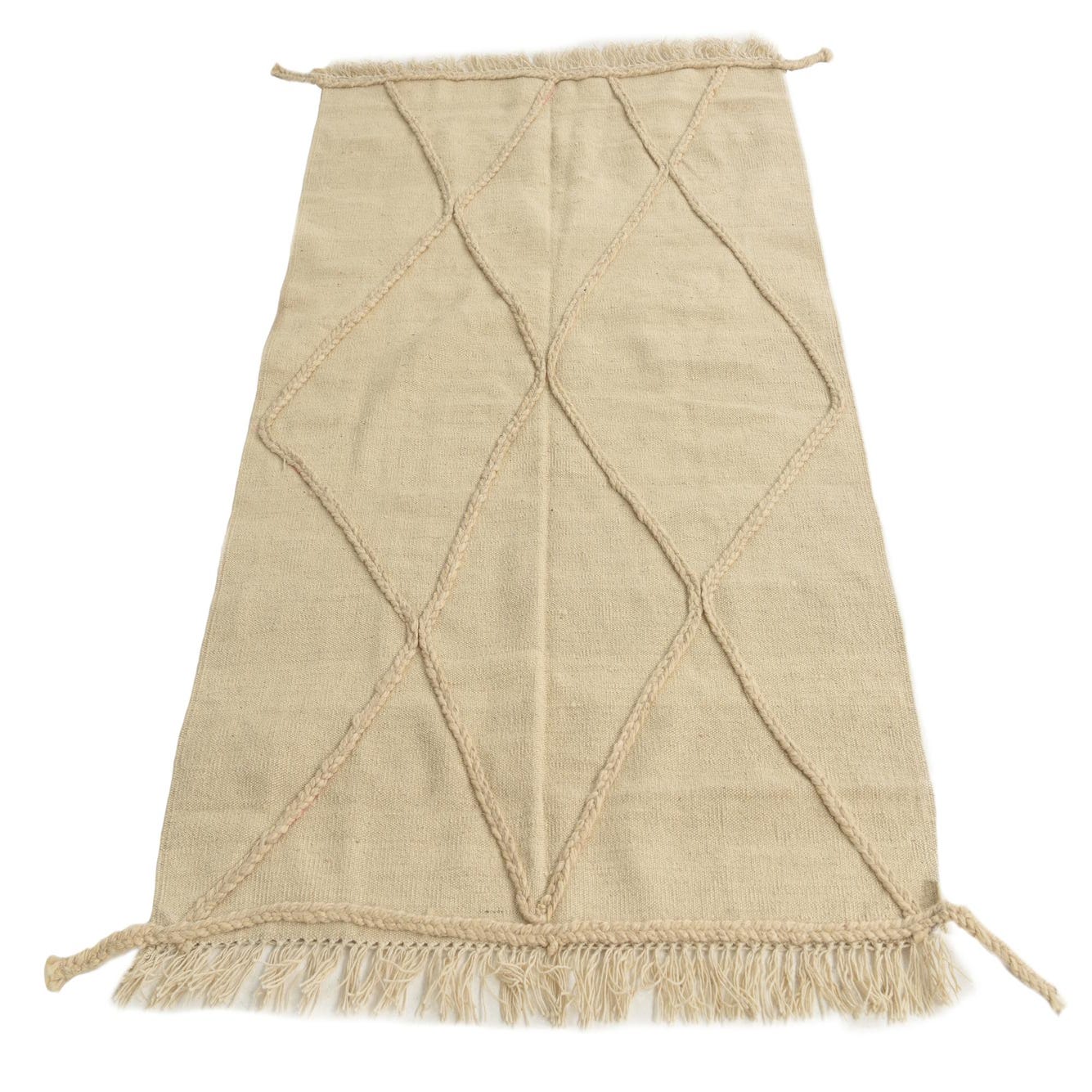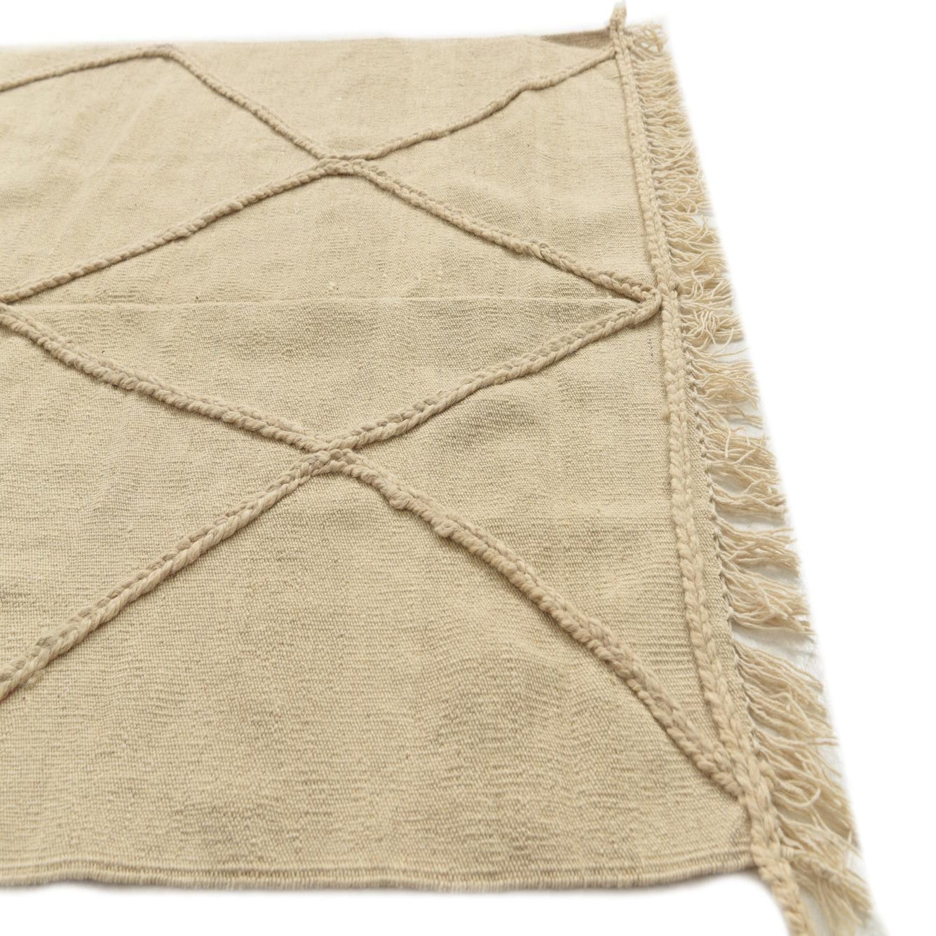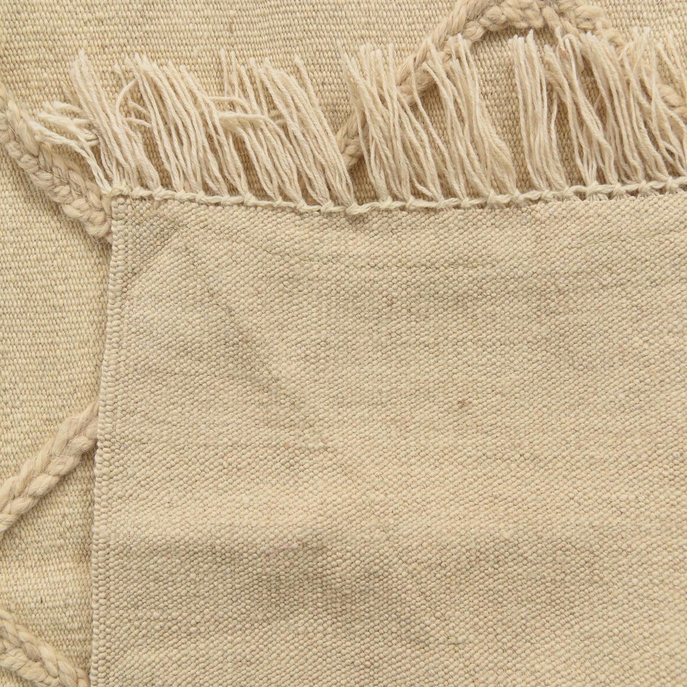 Hand-knotted from 100% wool, this cream rug pairs a low, even pile with a raised braided diamond lattice that adds subtle dimensionality. The monochrome field and hand-spun texture create warm, natural depth while short fringe at the ends gives a casual, crafted finish. Running your hand across the surface, you notice the contrast between the smooth wool foundation and the tactile, knotted lines.