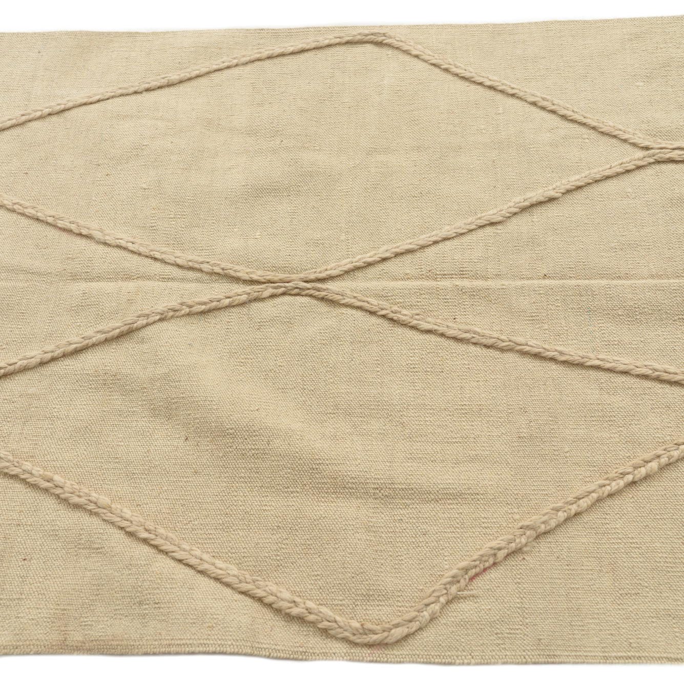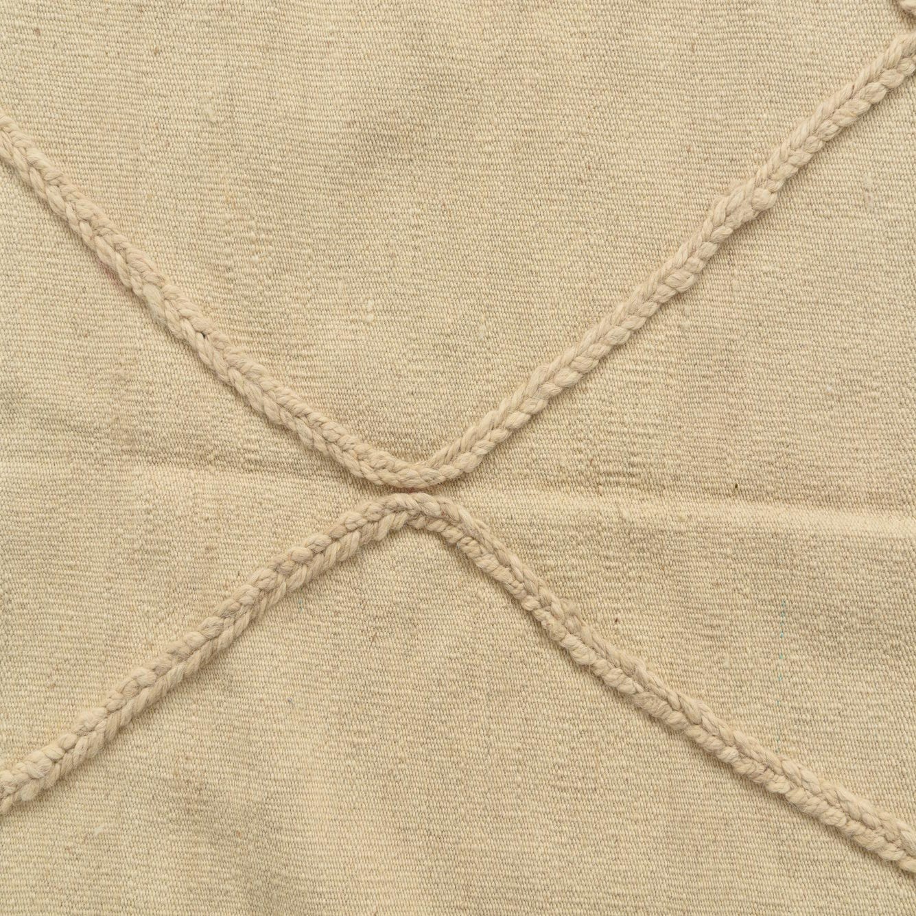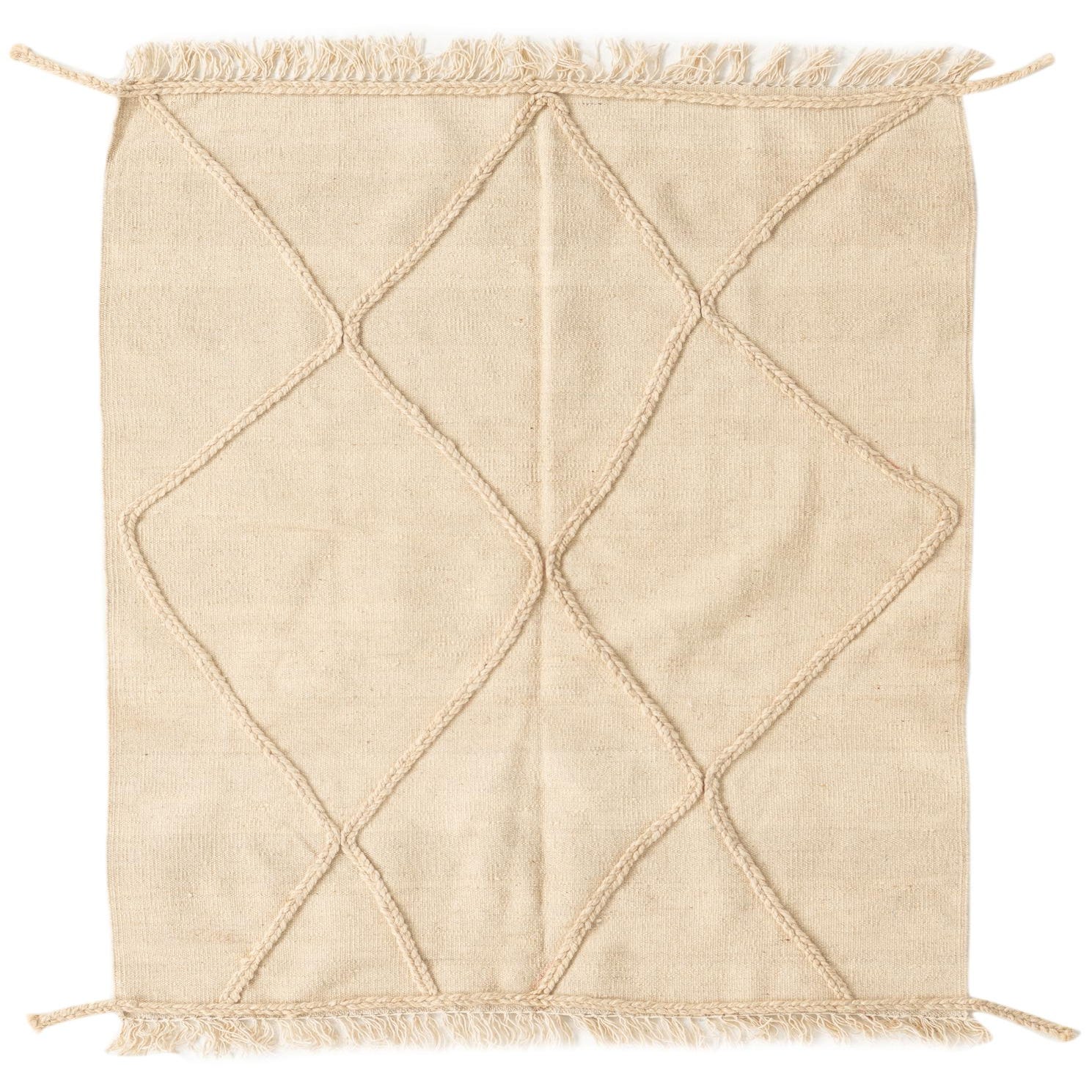 Hand-knotted from 100% wool, this cream rug pairs a low, even pile with a raised braided diamond lattice that adds subtle dimensionality. The monochrome field and hand-spun texture create warm, natural depth while short fringe at the ends gives a casual, crafted finish. Running your hand across the surface, you notice the contrast between the smooth wool foundation and the tactile, knotted lines.