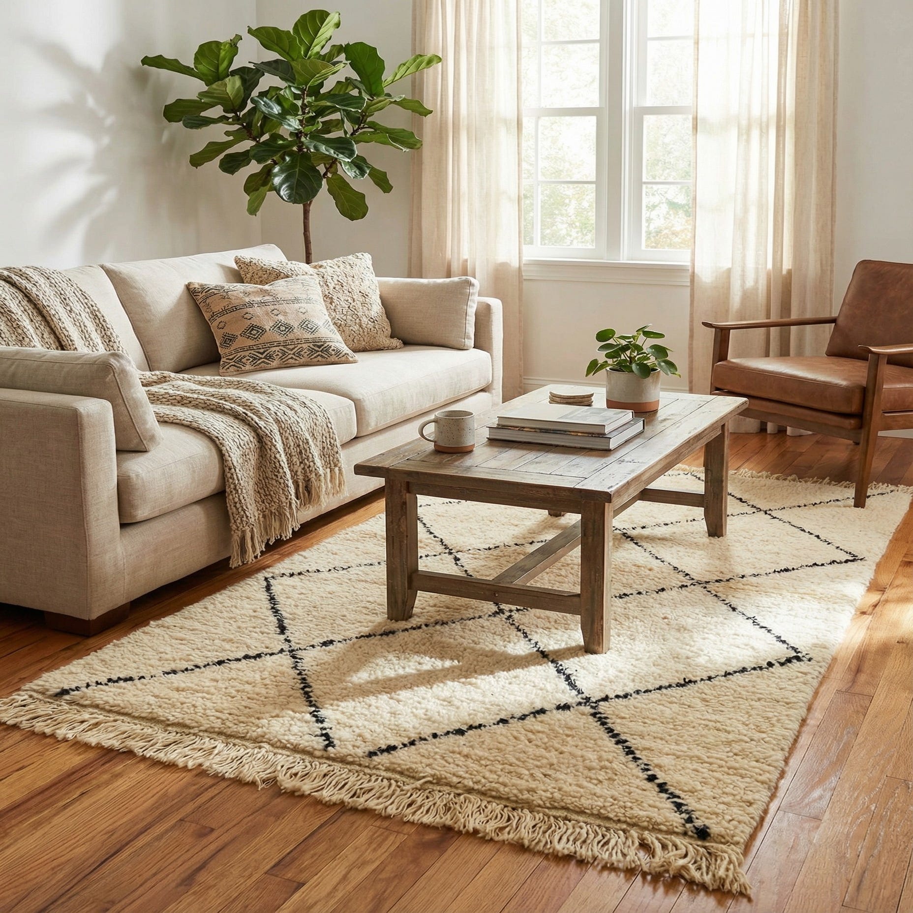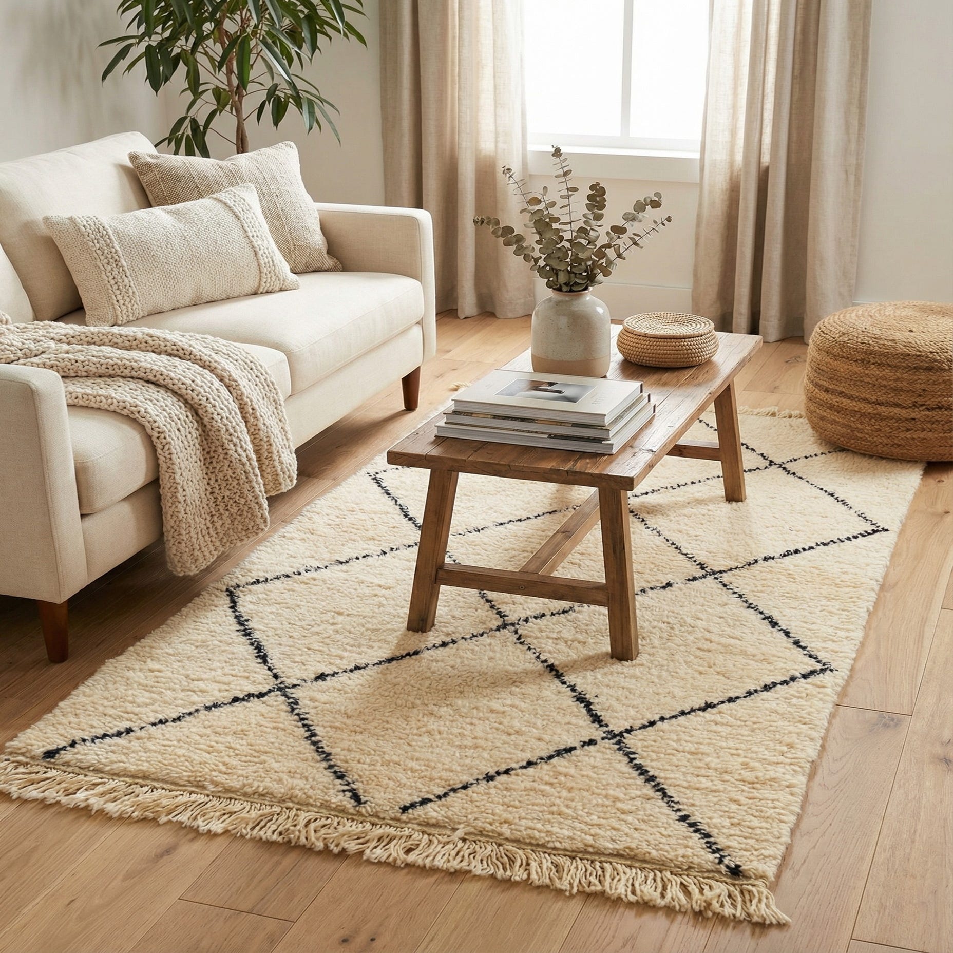 This neutral cream-and-black palette works easily with a variety of interiors: place it in a cozy living area beneath a low-profile sofa, use it to anchor a reading nook with a warm wood chair, or layer it in a minimalist bedroom for added texture. It pairs well with Scandinavian and modern-boho schemes as well as eclectic or mid-century pieces, offering quiet pattern that complements both neutral and color-forward furnishings.