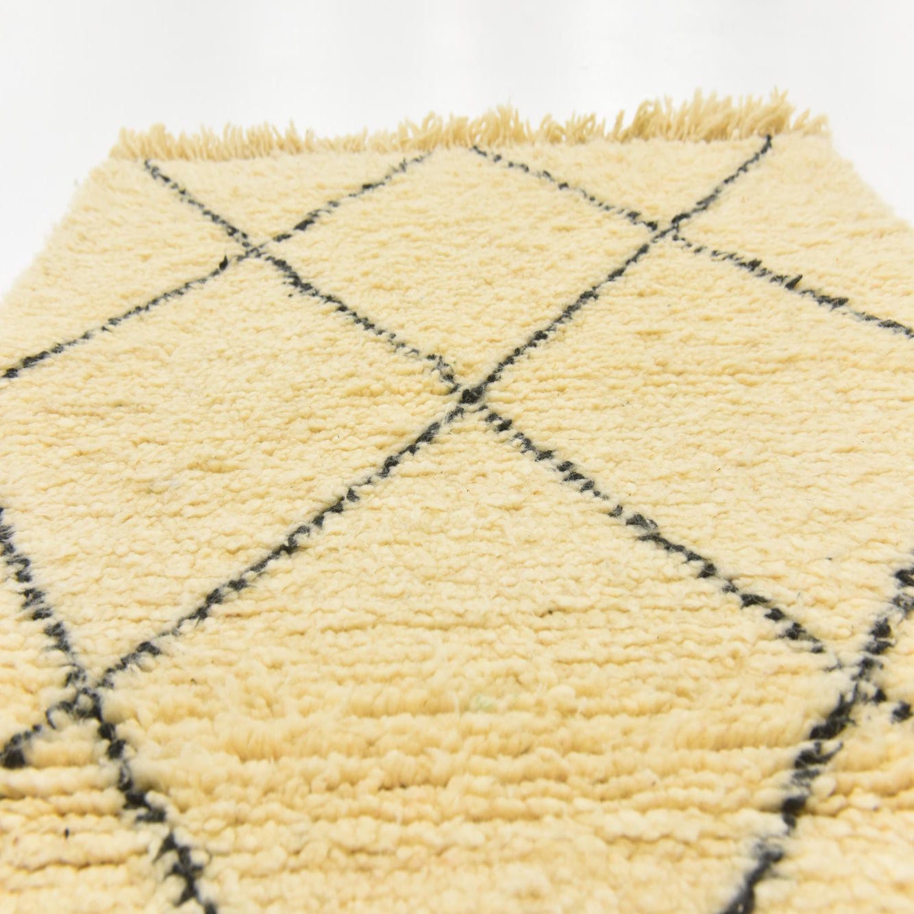 A soft cream field provides the backdrop for a simple black diamond lattice rendered in slightly irregular, hand-drawn lines. Hand-knotted of 100% wool, the rug has a plush, high-pile feel—firm enough to hold its shape but with a springy, cushioned hand underfoot. The wool pile shows subtle variations where the knots meet the pattern, and a short fringe on one edge adds a casual, handmade touch.