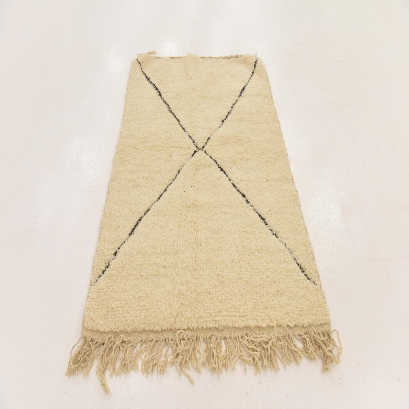 A 3x5 rectangular ivory shag wool rug featuring a bold black X-shaped tribal pattern, with fringe visible at one end.