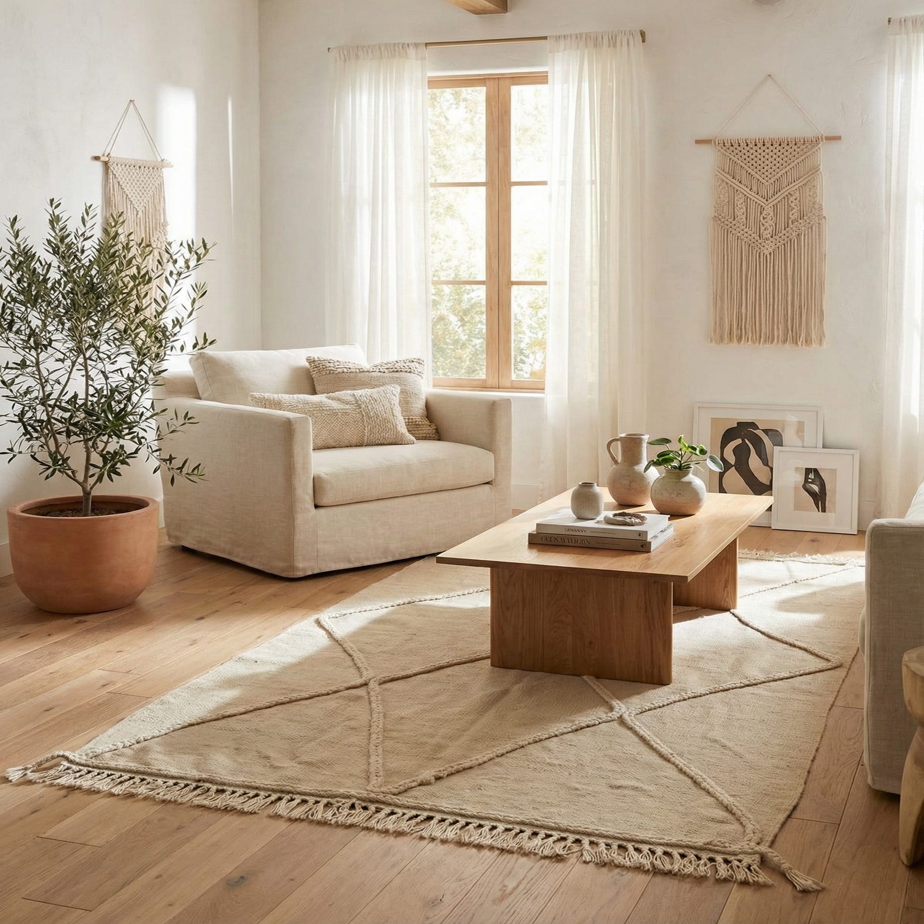 The cream palette, serving as both the background and the primary color of the rug's design, ensures versatility within a variety of interior design scenarios. This rug would be particularly well-suited for spaces that aim for a clean, organic look, such as Scandinavian or modern minimalist living rooms, bedrooms, and studies. Its neutral tone and subtle textural play allow it to complement a range of color schemes, from monochromatic to more vibrant interiors.