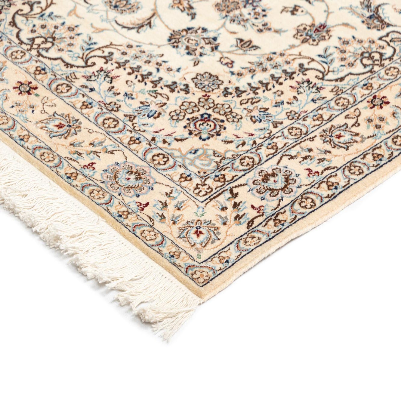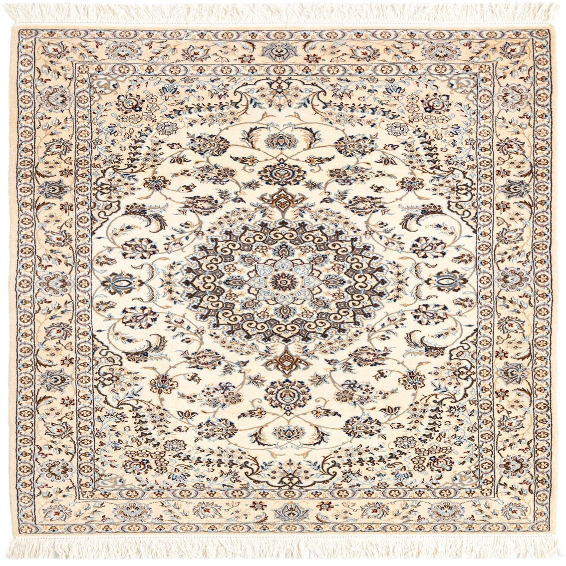 The Nain collection offers a refined 3x5 wool and silk area rug, hand-crafted to bring a touch of elegance to any space. This rug showcases a cream background, complemented by a harmonious palette including shades of brown, dark blue, blue, and beige. Its intricate pattern features a prominent central medallion surrounded by symmetrical floral motifs, bordered by a detailed edge design that enhances the rug's overall aesthetic.