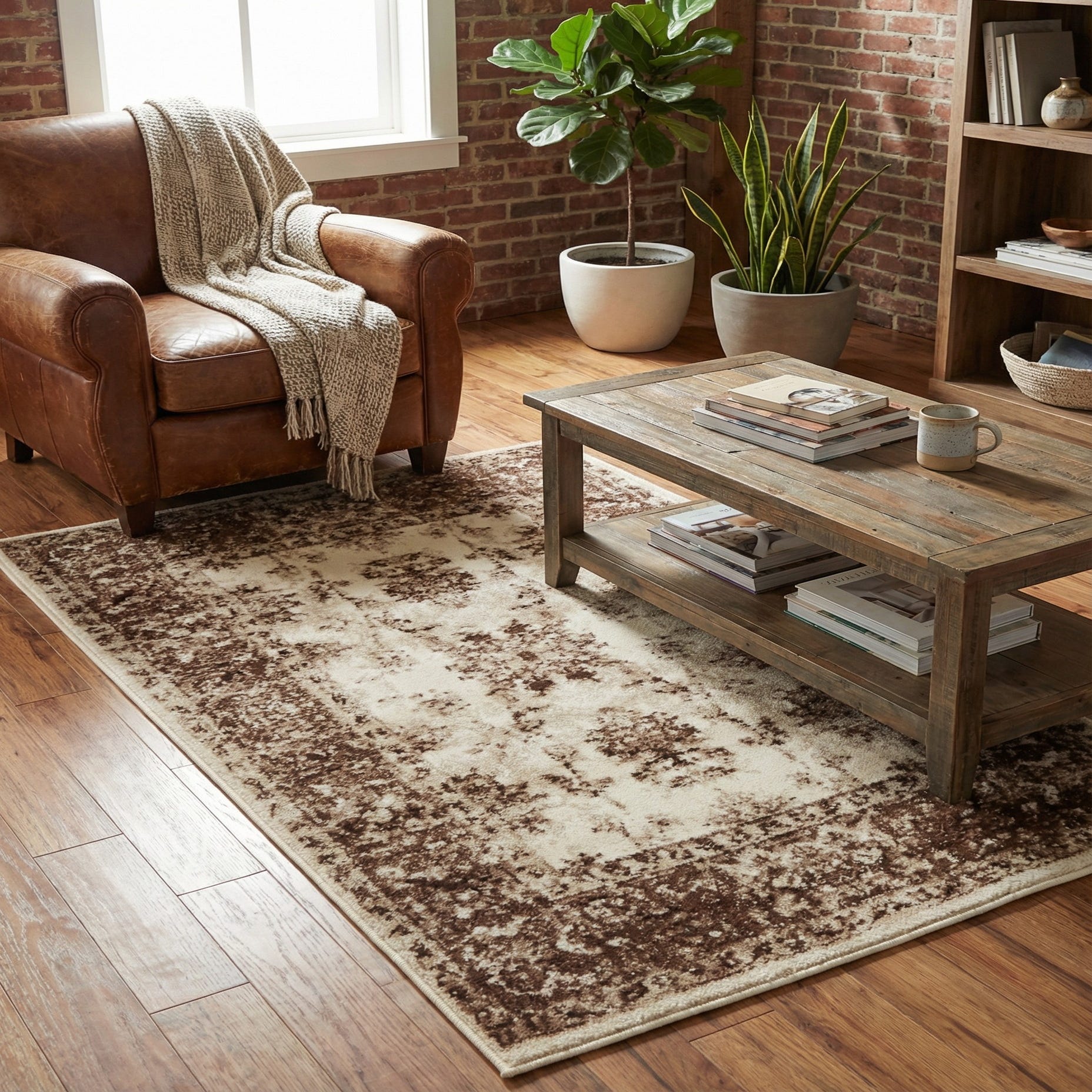 A softly distressed traditional pattern centers on a subtle medallion framed by an aged border, creating an antique-inspired look with gentle visual texture. The cream ground is accented with beige, light brown and richer brown tones that layer across the design, while the machine-made construction of 55% polypropylene and 45% polyester provides a soft, dense pile with a slight sheen that brings out the pattern’s depth.