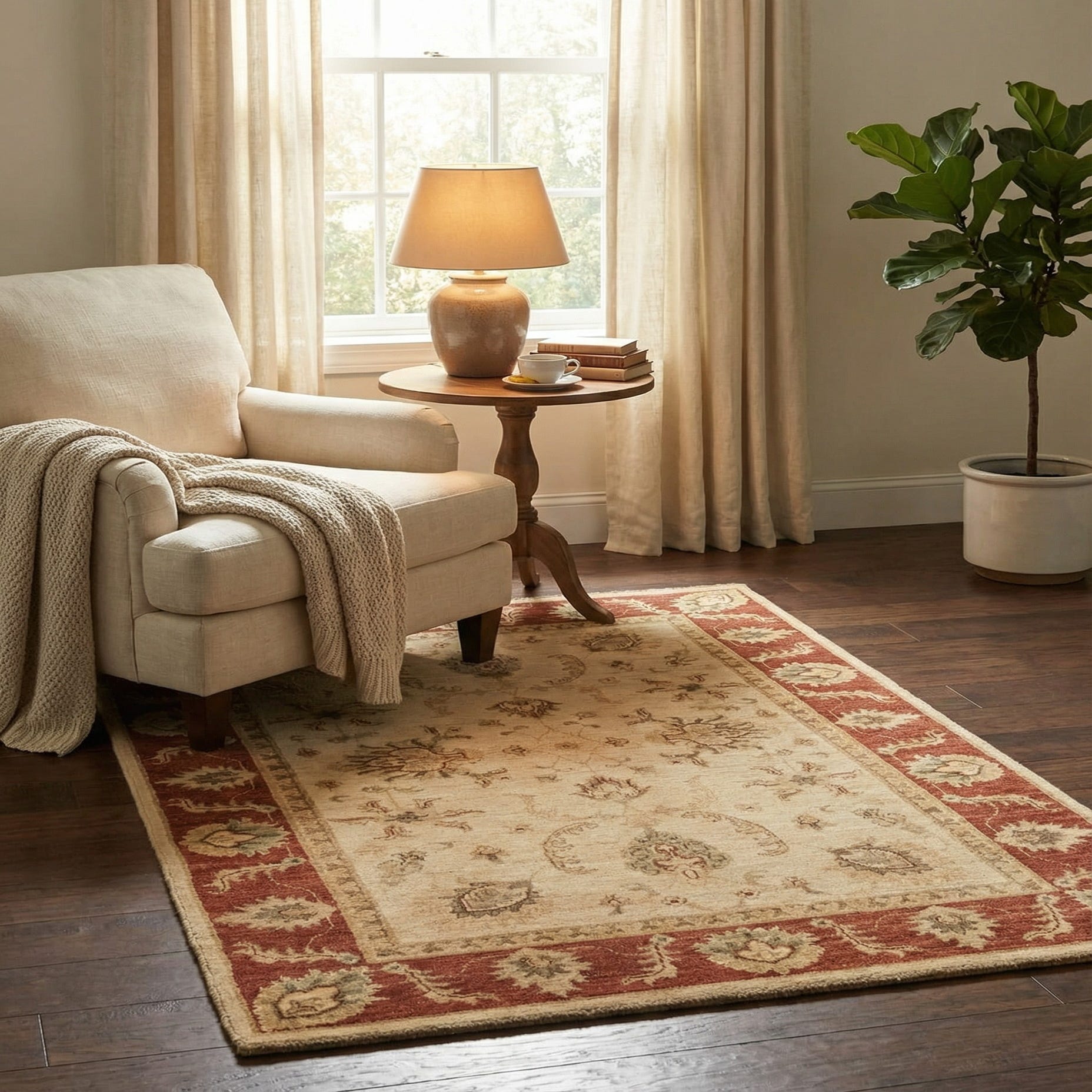 Primary color is Cream. Colors in this rug include: Cream, Beige, Light Green, Olive, Red, Tan.