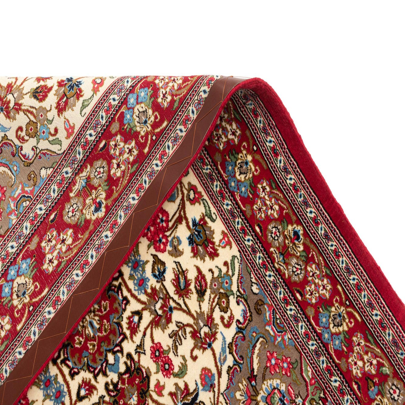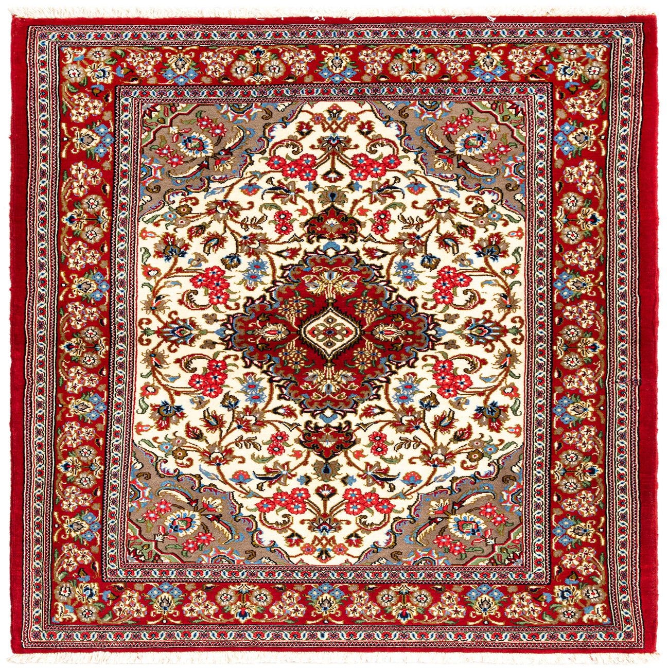 A 3x5 rectangular Qom Persian rug with a central medallion, featuring intricate floral patterns in red, blue, and brown on an ivory field, framed by a rich red border.
