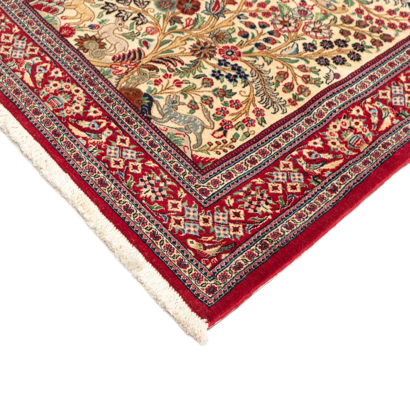 A 3x5 rectangular Persian rug with an ivory field and a red border, featuring a Tree of Life pattern with colorful birds and animals.