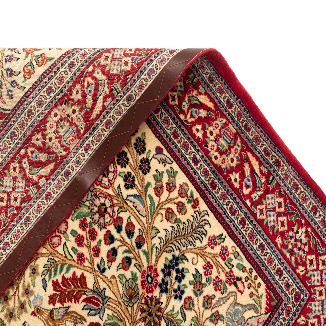 The Ghom collection presents a hand-made wool rug featuring a cream background color that sets a refined stage for the elaborate pattern it showcases. Distinctive florals and foliage intertwine across the surface in a symphony of vibrant hues, including reds, blues, and greens, ornamented with smaller accents in softer tones. Intricate border designs frame the central theme, highlighting geometrical elements and complementary color schemes that echo the richness of the inner field.