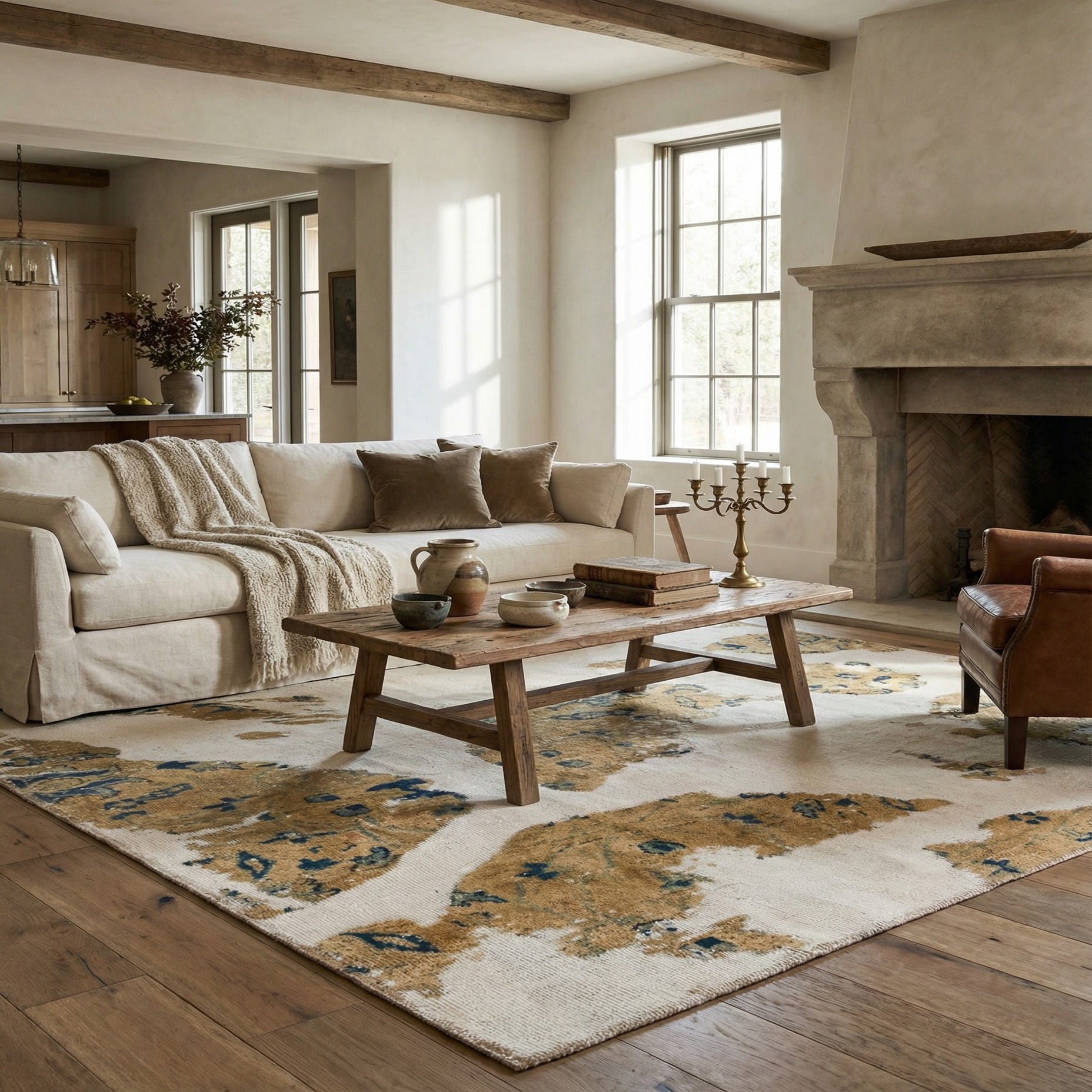 Primary color is Cream. Colors in this rug include: Cream, Brown, Green, Light Brown, Navy Blue.