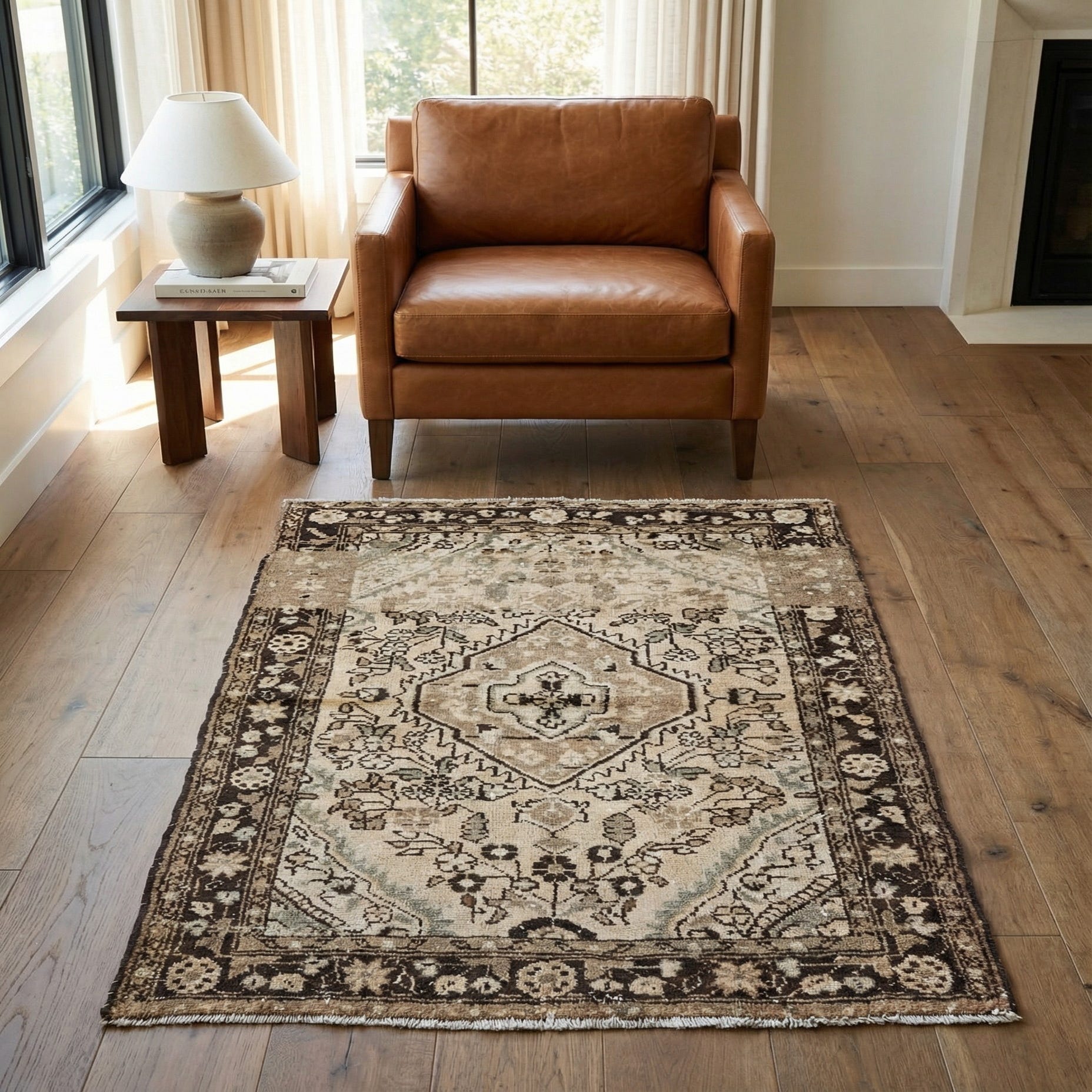Given the neutral yet rich color palette, this rug can easily integrate into a variety of interior designs, from traditional to more modern spaces, serving as an elegant anchor in a living room, study, or even a bedroom. It would pair well with both dark and light furniture, enhancing wooden tones and creating a warm ambiance in the chosen room.