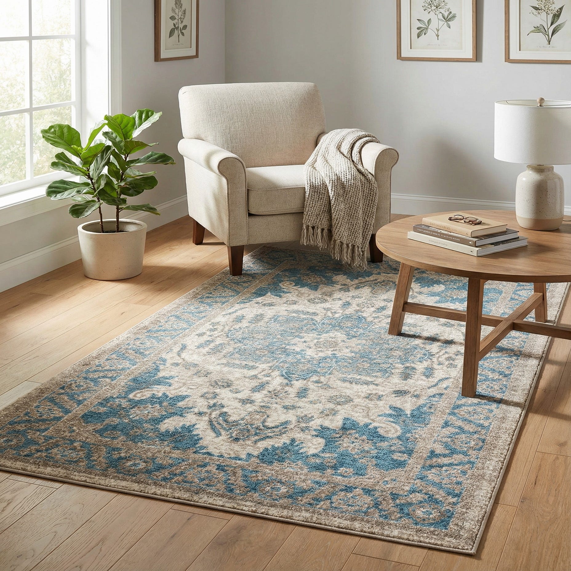 Works well in transitional and coastal-inspired rooms where a touch of classic patterning is welcome without overwhelming the space. Pair it with a gray or natural wood sofa and light linens for a relaxed living room, tuck it under a small dining table to ground a breakfast nook, or layer it in a bedroom to add subtle color and pattern to neutral bedding. The calming palette makes it easy to coordinate with both cool and warm finishes.