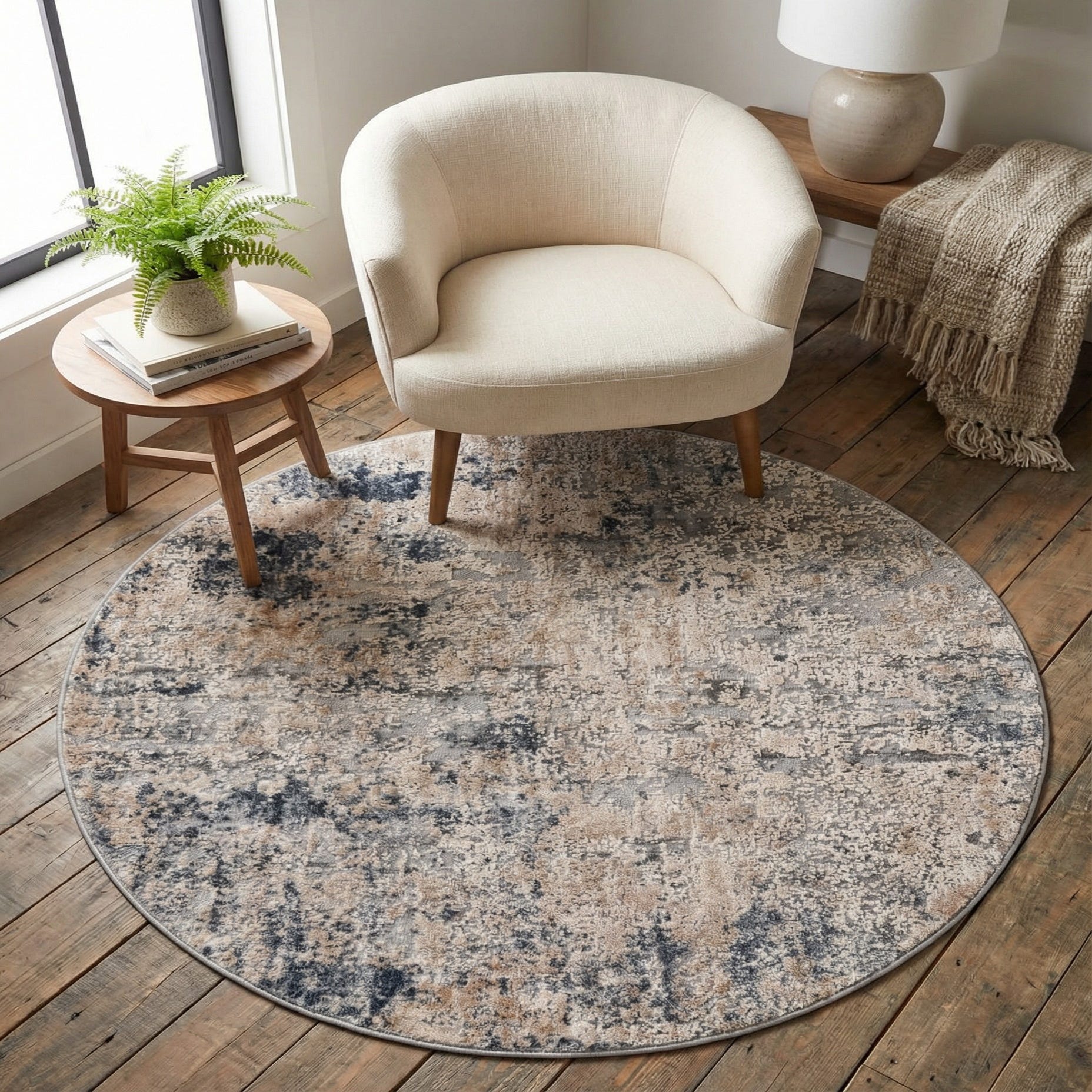 The round silhouette and neutral palette make this rug versatile in a range of interiors. Use it to anchor a breakfast nook or round dining table, soften a minimalist living area with charcoal or navy seating, or add layered texture at the foot of a bed. Pair it with light woods and mixed-metal accents for a contemporary look, or combine with linen upholstery and muted decor for a calm, transitional setting.