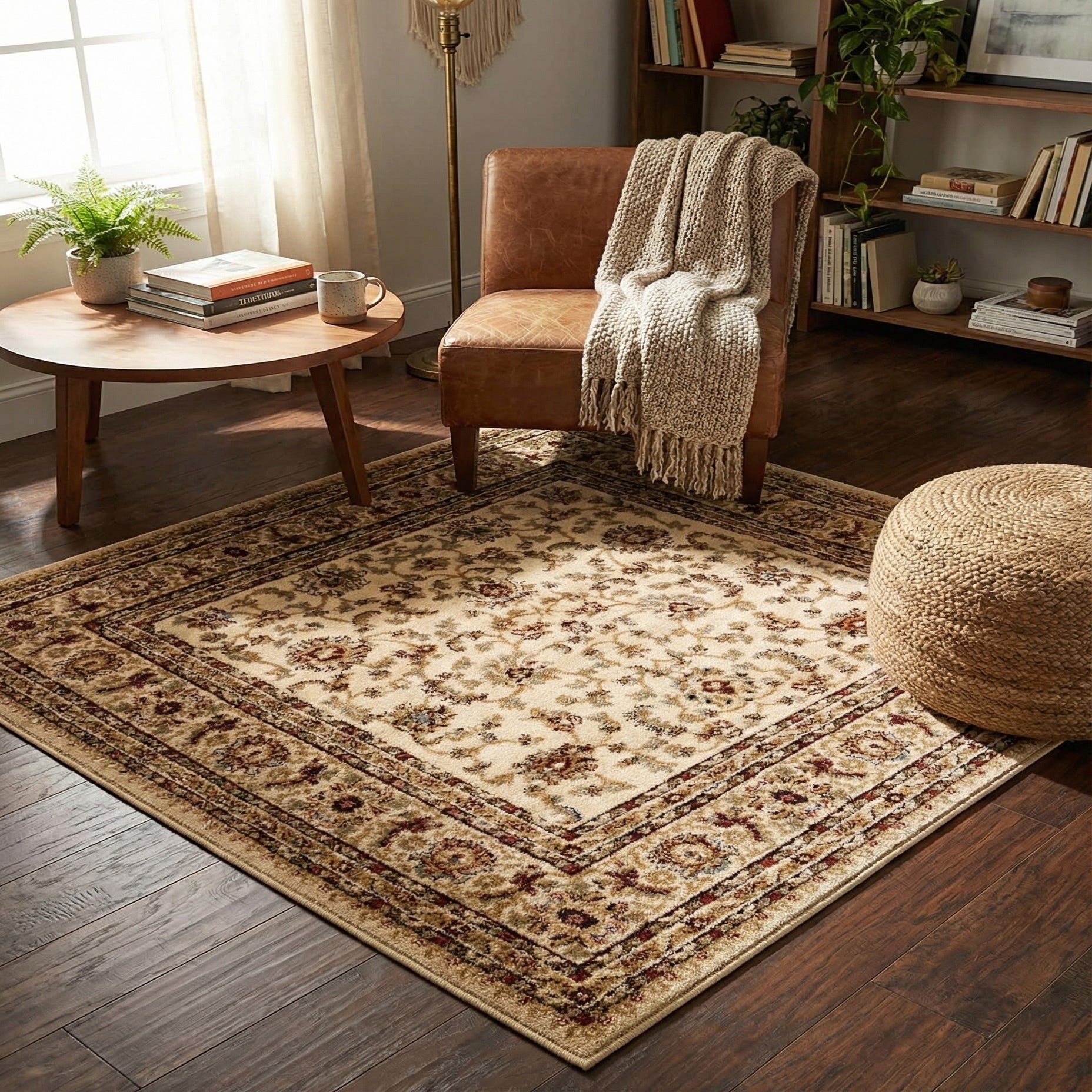Machine-made from 100% polypropylene, the rug has a low, dense pile that feels soft underfoot and displays the pattern with clear definition and a gentle, synthetic sheen. It works well as an anchor in a living room beneath a coffee table, in an entry or foyer to set a welcoming tone, or layered in a dining space to complement warm wood finishes. Pair it with neutral upholstery and warm woods for a cohesive traditional or transitional interior, or use it to add a touch of pattern to a simple, contemporary space.