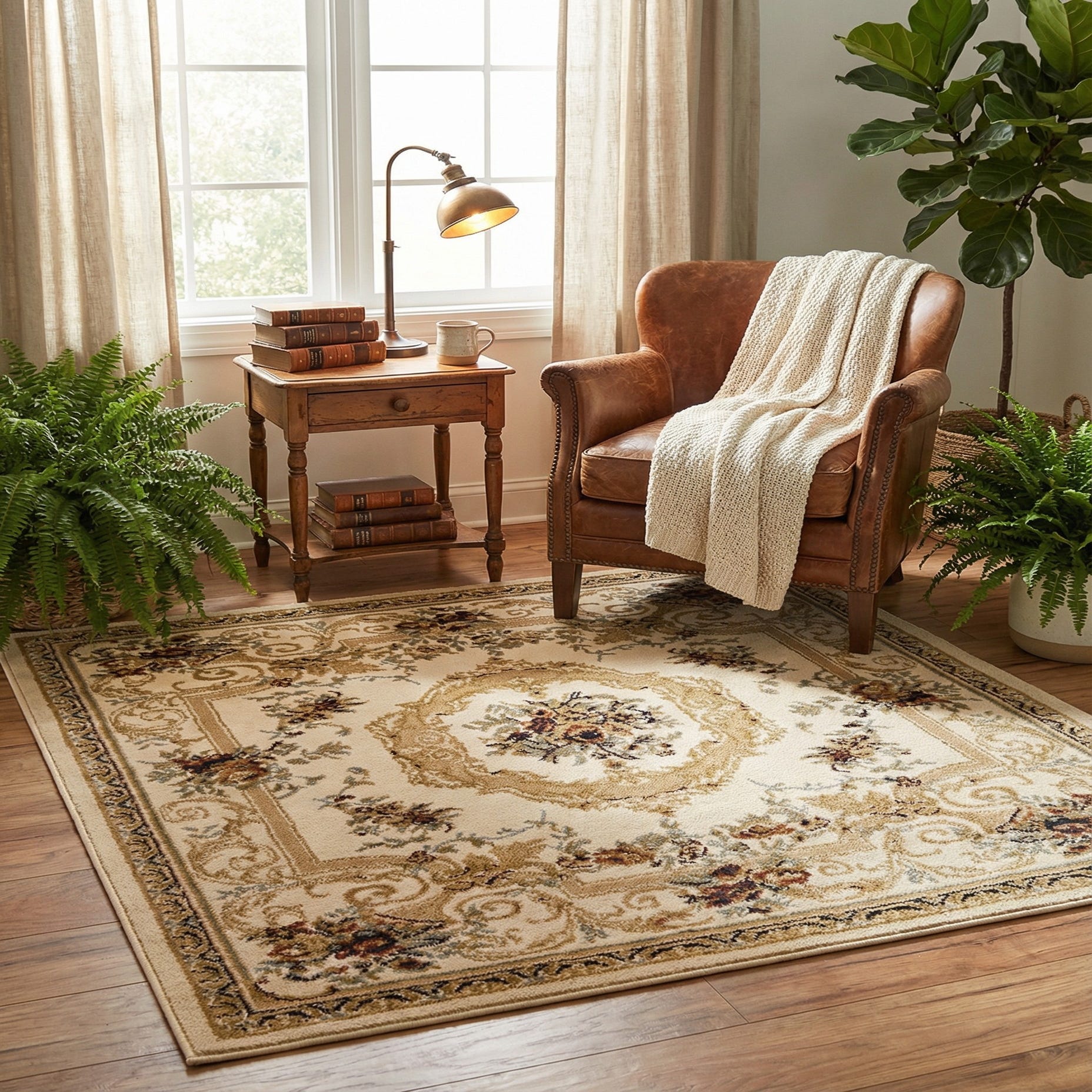 A classic medallion layout anchors this rug with an ornate border and scrolling vine motifs that evoke traditional European design. The cream field sets a soft, neutral stage for clusters of floral bouquets in red and rust red, while leaves in muted green and accents of tan and brown add layered depth. The pattern reads formal without feeling heavy, and the low, dense pile has a smooth, slightly springy hand underfoot that highlights the woven motifs.