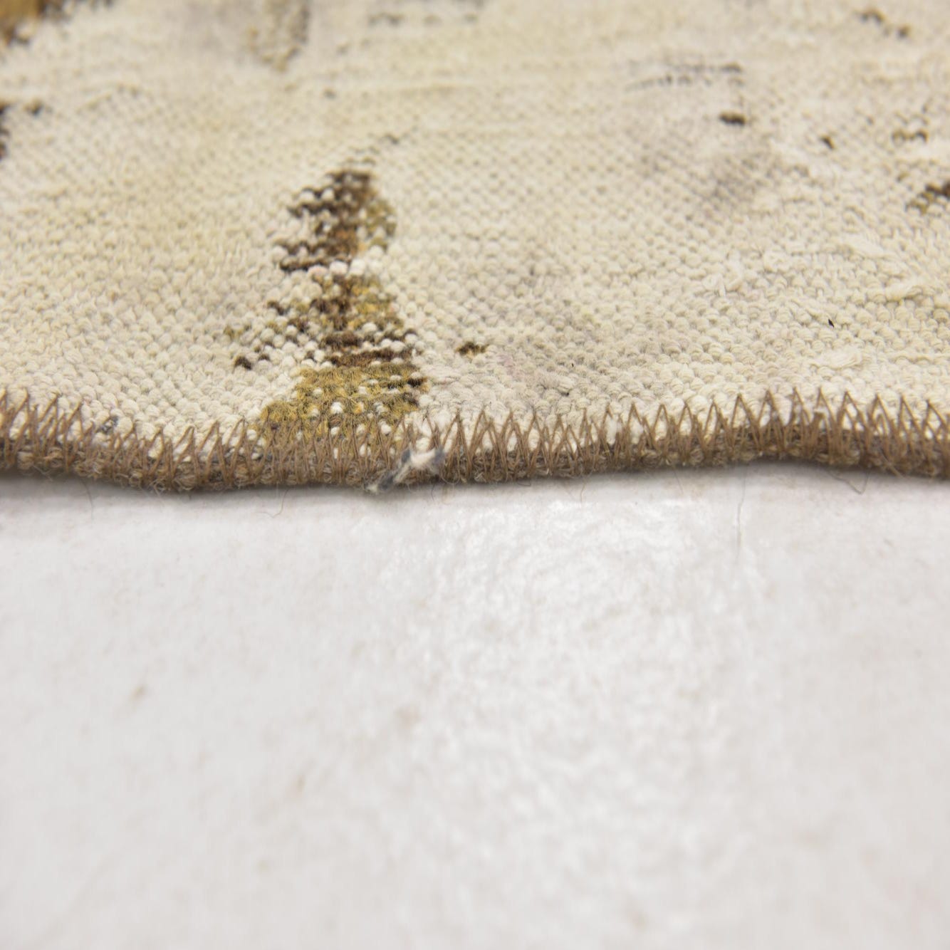 A square 3'10" x 4'0" ivory and cream wool rug with a distressed, abstract vintage pattern, suitable for indoor spaces.