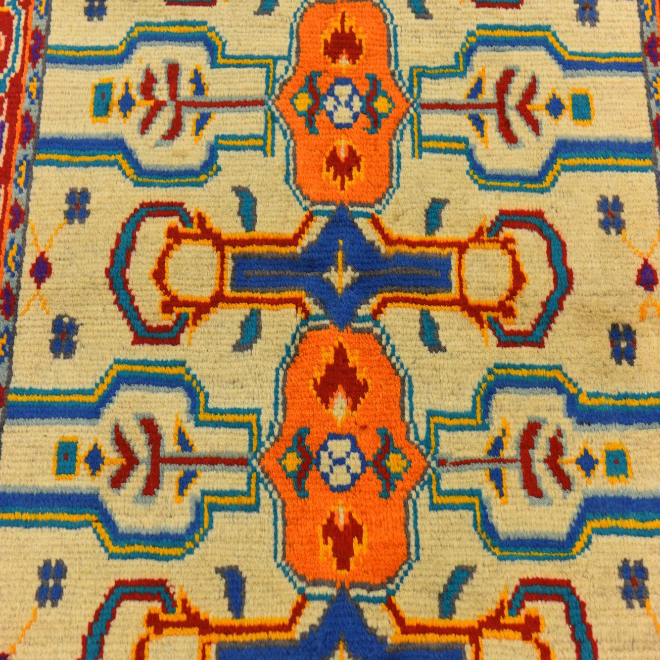 Primary color is Cream. Colors in this rug include: Cream, Blue, Gray, Orange, Red, Teal, Yellow, Light Blue, Gold, Purple.