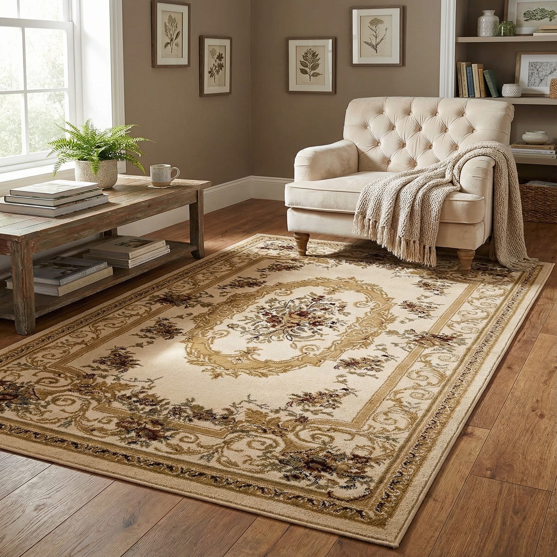 This piece works well in a small living area or entry where the medallion can be centered beneath a coffee table or console, and it can also anchor a bedside vignette or a cozy reading nook. Pair it with warm wood furniture, leather seating, and brass or aged-metal accents for a traditional look, or blend it with painted case goods and soft linens for a relaxed, transitional scheme. The neutral cream base and warm accent tones make it easy to layer into classic, cottage, or formal dining settings.