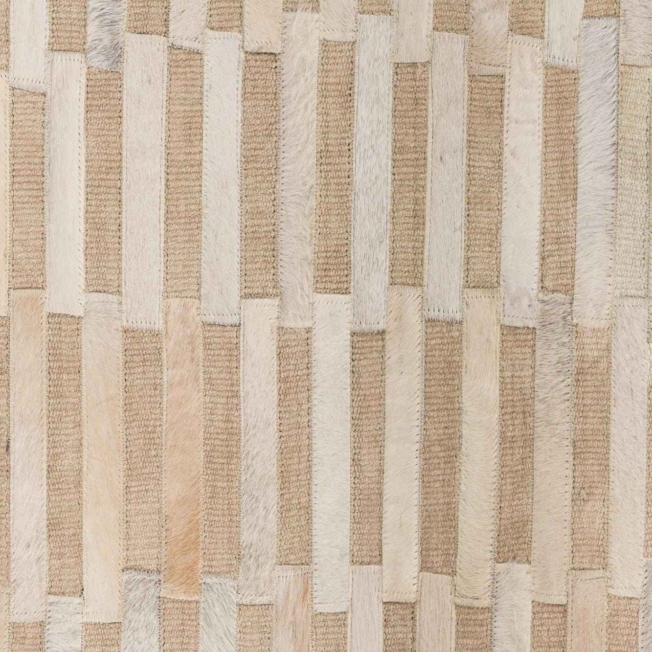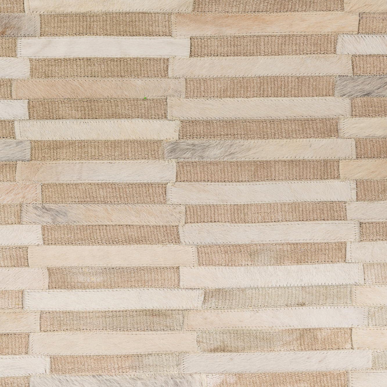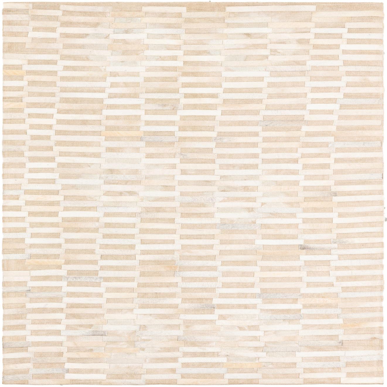 A 4x6 rectangular ivory and cream modern rug made from cowhide and leather, featuring a horizontal stripe pattern.