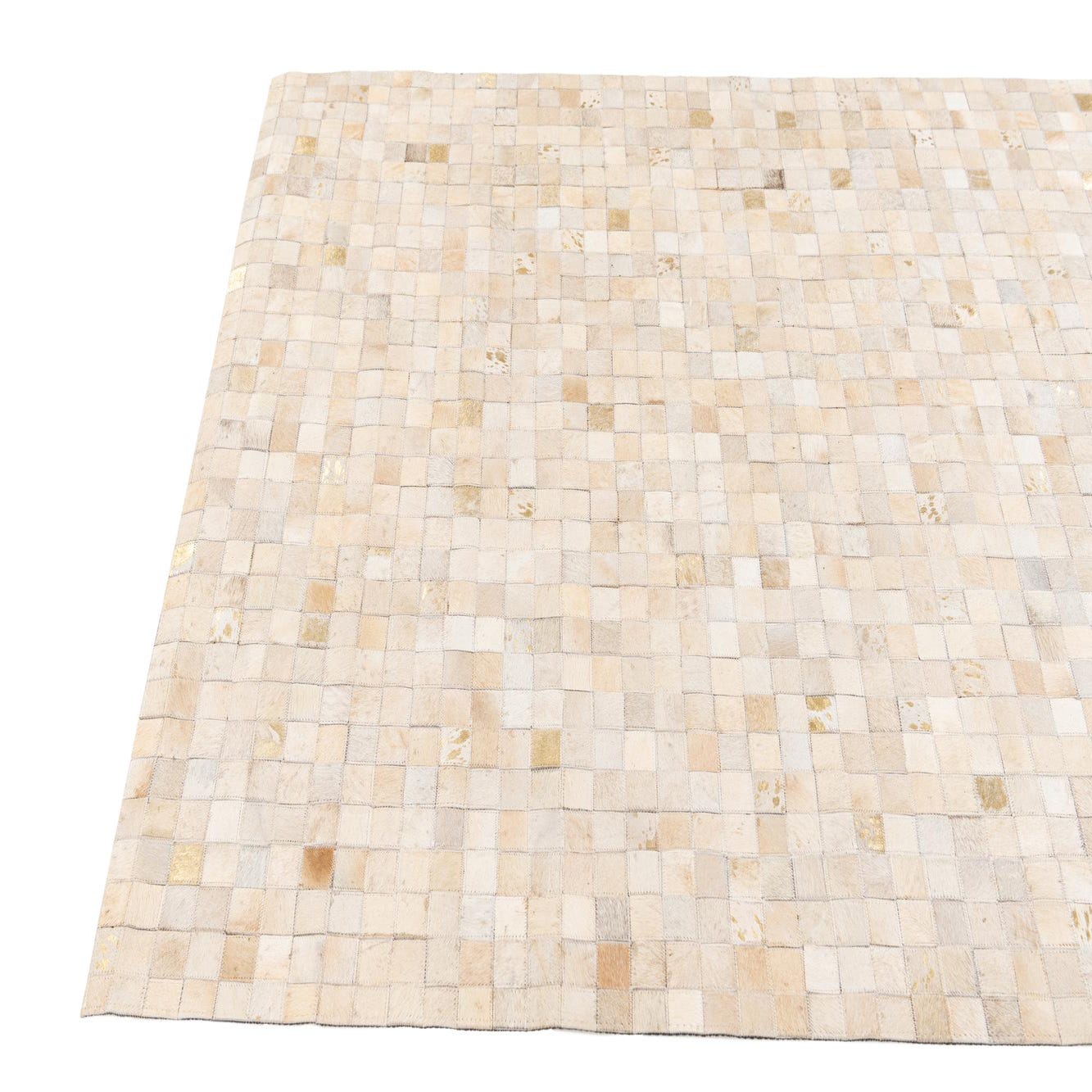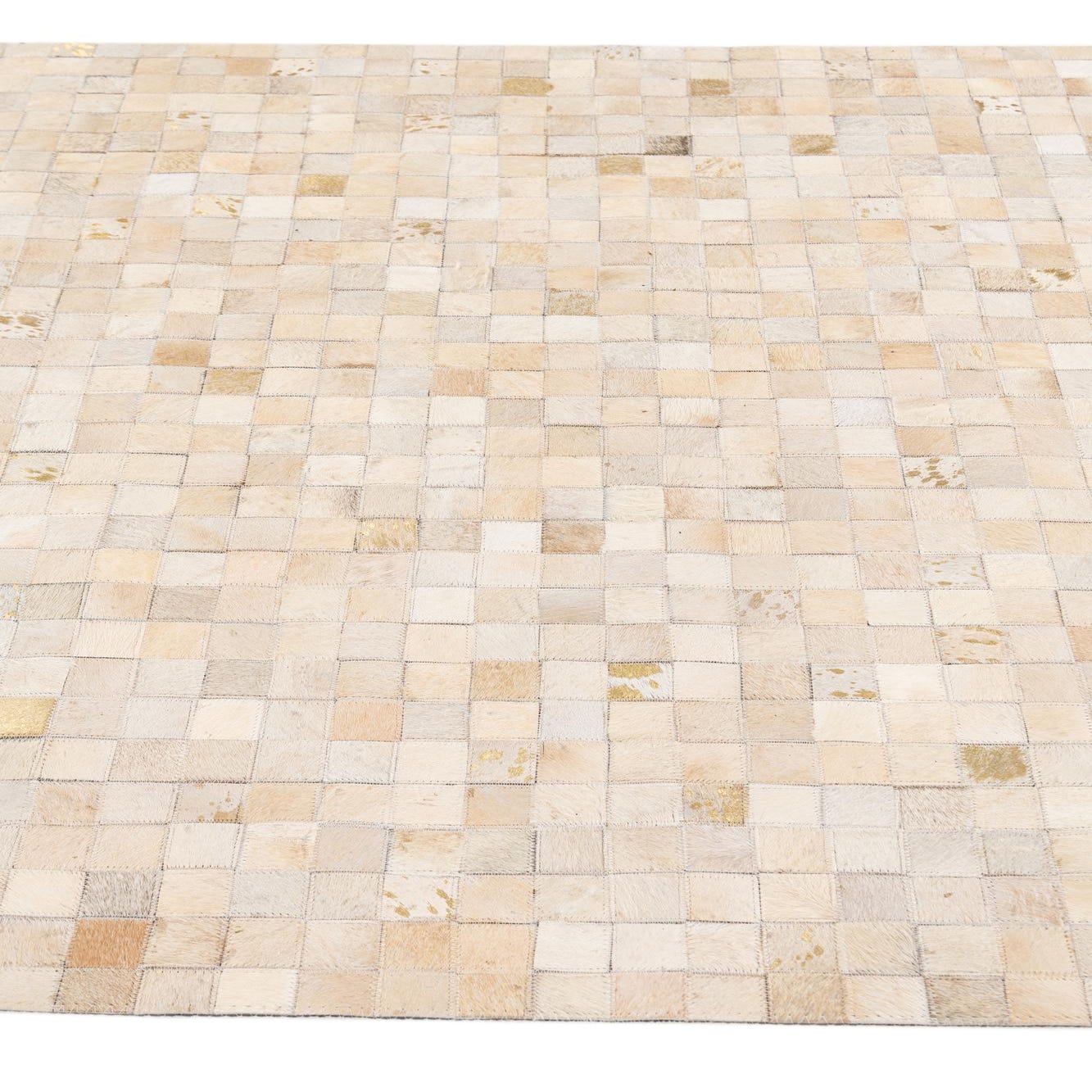 A 4x6 rectangular modern rug made from ivory and cream cowhide and leather patches, perfect for a living room.